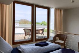 2. OG: Schlafbereich mit Doppelbett, sonnige Dachterrasse, Meerblick