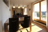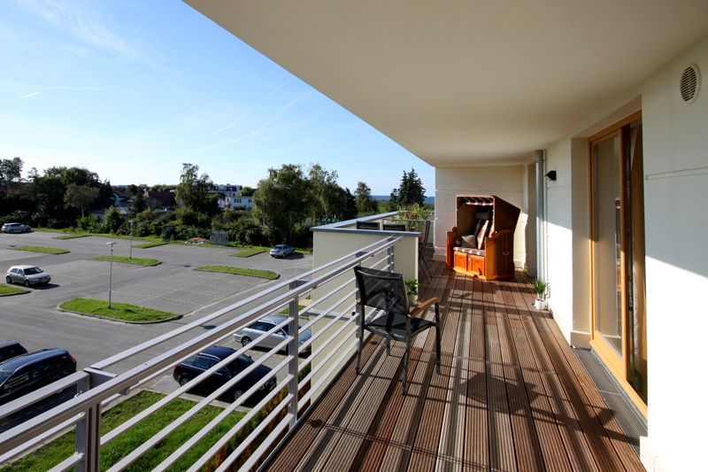 Auf der West gelegenen Dachterrasse können Sie die Sonne von morgens bis abends genießen. Der zusätzliche, seitliche Blick auf die Ostsee vom Strandkorb verspricht einen erholsamen Urlaub. Ergänzt wird die Balkonaustattung von einem Tisch mit vier Stühlen.