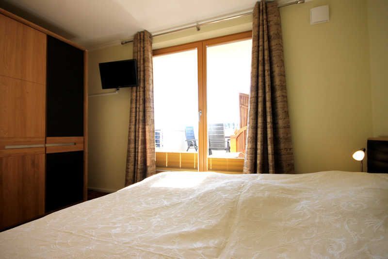 Das Schlafzimmer ist mit einem hochwertigen Doppelbett ausgestattet. Dazu gehören zwei kleine Nachttische mit Leseleuchten. Die Beleuchtung vom zweitürigen Kleiderschrank kann über einen Funkschalter bedient werden. Ein 26 Zoll großer Flachbildfernseher steht ebenfalls zur Verfügung. Verdunklungsplissee und zusätzlich installierte geschmackvolle Gardinen garantieren eine erholsame Nachtruhe. Sie gelangen vom Schlafzimmer ebenso wie auch vom Wohnzimmer auf die großzügige Dachterrasse.