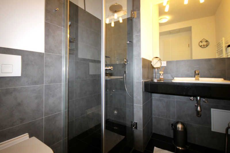 Das moderne Duschbad bietet Ihnen eine große bodengleiche Dusche mit Regenbrause. Außerdem ist es mit einer Fußbodenheizung, einem Waschtisch inklusive Spiegel, einem Haartrockner und einem Kosmetikspiegel ausgestattet.