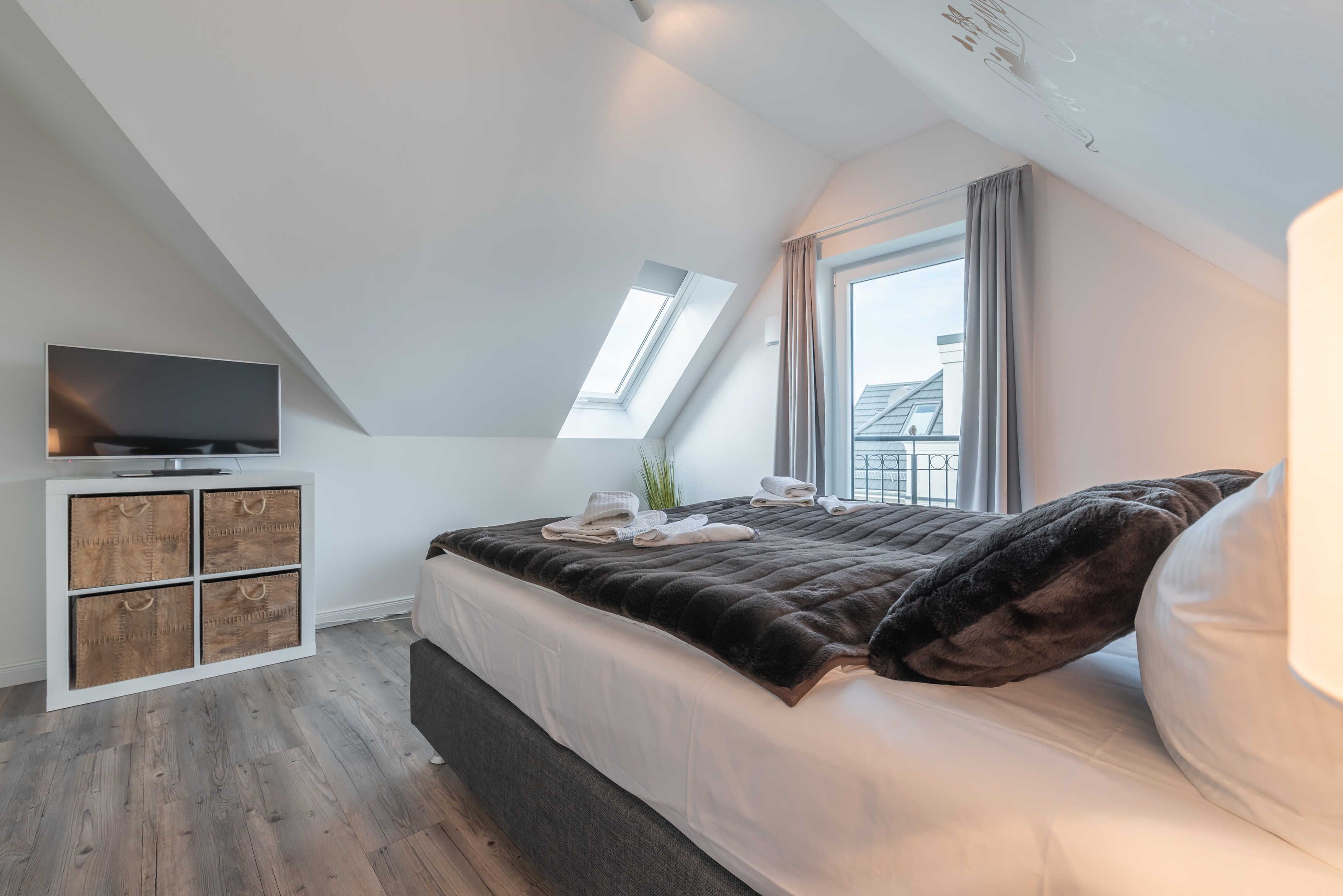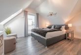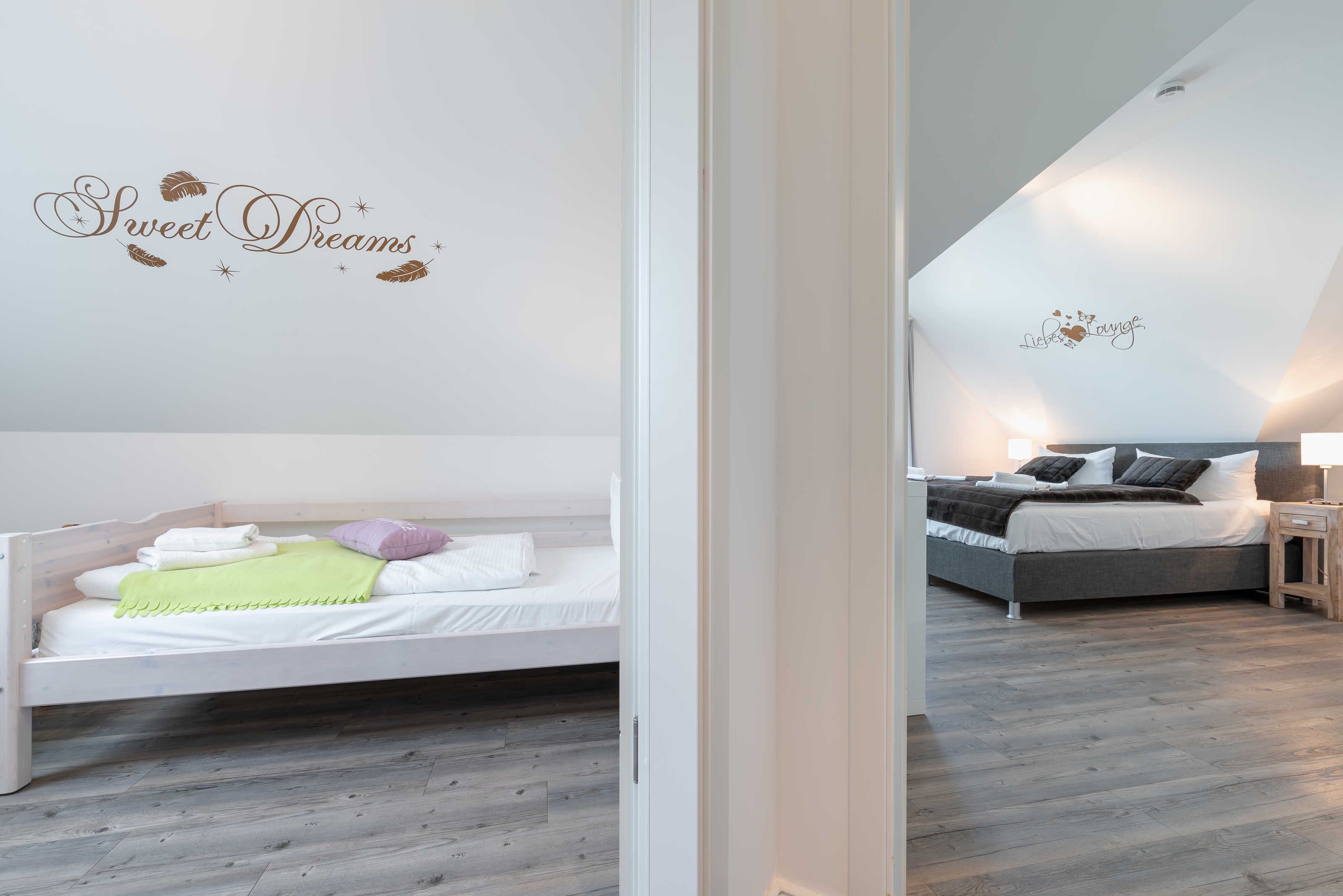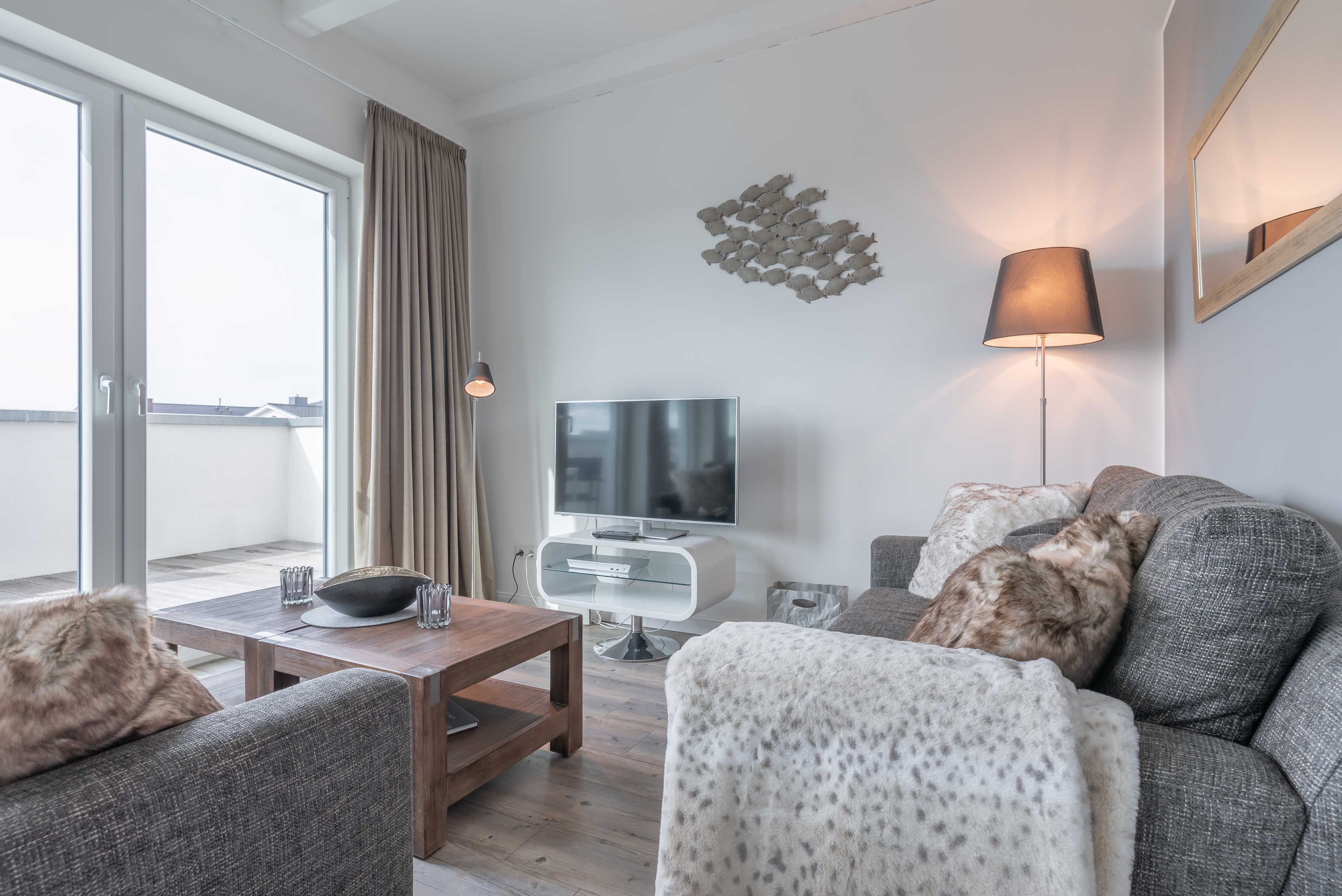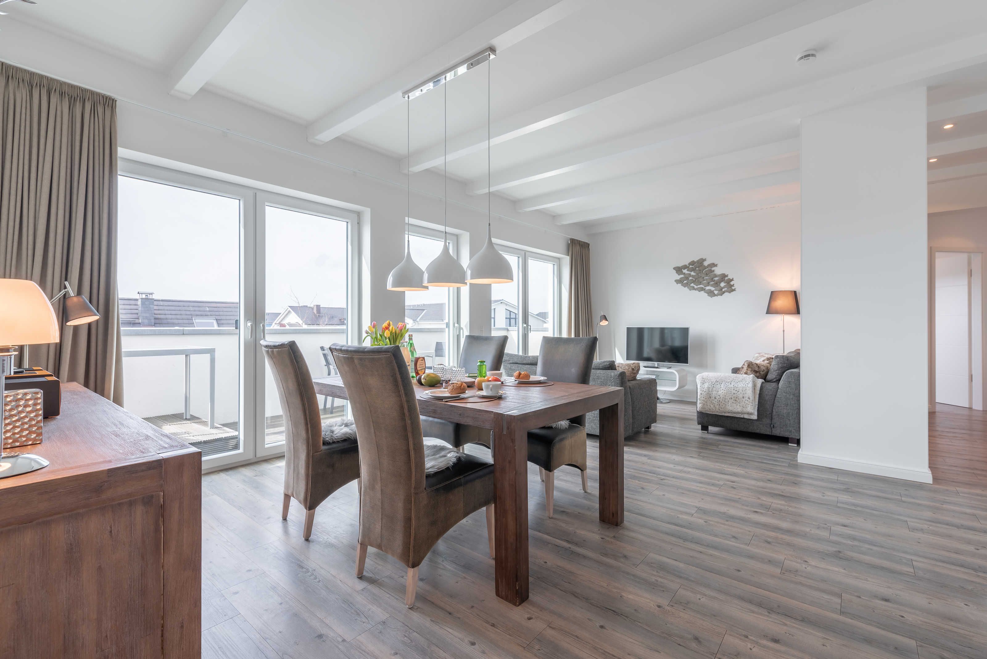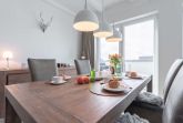 Die modern und großzügig eingerichtete sonnige 3-Zimmer-Wohnung befindet sich im Dachgeschoss der Residenz Seestern. Im Wohnraum finden Sie eine zweiteilige hochwertige Couchgarnitur zum Relaxen. Zur Unterhaltung stehen Ihnen ein großer Flachbild TV, eine Hifi Anlage bluetoothfähig, einem BluRay-Player sowie DVD´s, CD´s und eine Spielesammlung zur Verfügung. Der offene Essbereich verfügt über einen großen Tisch mit vier Stühlen. Die separate großzügige Küche ist mit einer modernen Einbauküche mit Geschirrspüler, Kühlschrank mit Gefrierfach, Backofen mit Cerankochfeld und Mikrowelle ausgestattet. Neben Kaffeemaschine, Wasserkocher und Toaster ist auch eine Tchibo - Cafissimo Kapselmaschine vorhanden. Das modern eingerichtete Schlafzimmer mit dem großzügigen Boxspringbett (2,00 m x 1,80 m) verfügt ebenso über einen große Flachbild TV, einen geräumigen Schrank und eine Kommode. Sie haben direkten Zugang zum großzügigen Duschbad. Im zweiten Schlafzimmer stehen zwei Einzelbetten (2,00 m x 0,90 m) sowie ein kleiner Schrank. Das zweite Duschbad ist vom Flur aus zu betreten. Beide Duschbäder haben eine bodengleiche Dusche und einen großen Waschtisch mit Spiegel. Es gibt außerdem eine große Abstellkammer für Koffer und Taschen. Der große Süd-Balkon lädt zum Verweilen ein. Es erwartet Sie ein großer Esstisch mit vier Stühlen und Lounge-Möbeln zum Relaxen. Von beiden Balkonen können Sie den weiten Blick auf das Meer genießen.