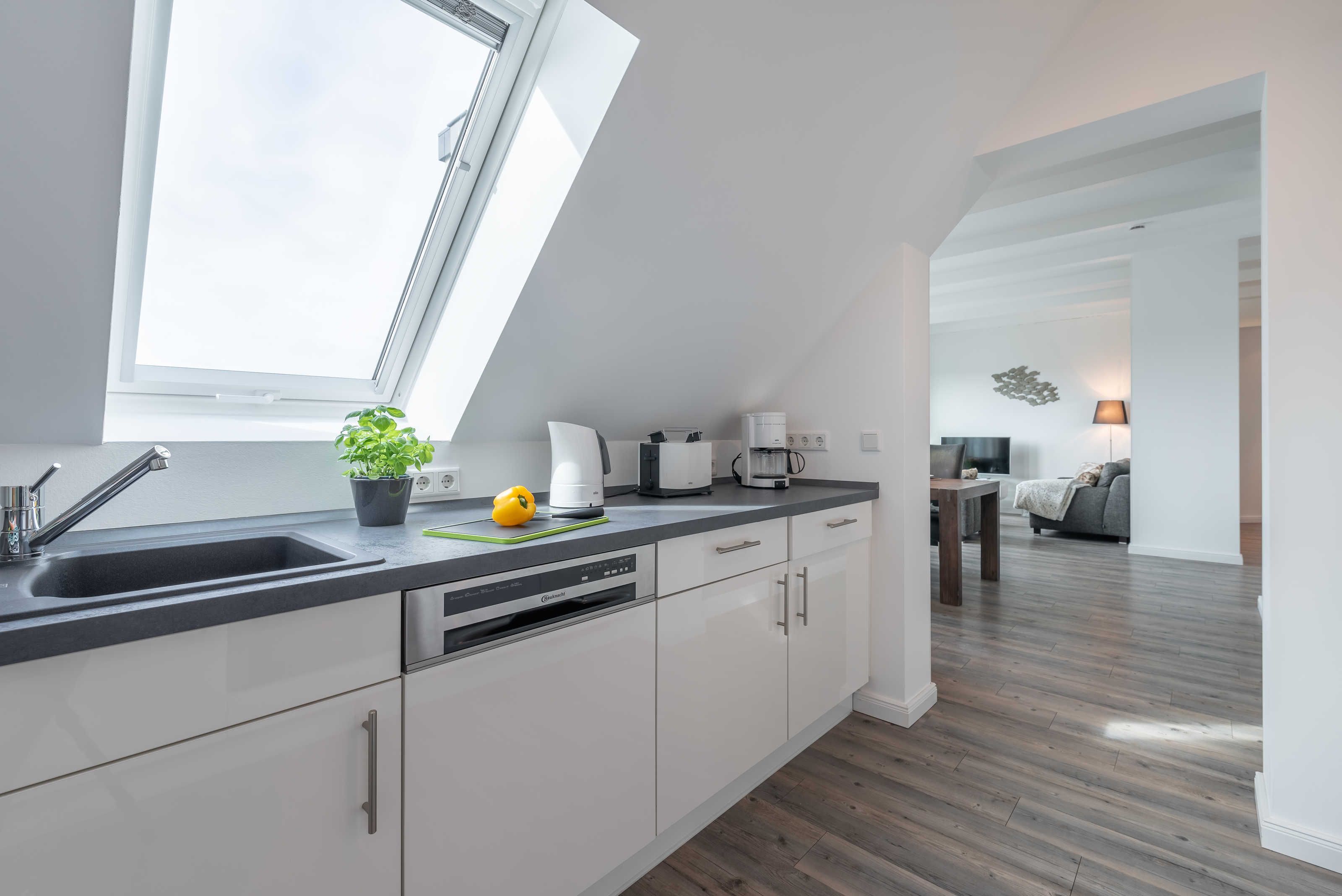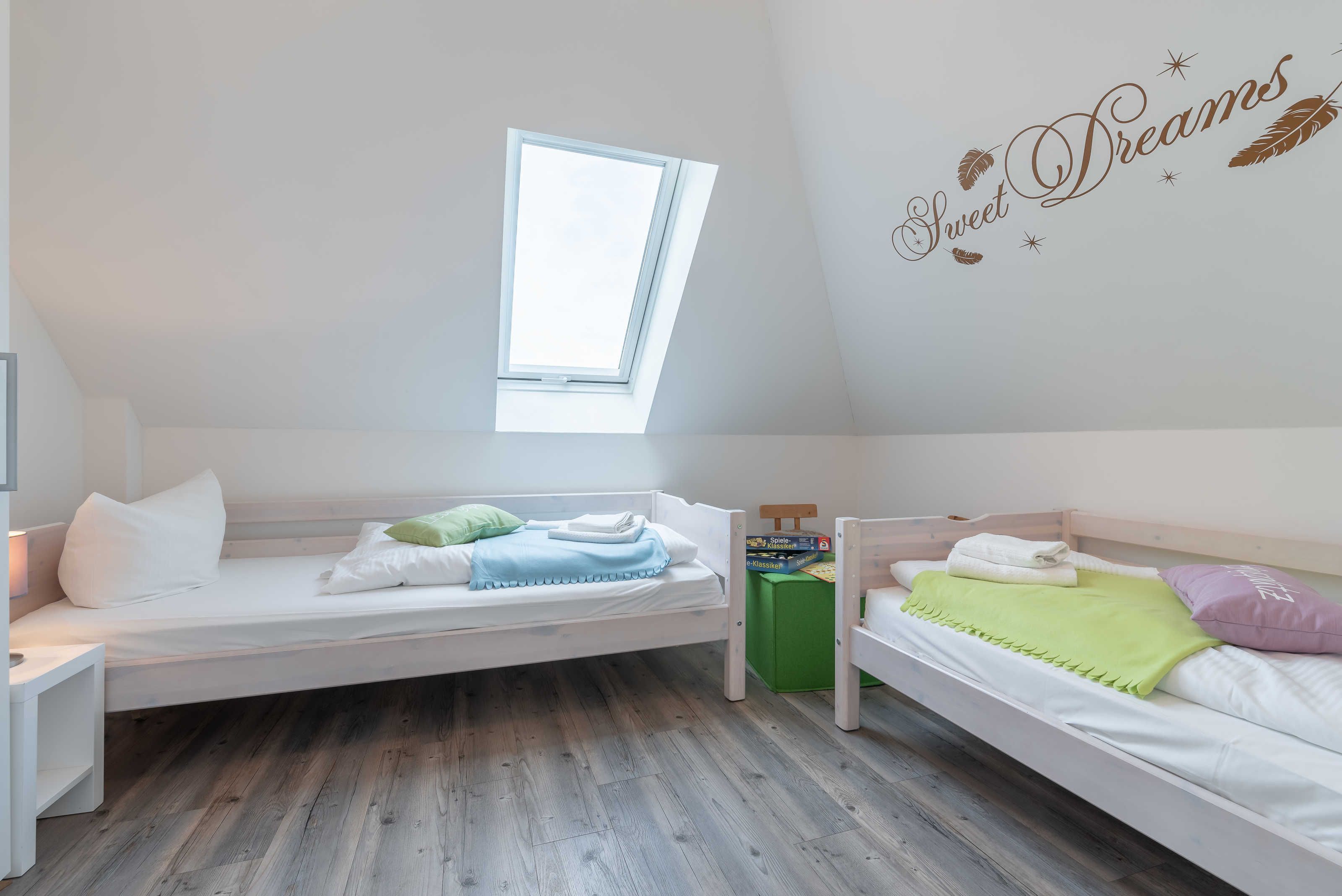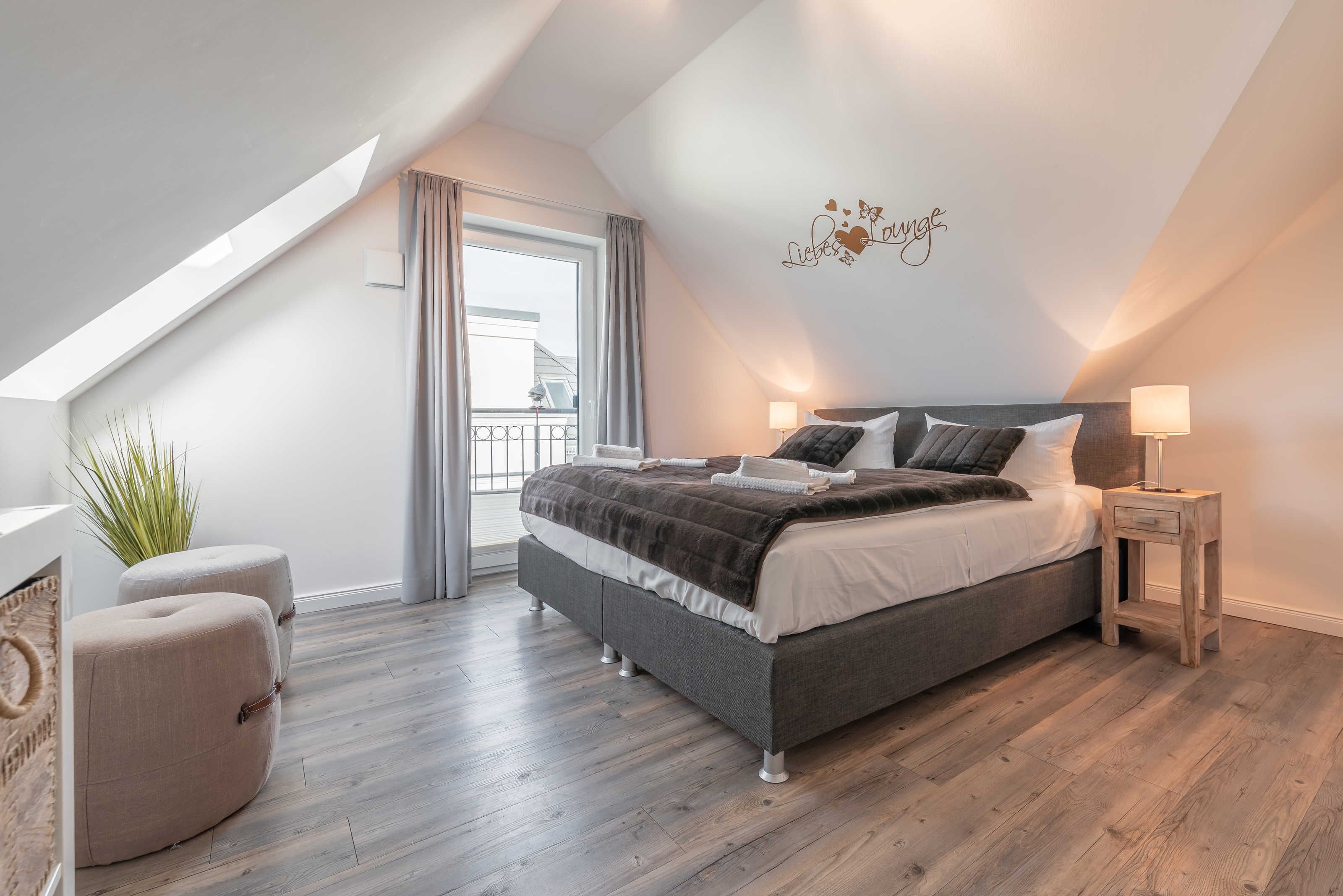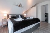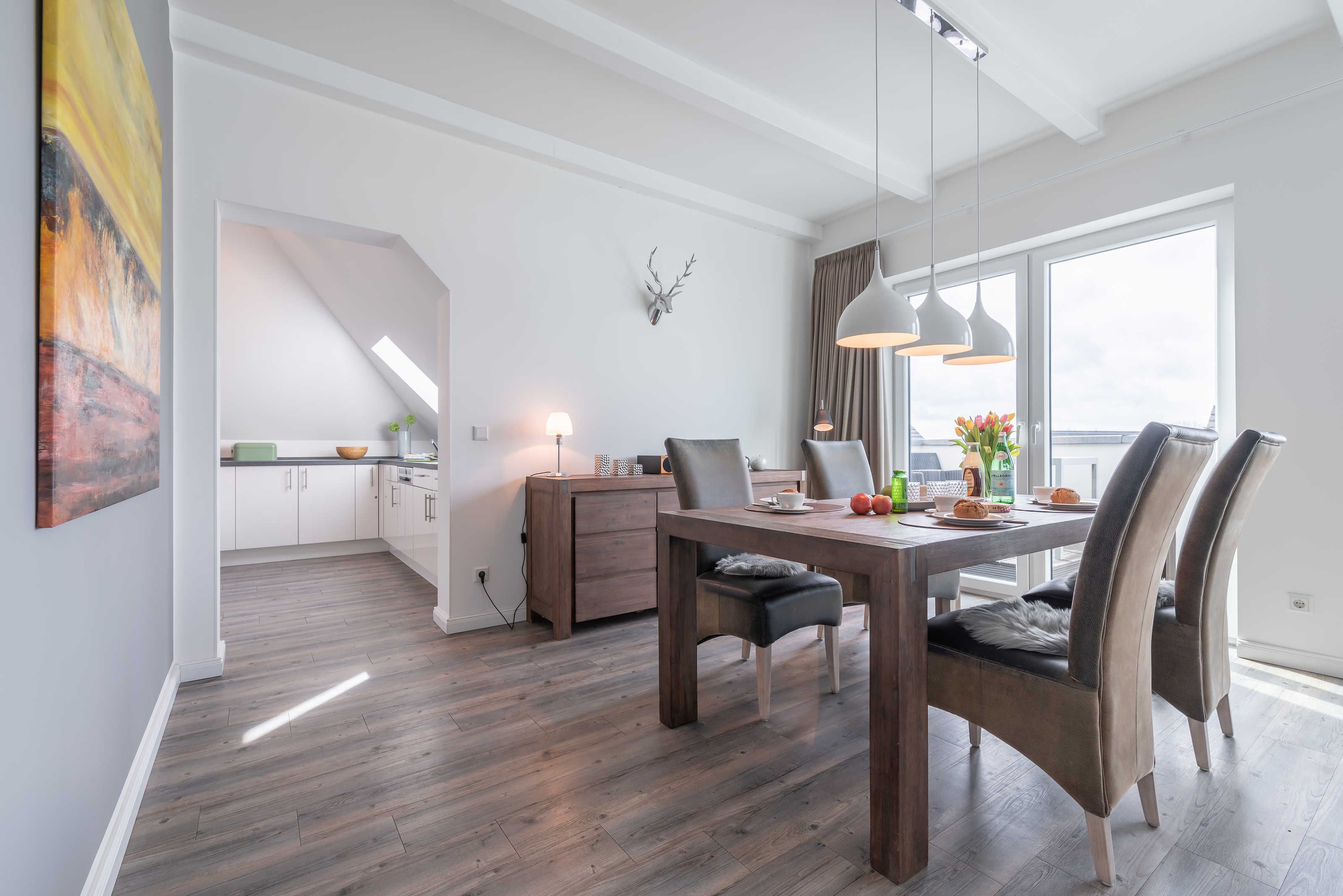 Die modern und großzügig eingerichtete sonnige 3-Zimmer-Wohnung befindet sich im Dachgeschoss der Residenz Seestern. Im Wohnraum finden Sie eine zweiteilige hochwertige Couchgarnitur zum Relaxen. Zur Unterhaltung stehen Ihnen ein großer Flachbild TV, eine Hifi Anlage bluetoothfähig, einem BluRay-Player sowie DVD´s, CD´s und eine Spielesammlung zur Verfügung. Der offene Essbereich verfügt über einen großen Tisch mit vier Stühlen. Die separate großzügige Küche ist mit einer modernen Einbauküche mit Geschirrspüler, Kühlschrank mit Gefrierfach, Backofen mit Cerankochfeld und Mikrowelle ausgestattet. Neben Kaffeemaschine, Wasserkocher und Toaster ist auch eine Tchibo - Cafissimo Kapselmaschine vorhanden. Das modern eingerichtete Schlafzimmer mit dem großzügigen Boxspringbett (2,00 m x 1,80 m) verfügt ebenso über einen große Flachbild TV, einen geräumigen Schrank und eine Kommode. Sie haben direkten Zugang zum großzügigen Duschbad. Im zweiten Schlafzimmer stehen zwei Einzelbetten (2,00 m x 0,90 m) sowie ein kleiner Schrank. Das zweite Duschbad ist vom Flur aus zu betreten. Beide Duschbäder haben eine bodengleiche Dusche und einen großen Waschtisch mit Spiegel. Es gibt außerdem eine große Abstellkammer für Koffer und Taschen. Der große Süd-Balkon lädt zum Verweilen ein. Es erwartet Sie ein großer Esstisch mit vier Stühlen und Lounge-Möbeln zum Relaxen. Von beiden Balkonen können Sie den weiten Blick auf das Meer genießen.