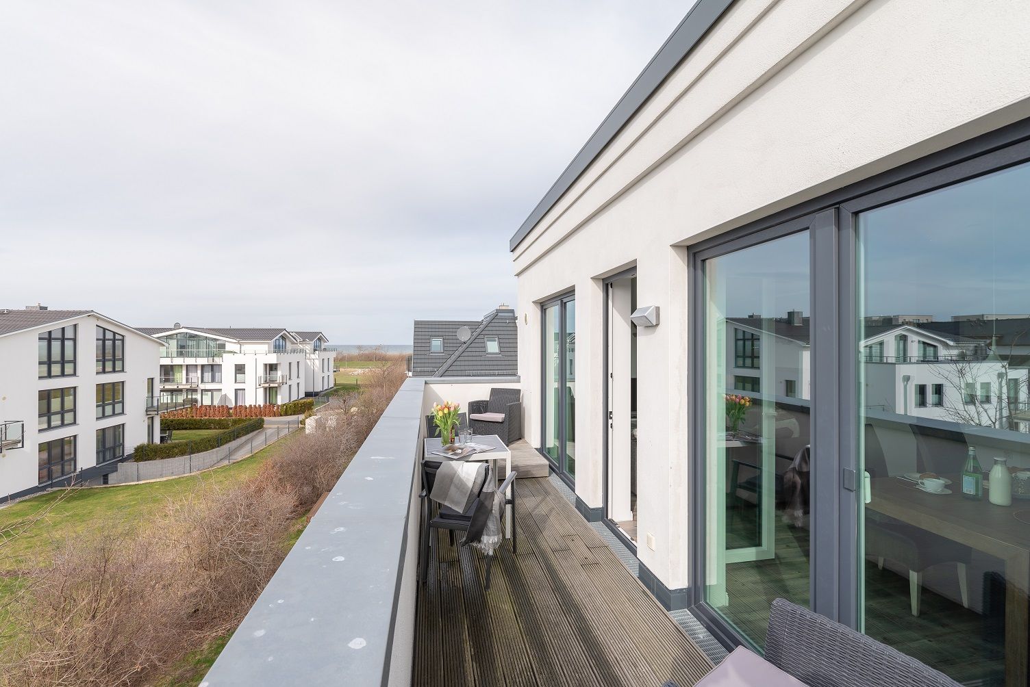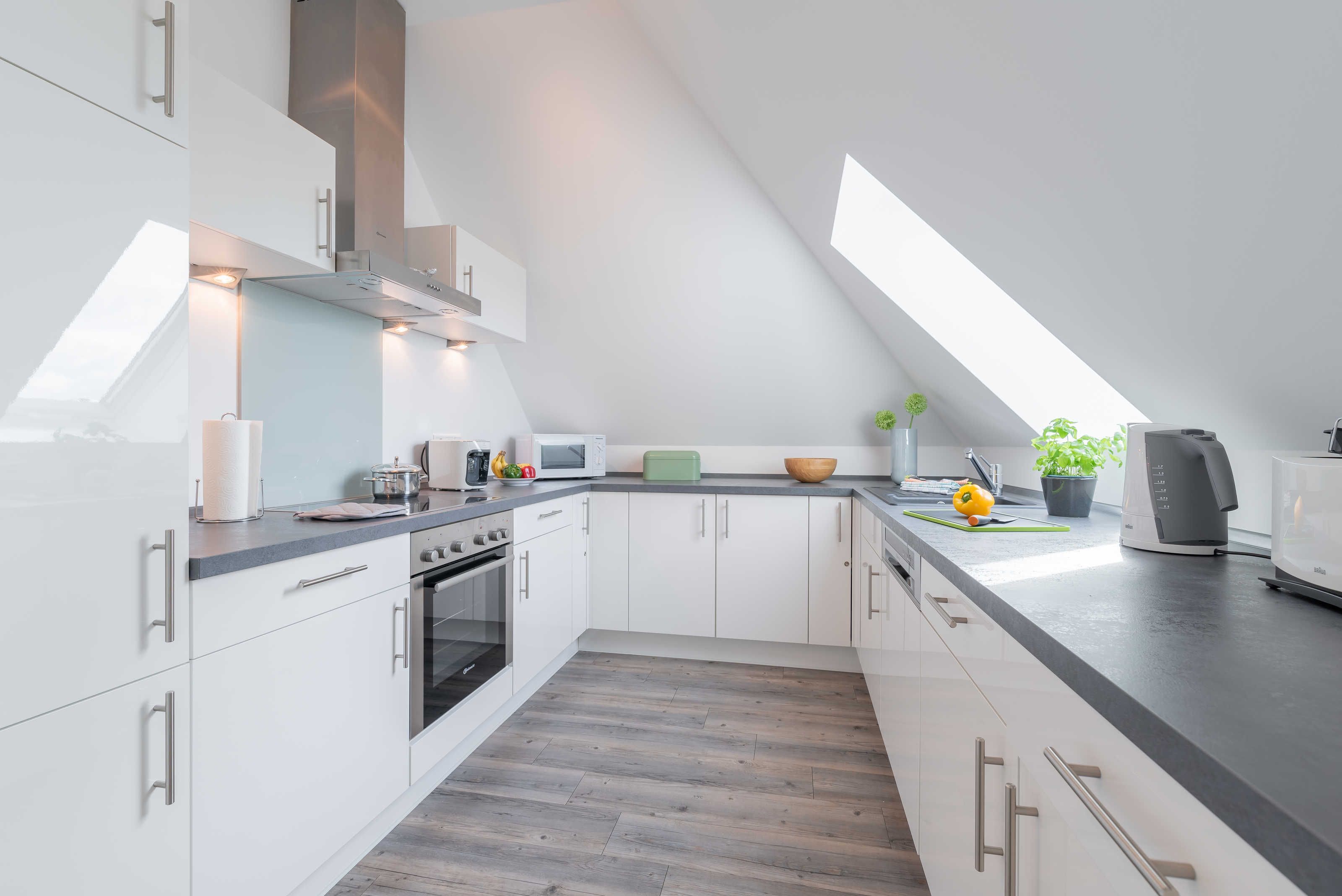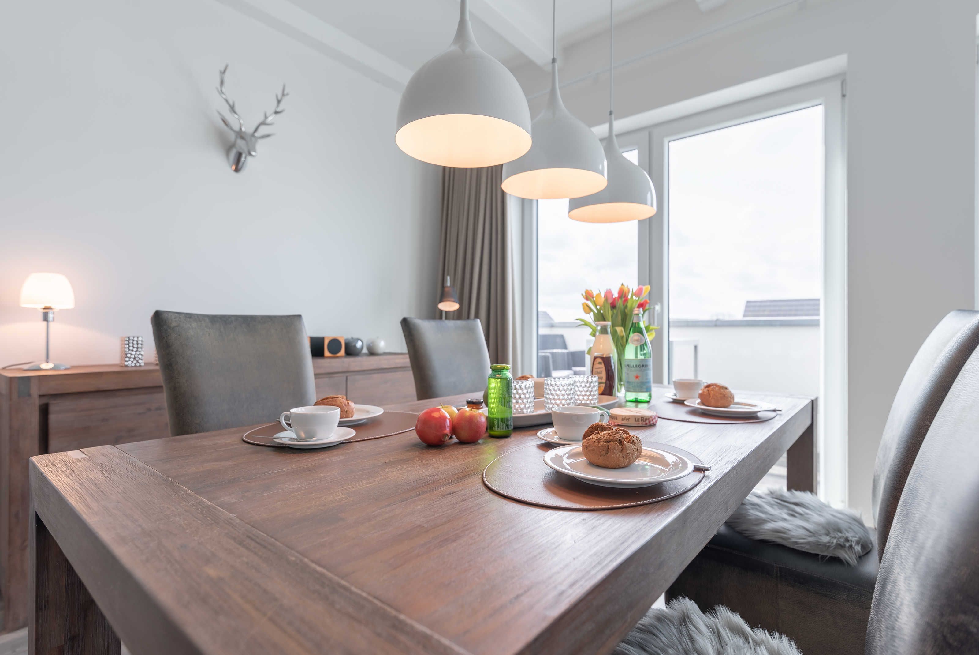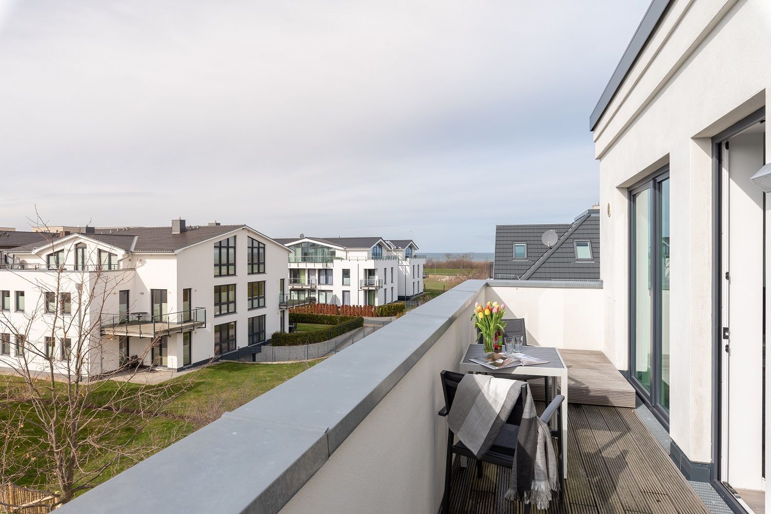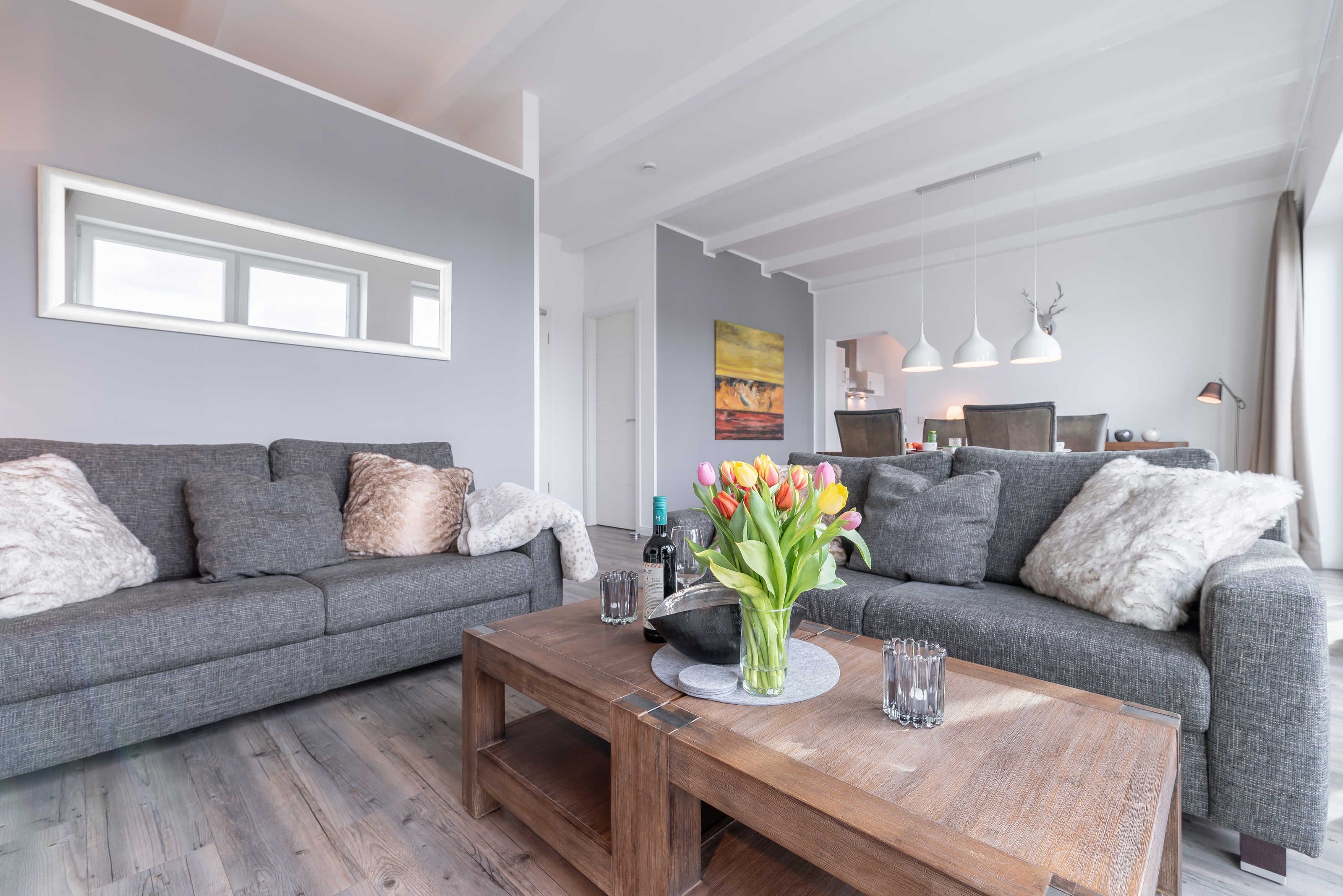 Die modern und großzügig eingerichtete sonnige 3-Zimmer-Wohnung befindet sich im Dachgeschoss der Residenz Seestern. Im Wohnraum finden Sie eine zweiteilige hochwertige Couchgarnitur zum Relaxen. Zur Unterhaltung stehen Ihnen ein großer Flachbild TV, eine Hifi Anlage bluetoothfähig, einem BluRay-Player sowie DVD´s, CD´s und eine Spielesammlung zur Verfügung. Der offene Essbereich verfügt über einen großen Tisch mit vier Stühlen. Die separate großzügige Küche ist mit einer modernen Einbauküche mit Geschirrspüler, Kühlschrank mit Gefrierfach, Backofen mit Cerankochfeld und Mikrowelle ausgestattet. Neben Kaffeemaschine, Wasserkocher und Toaster ist auch eine Tchibo - Cafissimo Kapselmaschine vorhanden. Das modern eingerichtete Schlafzimmer mit dem großzügigen Boxspringbett (2,00 m x 1,80 m) verfügt ebenso über einen große Flachbild TV, einen geräumigen Schrank und eine Kommode. Sie haben direkten Zugang zum großzügigen Duschbad. Im zweiten Schlafzimmer stehen zwei Einzelbetten (2,00 m x 0,90 m) sowie ein kleiner Schrank. Das zweite Duschbad ist vom Flur aus zu betreten. Beide Duschbäder haben eine bodengleiche Dusche und einen großen Waschtisch mit Spiegel. Es gibt außerdem eine große Abstellkammer für Koffer und Taschen. Der große Süd-Balkon lädt zum Verweilen ein. Es erwartet Sie ein großer Esstisch mit vier Stühlen und Lounge-Möbeln zum Relaxen. Von beiden Balkonen können Sie den weiten Blick auf das Meer genießen.