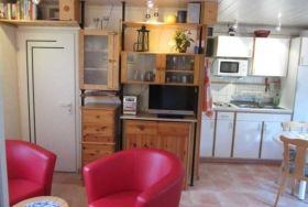 Pantryküche mit Herd, Wasserkocher, Toaster, Eierkocher, Gläser, Geschirr, Besteck, Mikrowelle, Kaffeemaschine, Kühlschrank, Staubsauger, HD-TV + Kabel, Radio mit CD-Player, Kinderreisebett + Hochstuhl