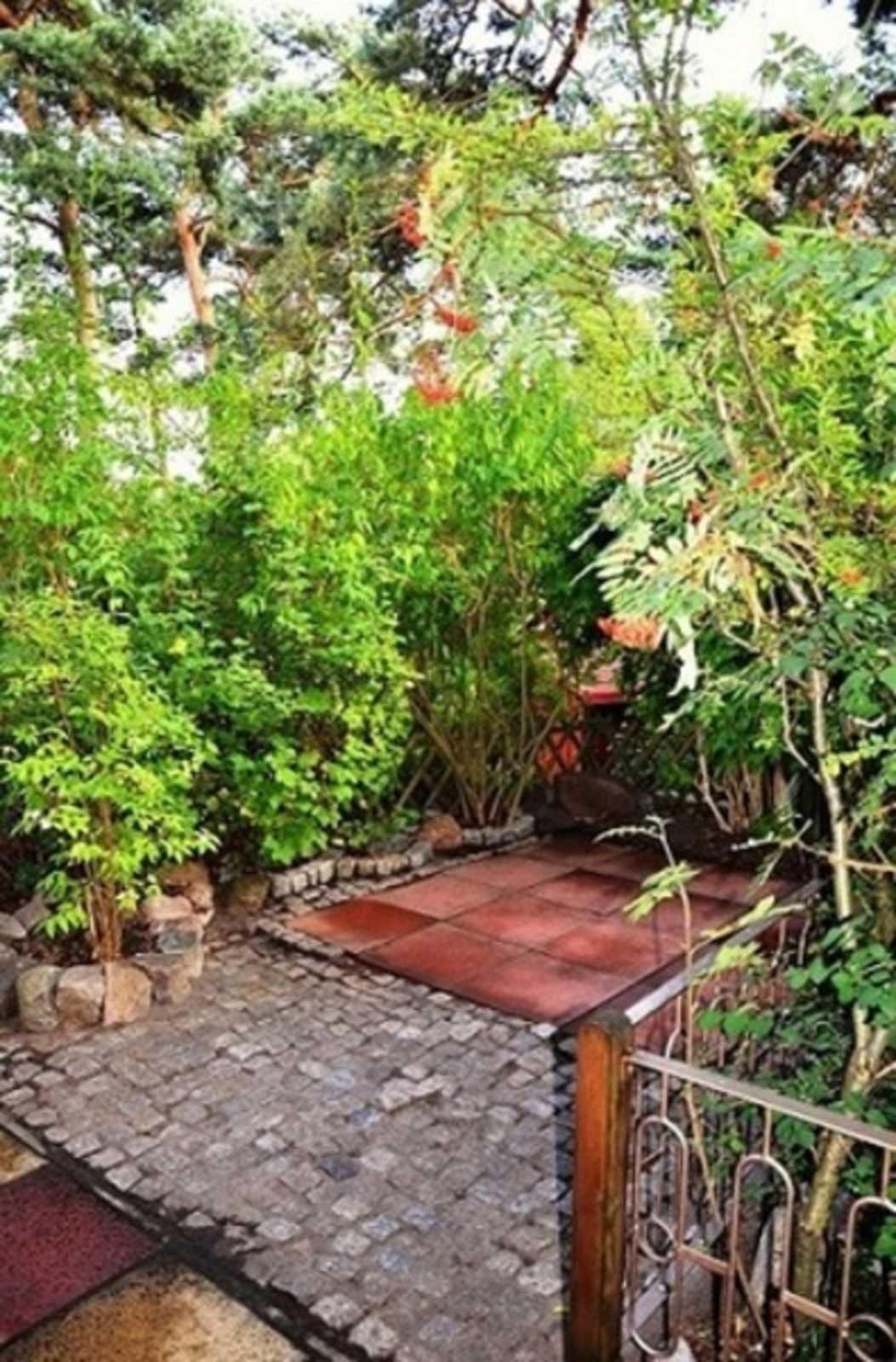 1 überdachte Terrasse mit Gartenmöbeln und kleinem Garten