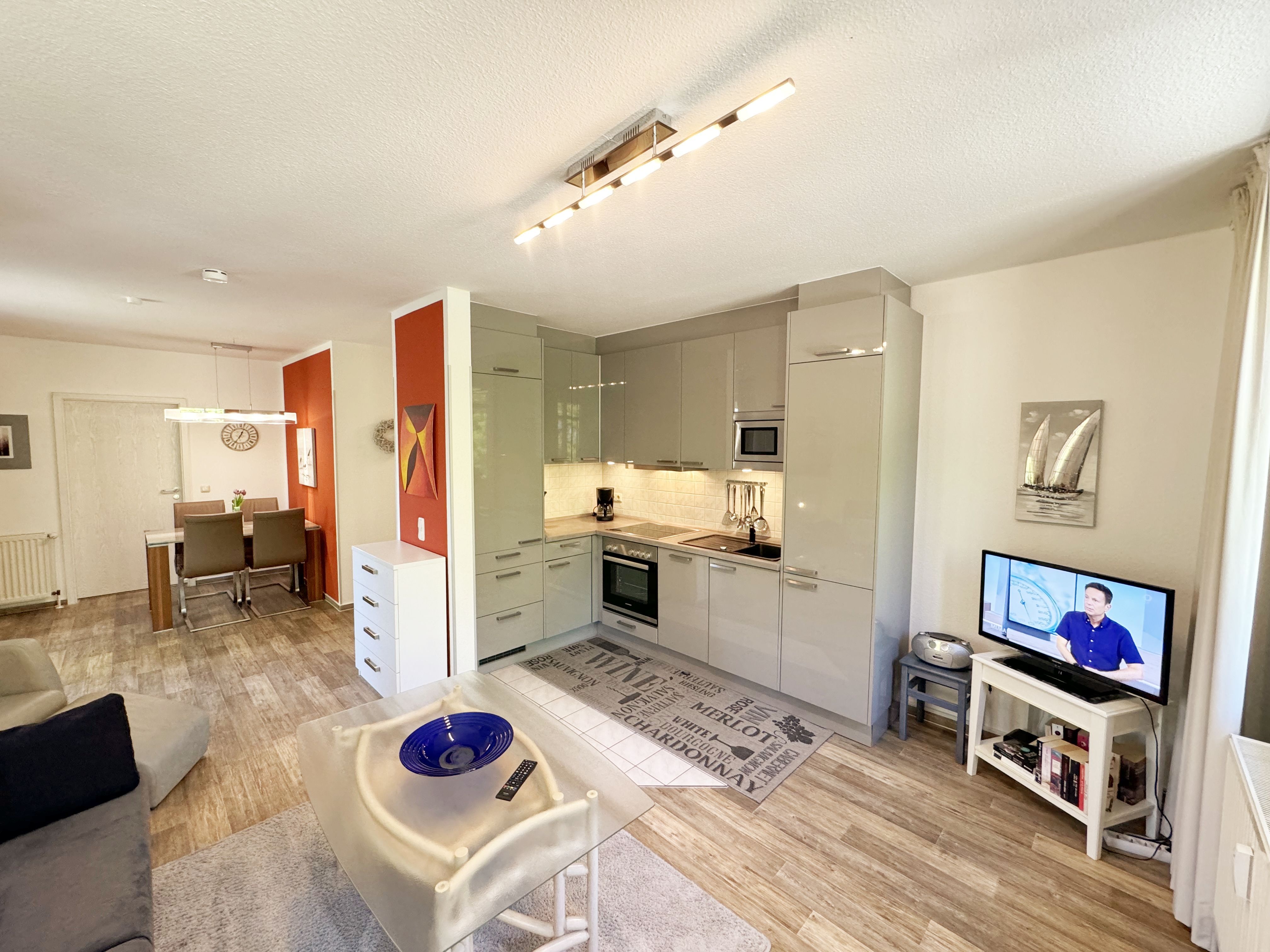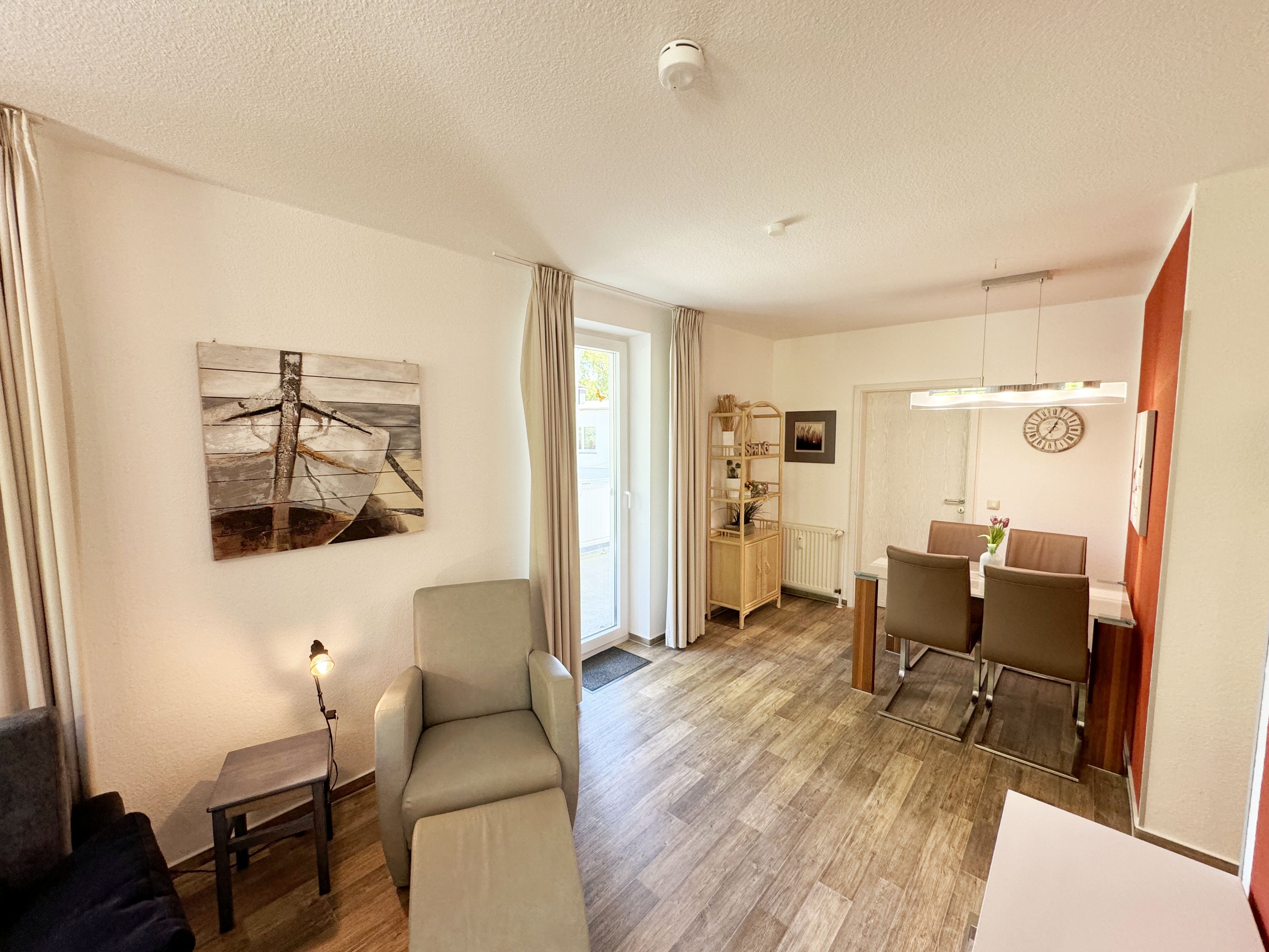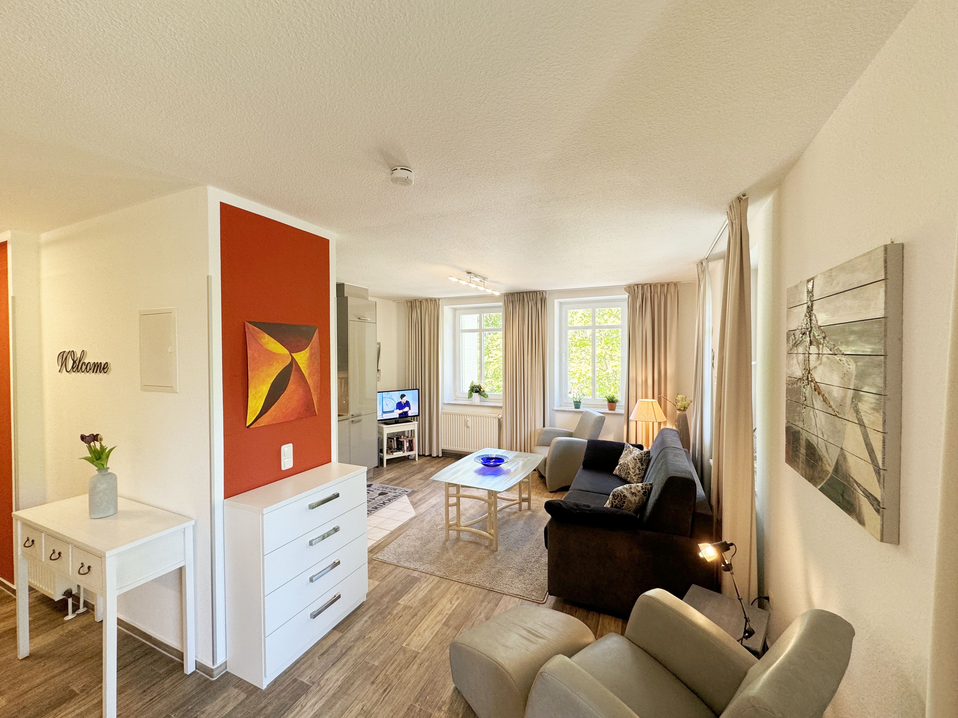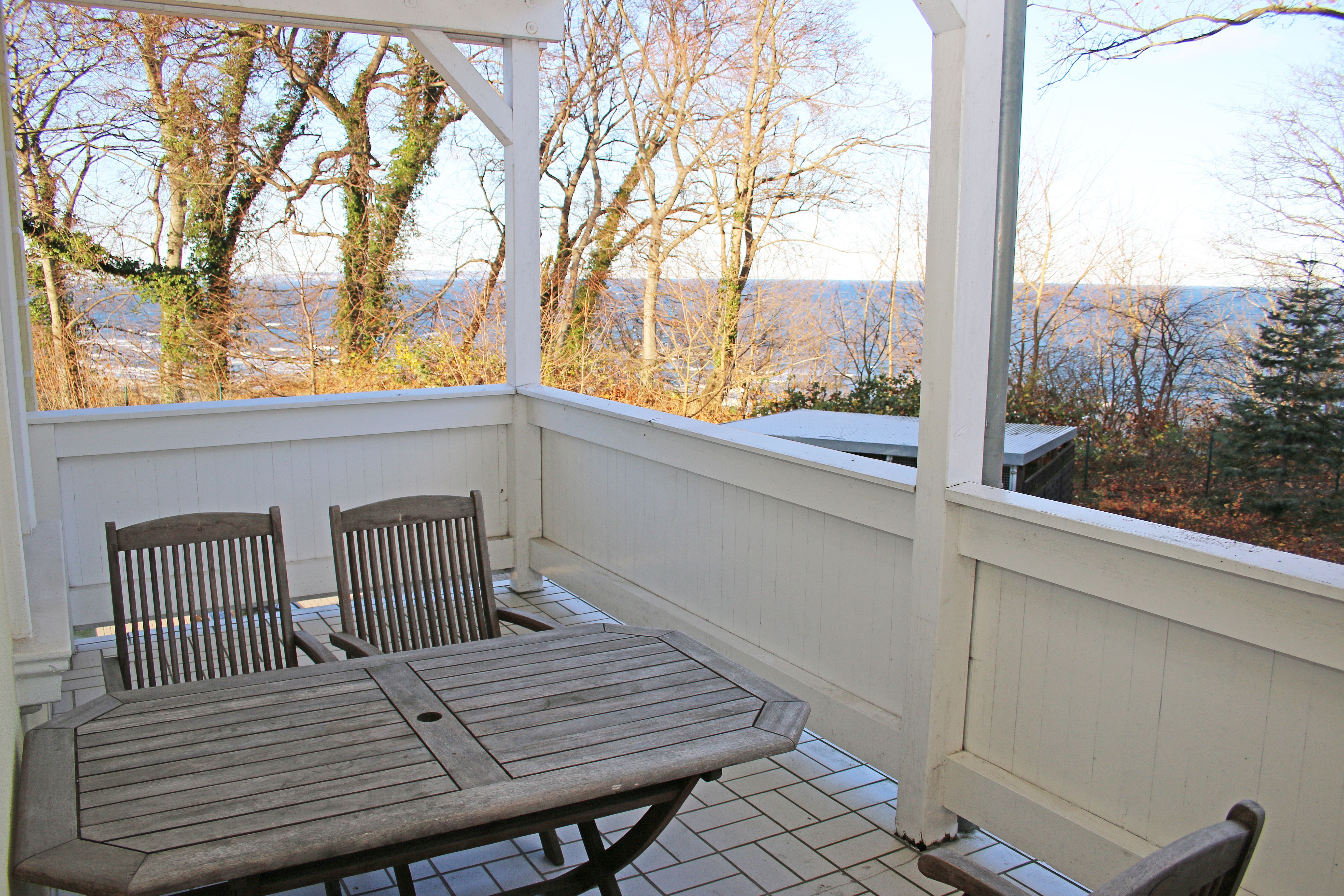Die 2-Raumferienwohnung ist als Nichtraucher deklariert und befindet sich im 1. Obergeschoss des Hauses. Mit Ihren ca. 60 qm Wohnfläche bietet Sie ausreichend Platz für 2 - 4 Personen. Die Ferienwohnung ist komfortabel und geschmackvoll eingerichtet. Der Wohnbereich verfügt über eine Couchecke mit Ausziehfunktion (Aufbettung 3. und 4. Person, 1,80m x 2,00m), Couchtisch und Sideboard, Leselampe, mit Smart-TV, Radio + CD-Player. Die angrenzende Küchenzeile mit Esstisch ist komplett ausgestattet mit Geschirrspüler, Backofen mit 4-Zonen-Ceranfeld, Mikrowelle, Kühlschrank mit Eisfach, Kaffeemaschine, Toaster, Wasserkocher sowie diversen Küchenutensilien. Das Badezimmer umfasst eine Dusche, WC, Fön und Waschtisch. Das separate Schlafzimmer mit einem Doppelbett (0,90 x 1,80 m) mit Nachtischkonsolen und geräumigen Kleiderschrank rundet die Ferienwohnung ab. Zu den Highlights der Wohnung gehören der große überdachte Balkon und der traumhafte Blick auf die Steilküste und das Meer (im Sommer eingeschränkt durch die Blätter des alten Baumbestandes am Hang). Auch in Ihrem Urlaub brauchen Sie auf einen Internetzugang (WLAN) nicht verzichten, dieser ist vorhanden und inklusive. Ein PKW-Stellplatz ist direkt vor dem Haus. Ihre mitgebrachten oder auch vor Ort geliehenen Fahrräder können Sie im Abstellraum unterstellen. Haustiere sind in der Wohnung nicht erlaubt. Die Erstausstattung eines Wäschepaketes (komplette Bettwäsche, 1 Duschhandtuch, 1 kleines Handtuch) können Sie bis 14 Tage vor Anreise gegen einen Aufpreis dazu buchen oder durch eigene ergänzen. Ab 2 gebuchten Paketen erhalten Sie einmalig 1 Geschirrhandtuch und 1 Duschvorleger hinzu.