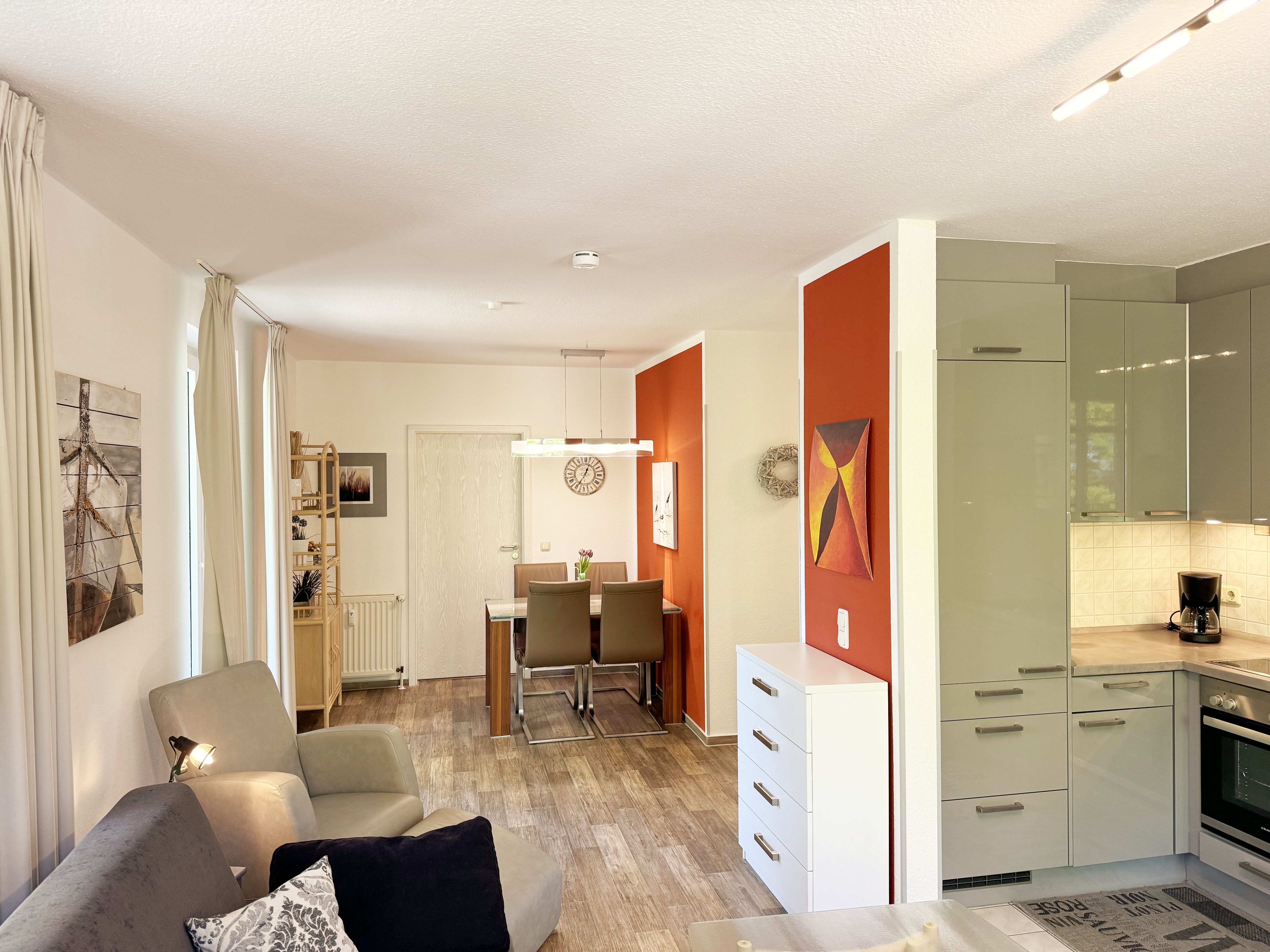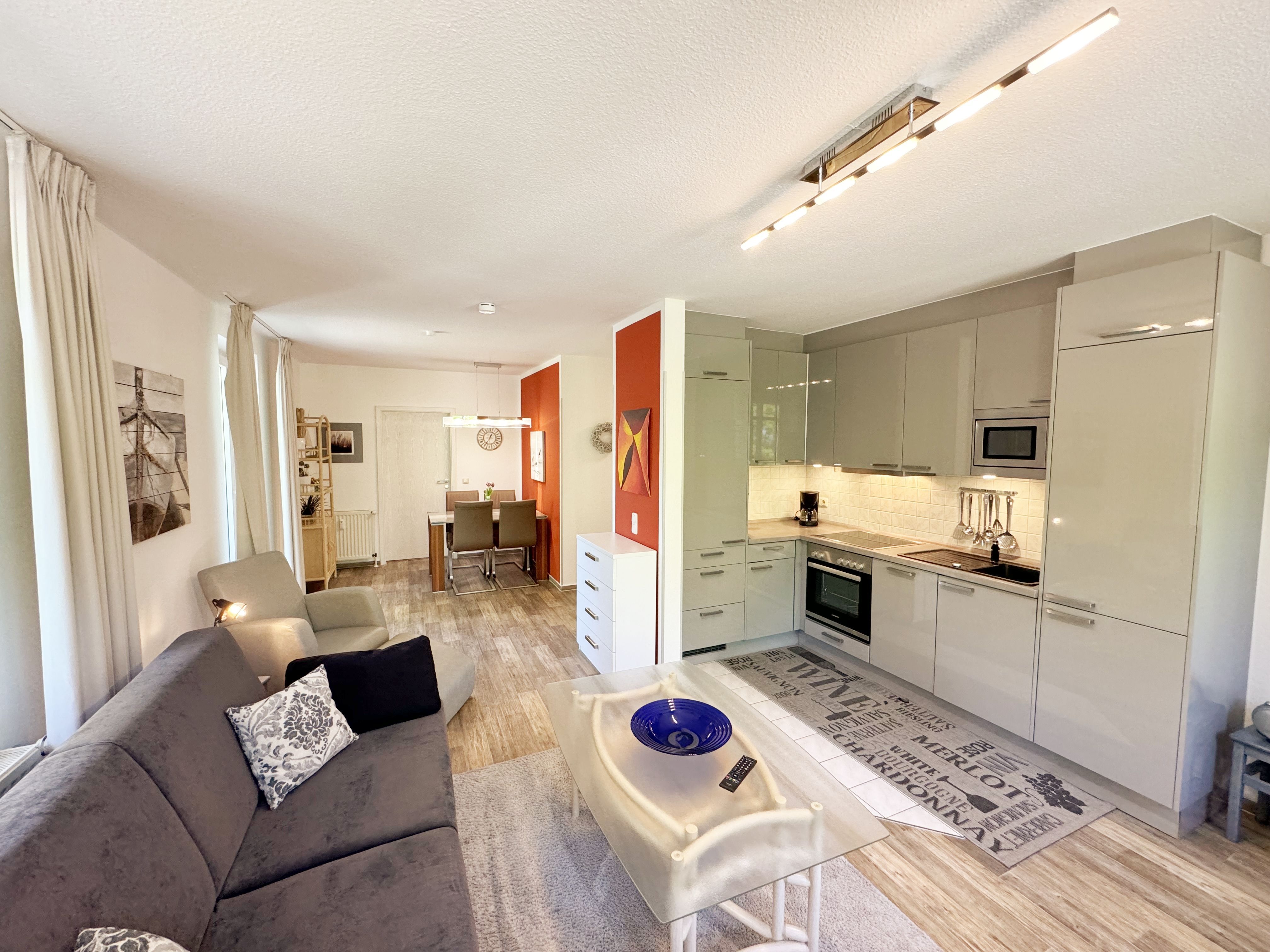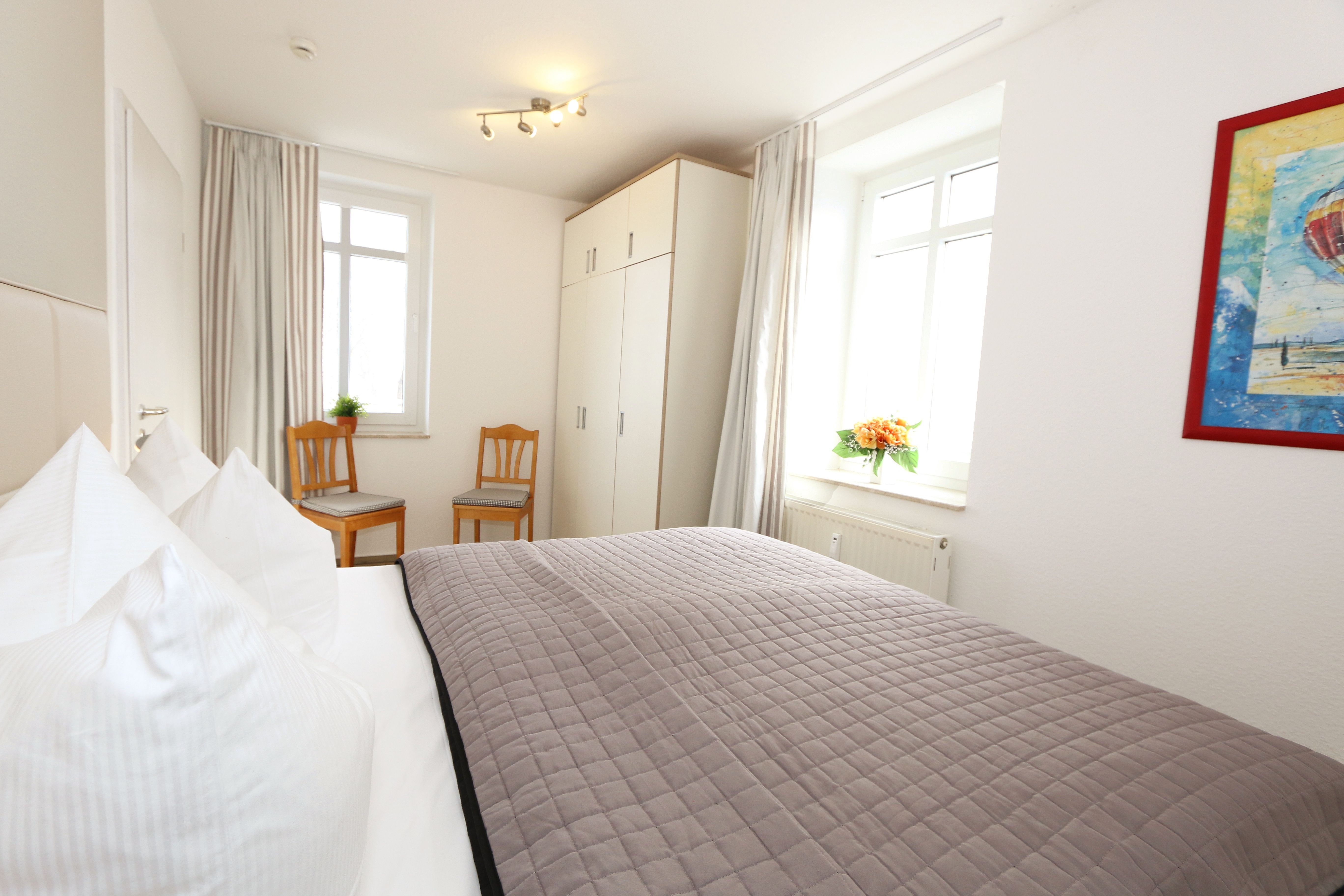 Die 2-Raumferienwohnung ist als Nichtraucher deklariert und befindet sich im 1. Obergeschoss des Hauses. Mit Ihren ca. 60 qm Wohnfläche bietet Sie ausreichend Platz für 2 - 4 Personen. Die Ferienwohnung ist komfortabel und geschmackvoll eingerichtet. Der Wohnbereich verfügt über eine Couchecke mit Ausziehfunktion (Aufbettung 3. und 4. Person, 1,80m x 2,00m), Couchtisch und Sideboard, Leselampe, mit Smart-TV, Radio + CD-Player. Die angrenzende Küchenzeile mit Esstisch ist komplett ausgestattet mit Geschirrspüler, Backofen mit 4-Zonen-Ceranfeld, Mikrowelle, Kühlschrank mit Eisfach, Kaffeemaschine, Toaster, Wasserkocher sowie diversen Küchenutensilien. Das Badezimmer umfasst eine Dusche, WC, Fön und Waschtisch. Das separate Schlafzimmer mit einem Doppelbett (0,90 x 1,80 m) mit Nachtischkonsolen und geräumigen Kleiderschrank rundet die Ferienwohnung ab. Zu den Highlights der Wohnung gehören der große überdachte Balkon und der traumhafte Blick auf die Steilküste und das Meer (im Sommer eingeschränkt durch die Blätter des alten Baumbestandes am Hang). Auch in Ihrem Urlaub brauchen Sie auf einen Internetzugang (WLAN) nicht verzichten, dieser ist vorhanden und inklusive. Ein PKW-Stellplatz ist direkt vor dem Haus. Ihre mitgebrachten oder auch vor Ort geliehenen Fahrräder können Sie im Abstellraum unterstellen. Haustiere sind in der Wohnung nicht erlaubt. Die Erstausstattung eines Wäschepaketes (komplette Bettwäsche, 1 Duschhandtuch, 1 kleines Handtuch) können Sie bis 14 Tage vor Anreise gegen einen Aufpreis dazu buchen oder durch eigene ergänzen. Ab 2 gebuchten Paketen erhalten Sie einmalig 1 Geschirrhandtuch und 1 Duschvorleger hinzu.