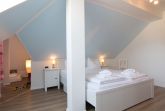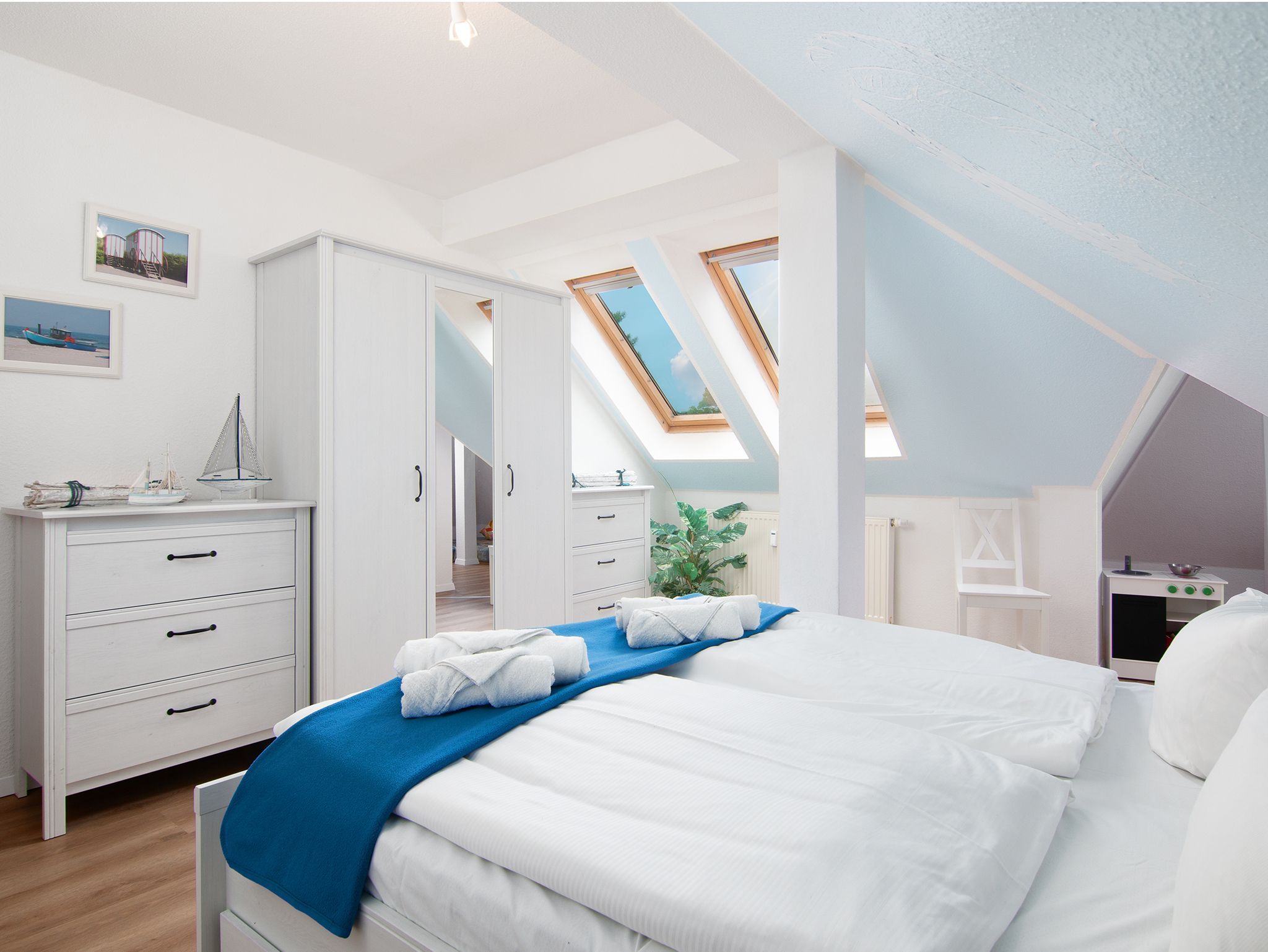 Als Besonderheit verfügt die Ferienwohnung über ein Turmzimmer, welches sich offen an das Schlafzimmer mit Doppelbett anschließt und ideal als Kinderschlafzimmer genutzt werden kann. Hier kann sich Ihr Kind sein eigenes Reich schaffen und ist trotzdem nicht weit weg. Damit Sie nicht zu früh von der Sonne wachgeküsst werden, sind alle Schlafräume sind mit Verdunklungsrollos und Markiesen für den Sonnenschutz ausgestattet.