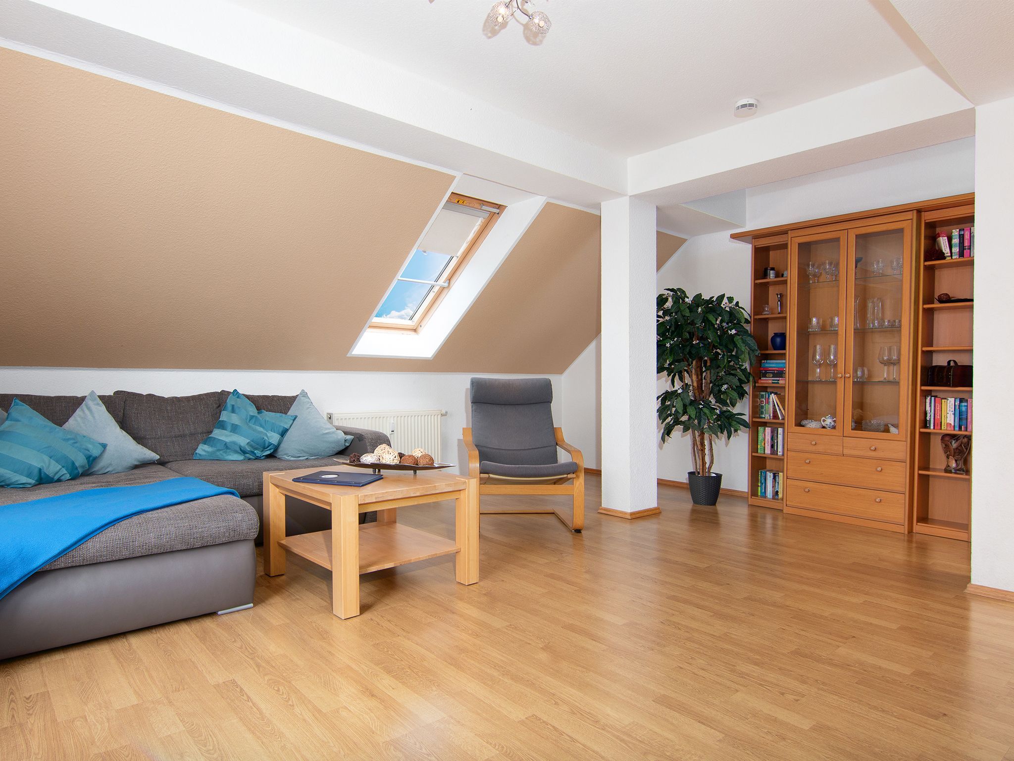 Die Ferienwohnung ist in 2 1/2 Zimmer aufgeteilt. Im großzügigen Wohnzimmer mit großer Couch mit Schlaffunktion und einer Leseecke verbringen Sie die Abende bei einem Spiel auf der Xbox 360 mit Kinect Sensor, einem spannenden Brettspiel oder Sie entspannen mit einer DVD. Natürlich liegen in der Ferienwohnung Spiele für die Xbox, Bettspiele, Bücher für Groß und Klein sowie DVD's für Sie bereit.