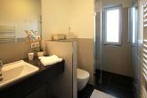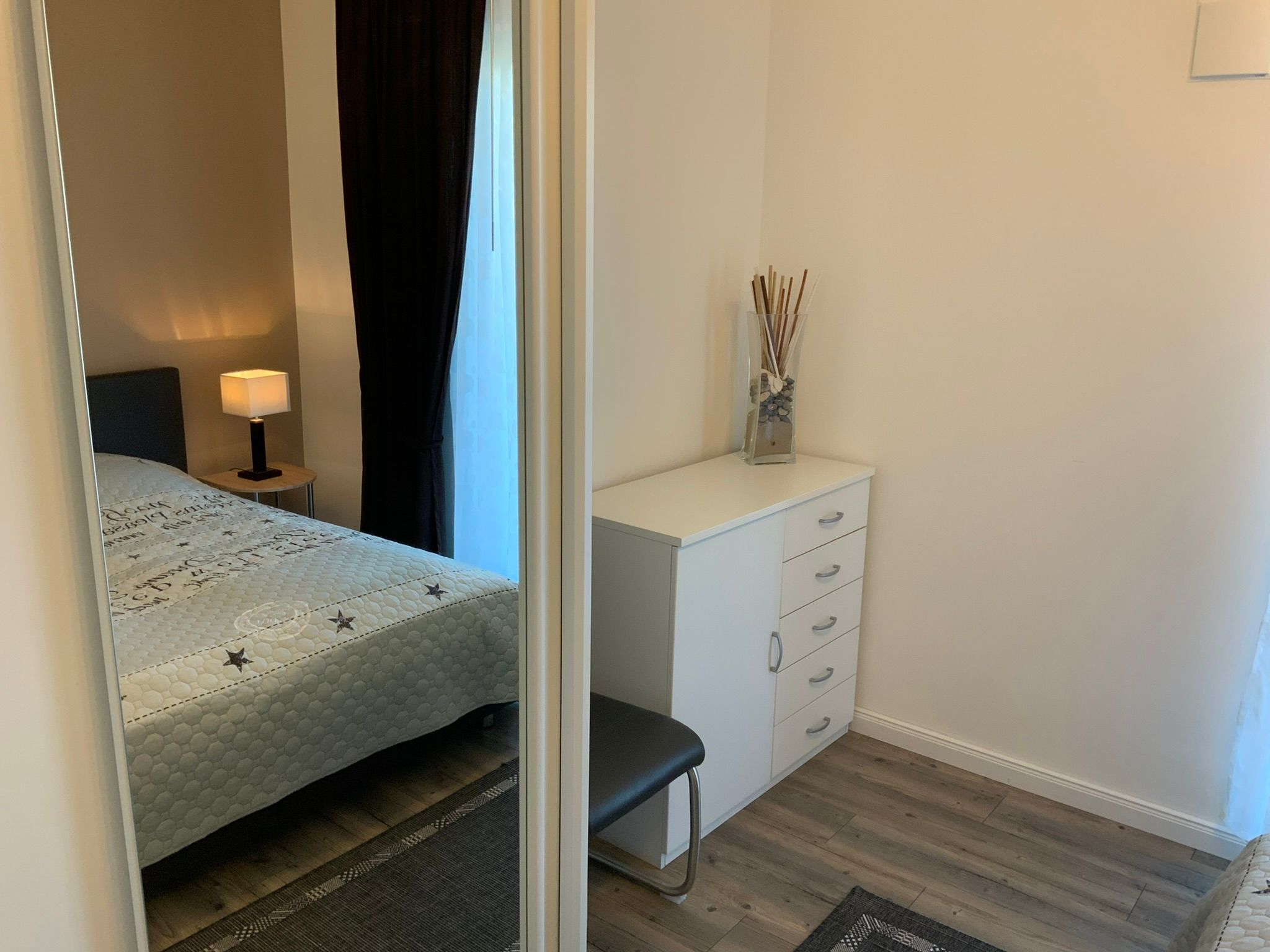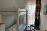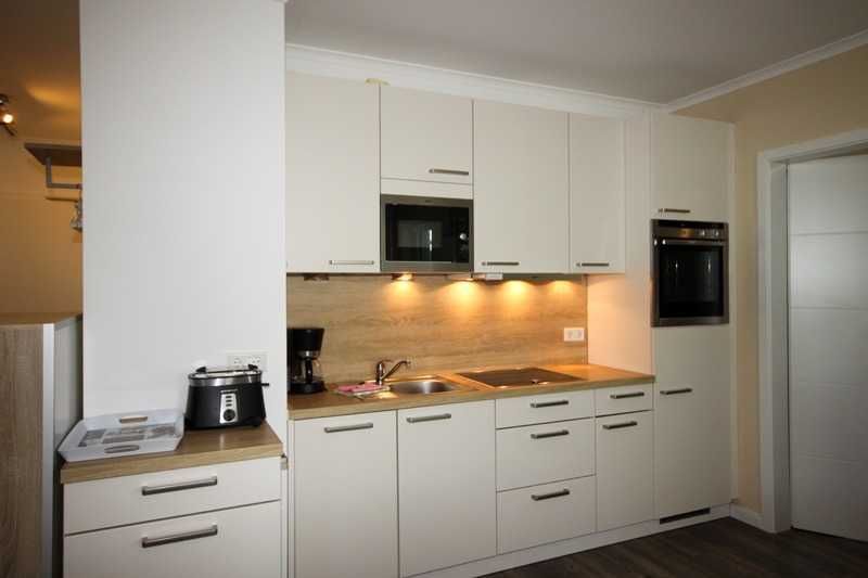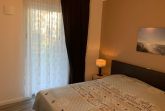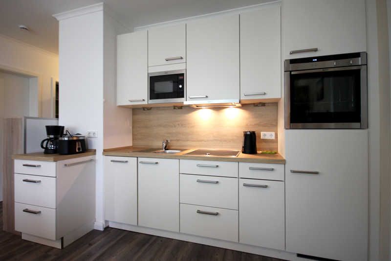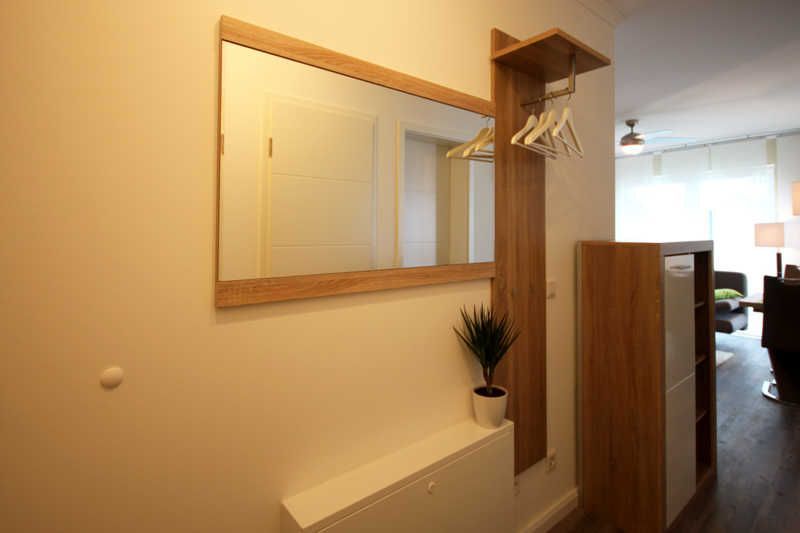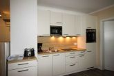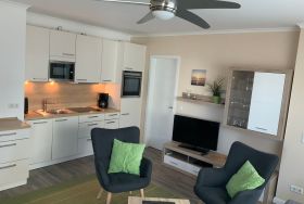 Die großzügige Wohnung ist für vier Erwachsene und einem Kind (bis 12 Jahre) eingerichtet. Im ersten Schlafzimmer finden Sie ein Doppelbett mit einem Schiebetürenschrank. Das zweite Schlafzimmer ist mit einem Etagenbett und Highboard ausgestattet. Im modernen Wohnbereich erwarten Sie eine Schlafcouch sowie zwei Sessel, zur Unterhaltung gibt es einen Flatscreen-TV, Stereoanlage und DVD-Player. Im offenen Koch- und Essbereich finden Sie die Einbauküche und einen Tisch mit sechs Stühlen. Die voll ausgestattete Einbauküche bietet Ihnen alles was Sie für Ihren Aufenthalt benötigen und verfügt über Geschirrspüler, Kühlschrank, Backofen mit Cerankochfeld und Mikrowelle. Vom Wohnraum sowie vom ersten Schlafzimmer gelangen Sie auf die nach Nord-Westen ausgerichtete Terrasse mit sechs bequemen Terrassenstühlen. Das Bad hat eine bodengleiche Dusche, einen Waschtisch mit großem Spiegel und einen Fön. Zusätzlich hat die Wohnung ein separates Gäste-WC.