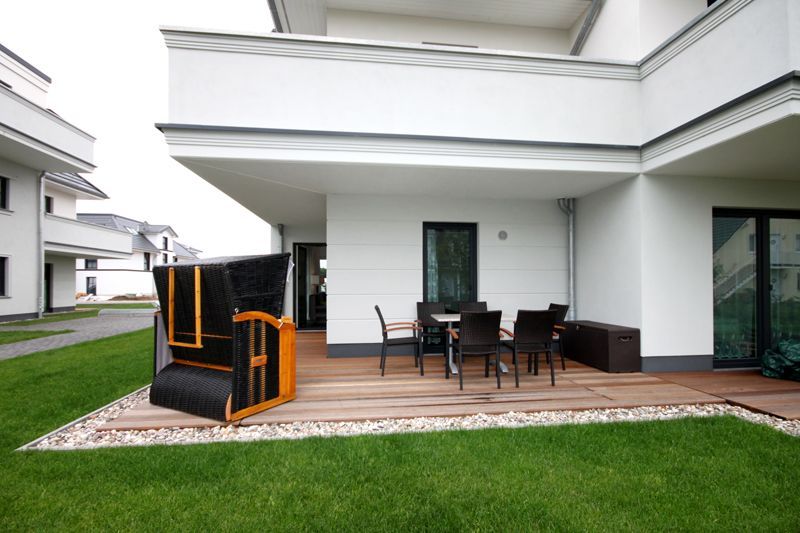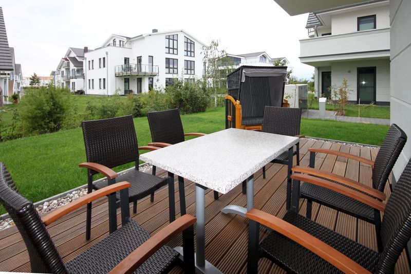 Freundliche Drei-Zimmer-Wohnung im Erdgeschoss mit Terrasse und einem Strandkorb.