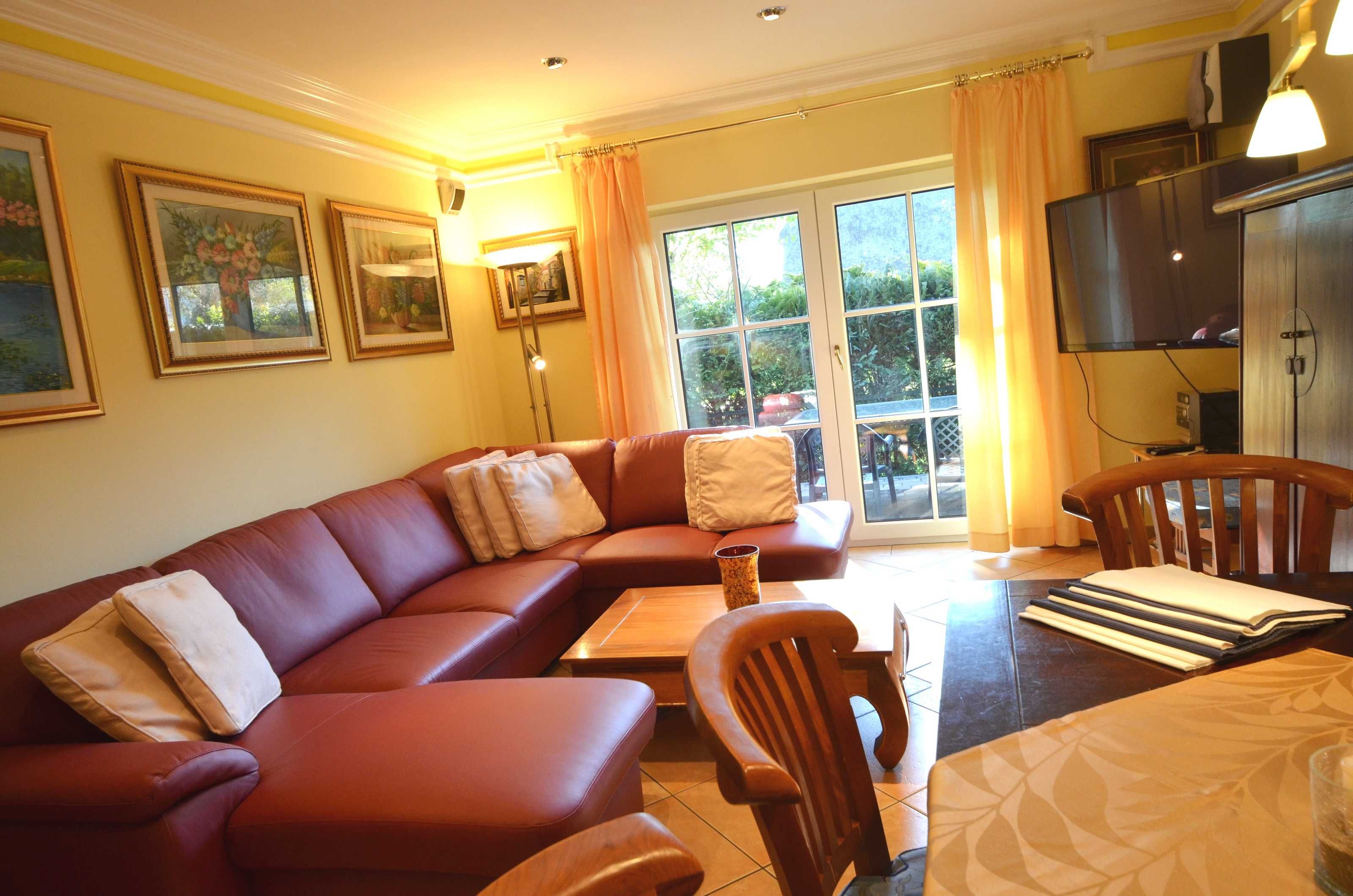 2 Bäder, Fußbodenheizung, schön eingerichtetes Wohn- Esszimmer, Couchgarnitur mit Leder bezogen, Opiumtisch, Speisetafel mit Stühlen, Geschirrschrank, Sat - TV, Telefon, Spiegel pp.