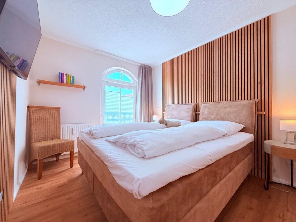 - 1. Schlafzimmer mit Boxspringbett (1.80x2.00m, durchgehender Topper) und Kleiderschrank,TV