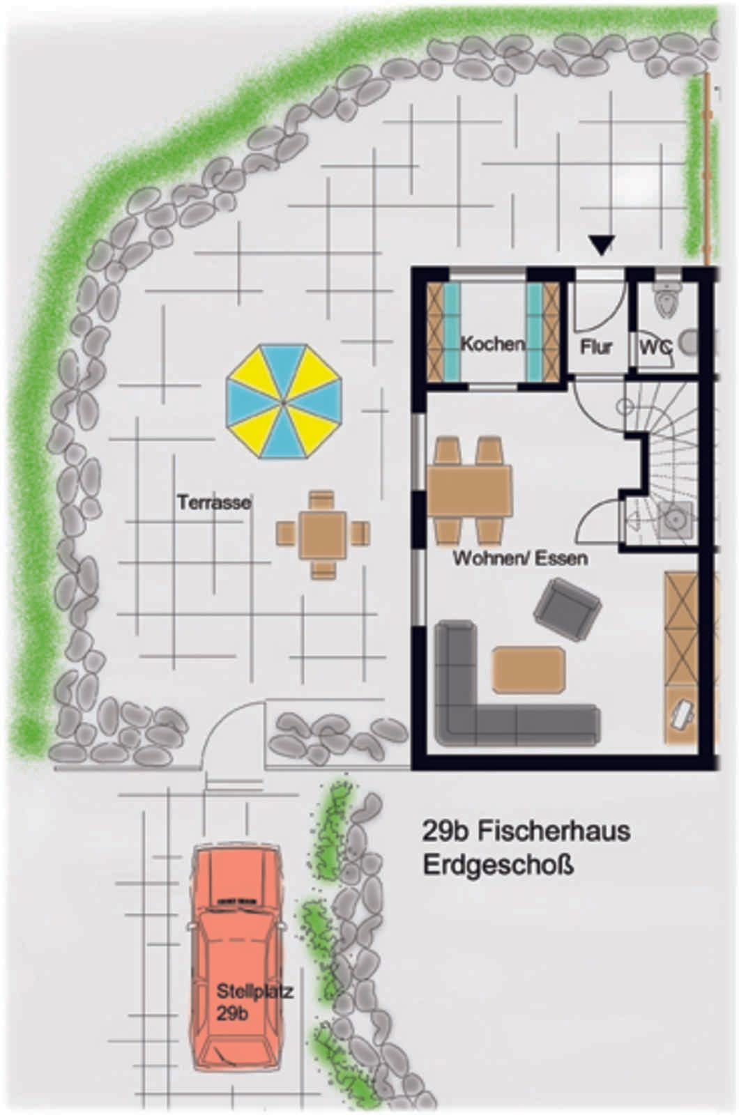 Die Hausteile haben einen eigenen separaten Eingang entweder einen kleinen Gartenteil oder Terrasse mit Gartenmöbeln, teilweise Doppelstrandkorb. Bei  Kormoran Nr. 29 E und Seeadler Nr. 29D gibt es einen Außengrill.