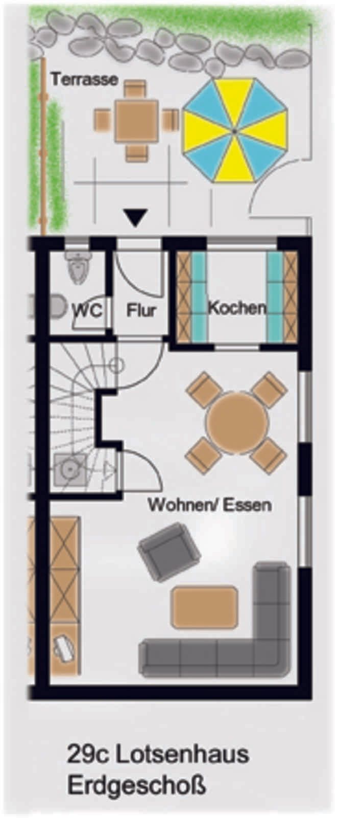 Die Hausteile haben einen eigenen separaten Eingang entweder einen kleinen Gartenteil oder Terrasse mit Gartenmöbeln, teilweise Doppelstrandkorb. Bei Kormoran Nr. 29 E und Seeadler Nr. 29D gibt es einen Außengrill.