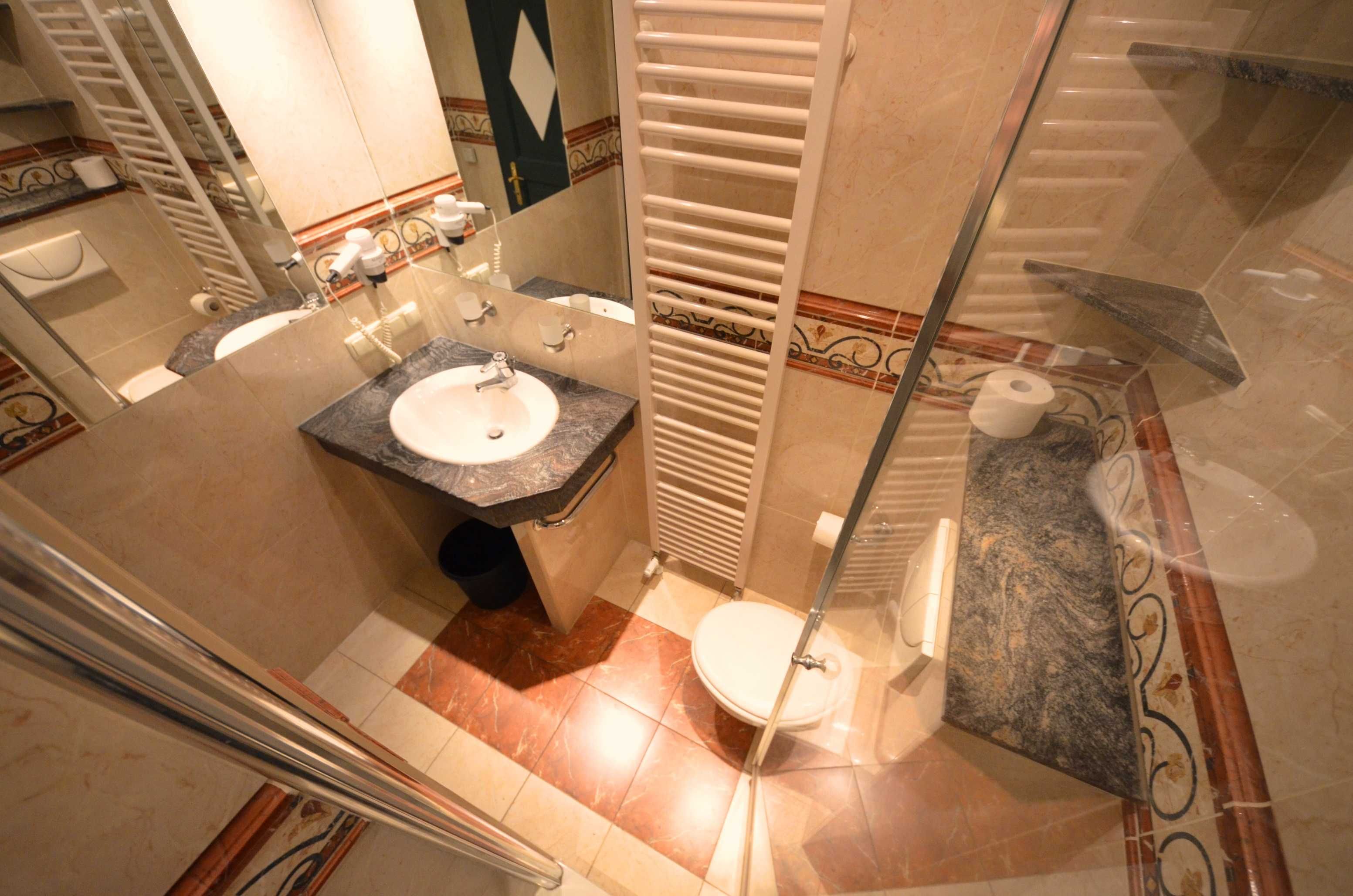 Naturstein, große Spiegel, schöne Sanitärausstattung beheizbarer Handtuchhalter, Fön, Schminkspiegel