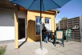 Die Ferienwohnung liegt im Erdgeschoß des Ferienhauses. Sie besteht aus Wohnzimmer, offener Küche, Schlafzimmer und Tageslichtbad. Die Ausstattung der holzfarbenen Einbauküche ist neuwertig funktional und qualitativ hochwertig unter anderem mit Toaster, Kaffeemaschine, Mikrowelle mit Grill, 4-fach Kochfeld, Geschirrspüler, Gefrierfach. Große Süd-Terrasse mit Blick auf die Wiesen Richtung Achterwasser.
