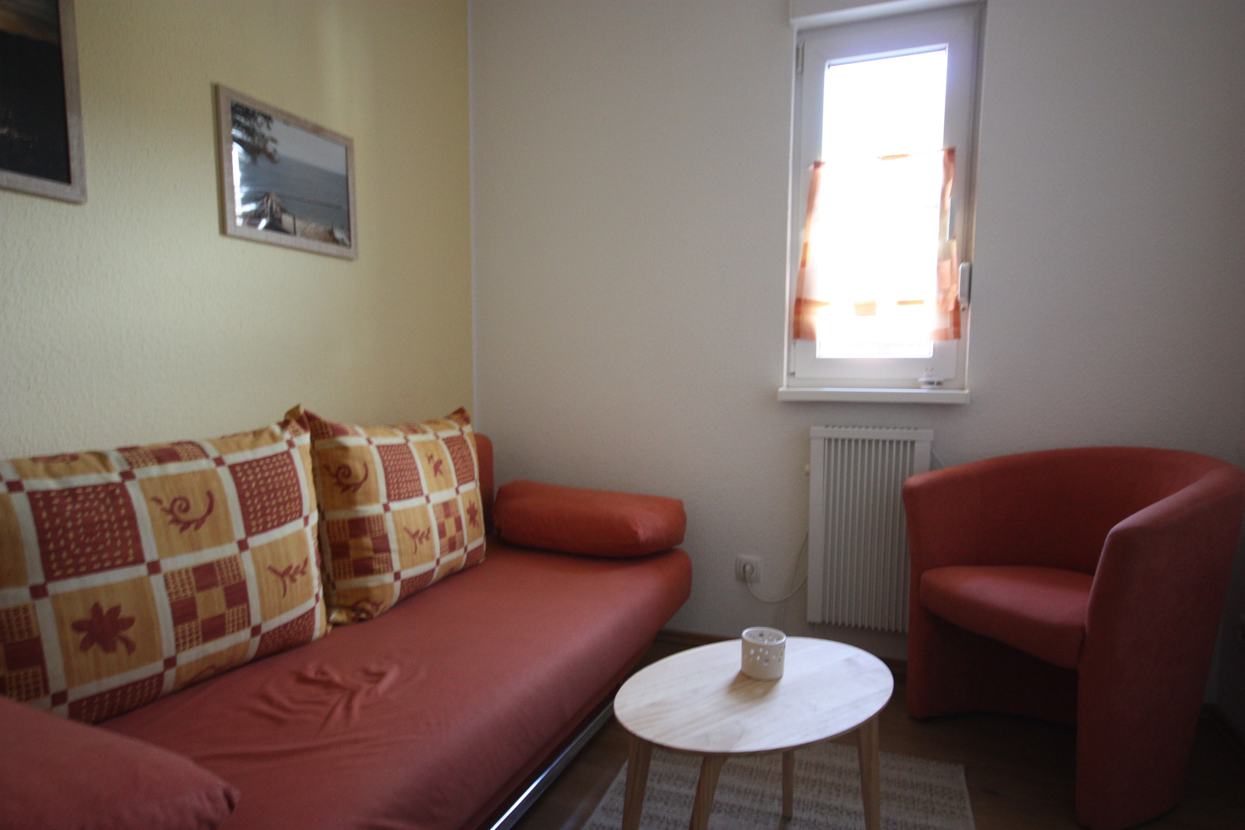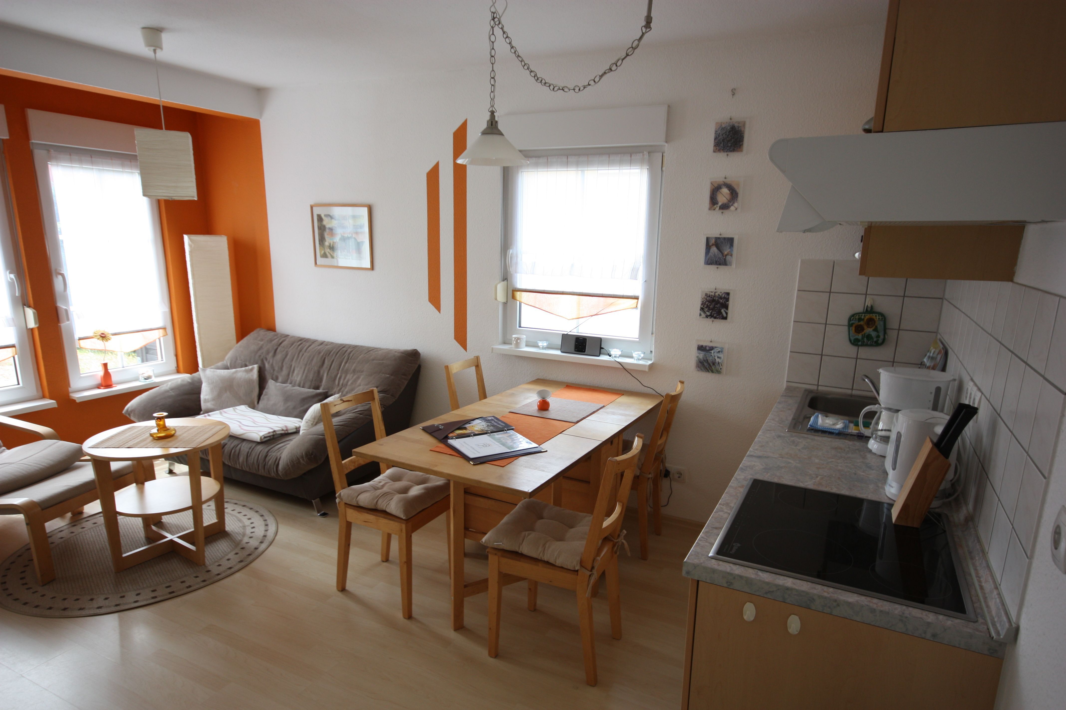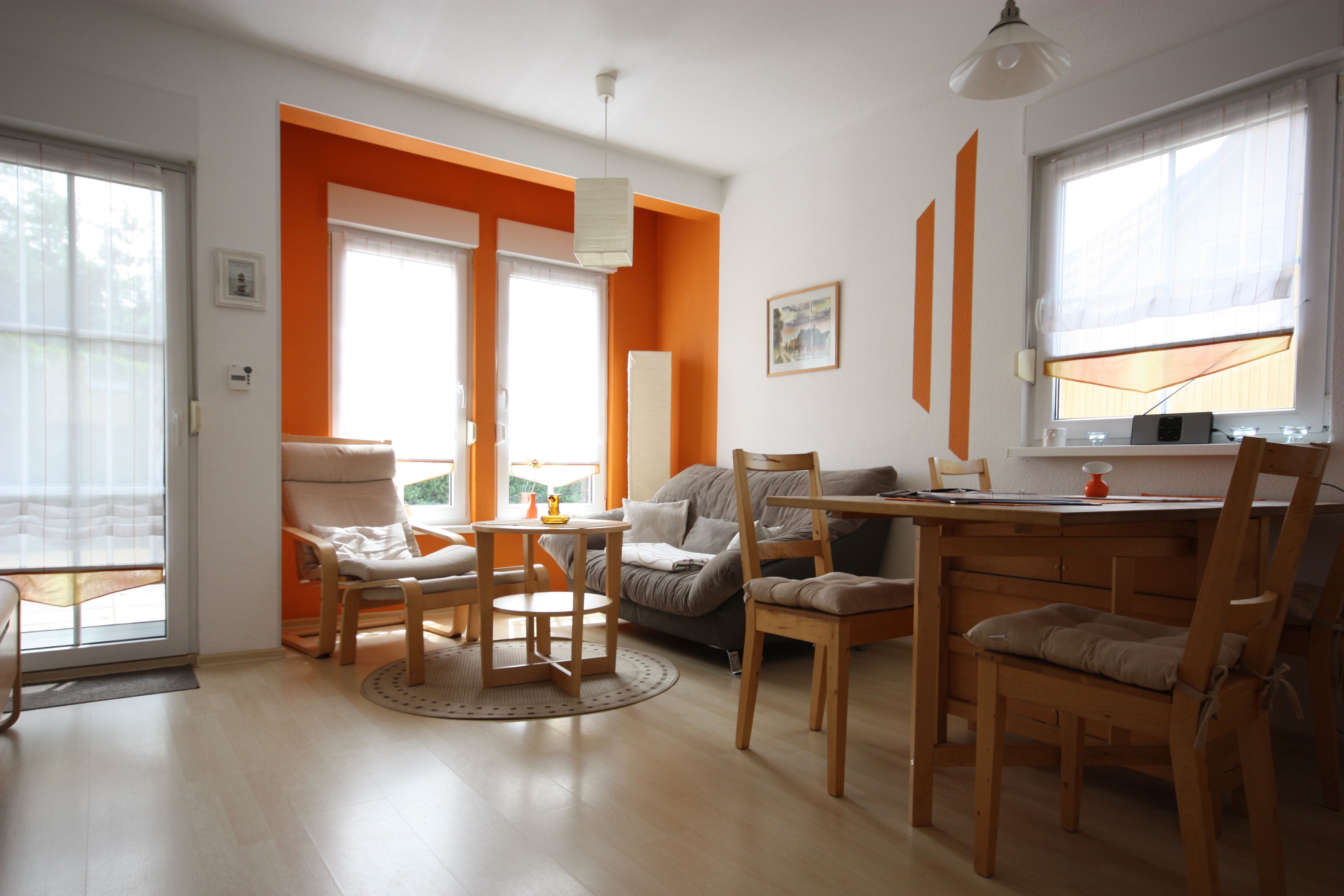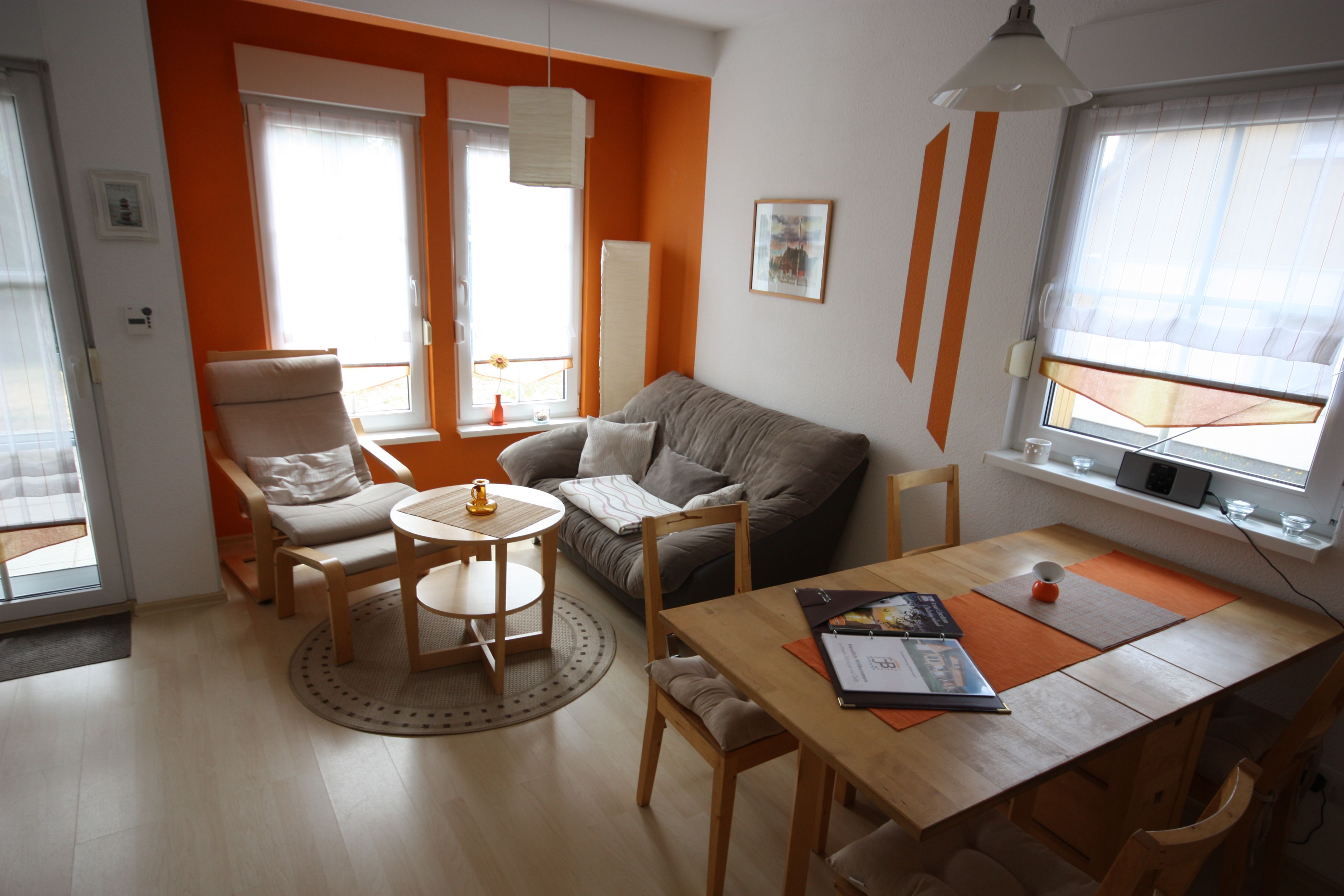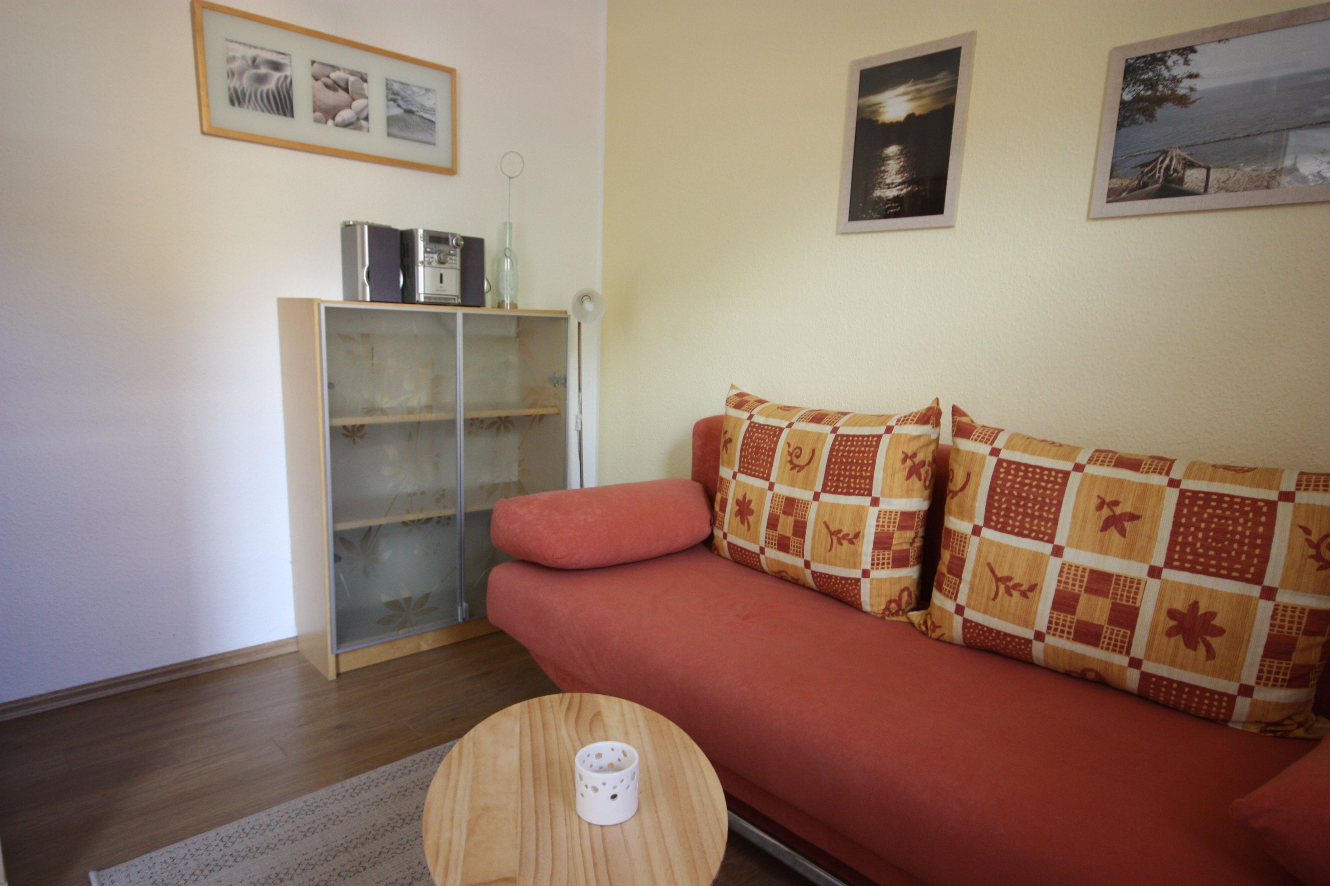 Die Wohnung ist im modernen Landhausstil mit Laminatboden und rot/brauner Möblierung gehalten. Die Wohnung verfügt über ein Schlafzimmer mit Doppelbett 160cm breit und ein Schlafzimmer mit Schlafsofa. Die Wohnung ist ideal geeignet für kleine Familien.