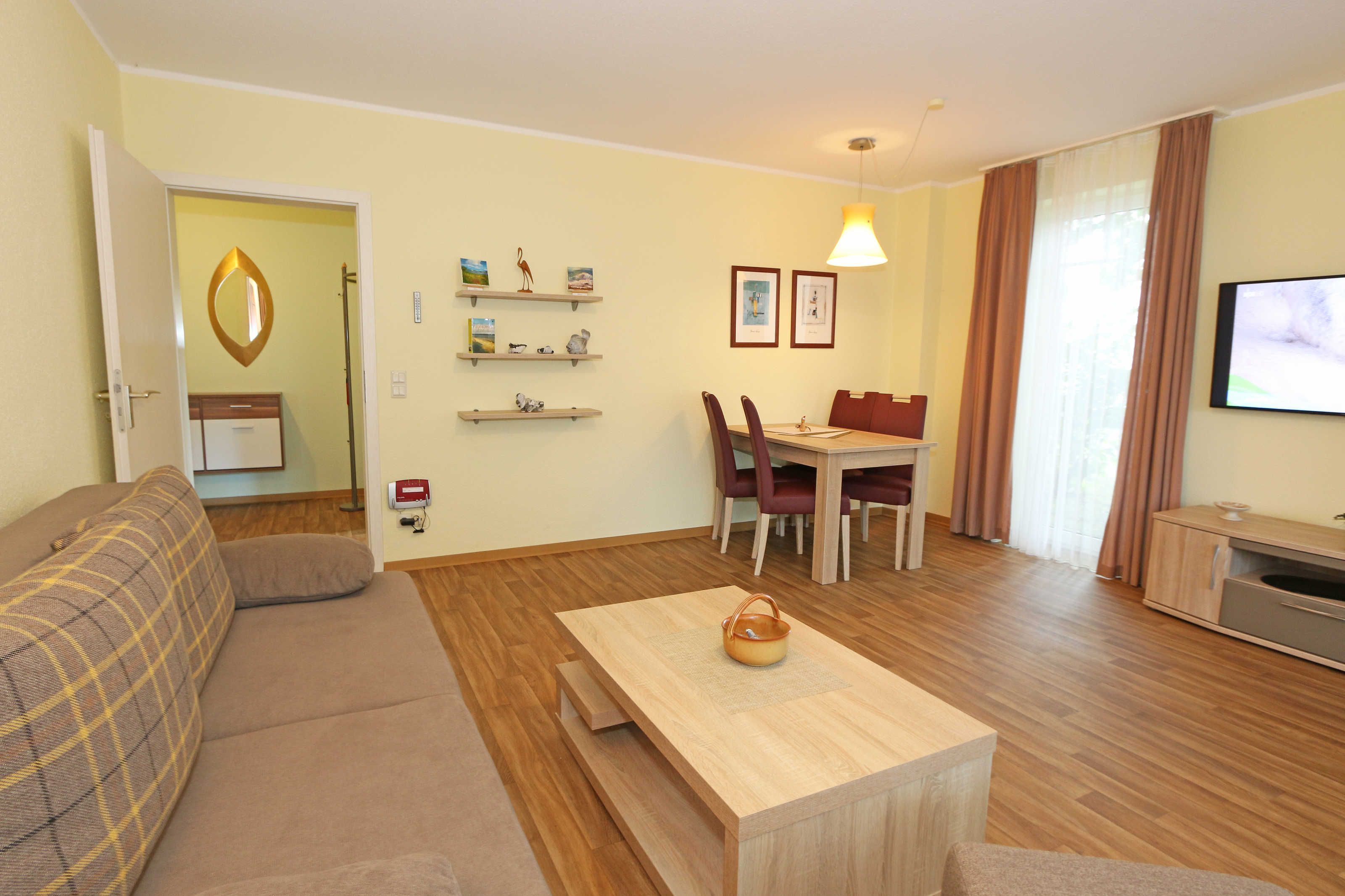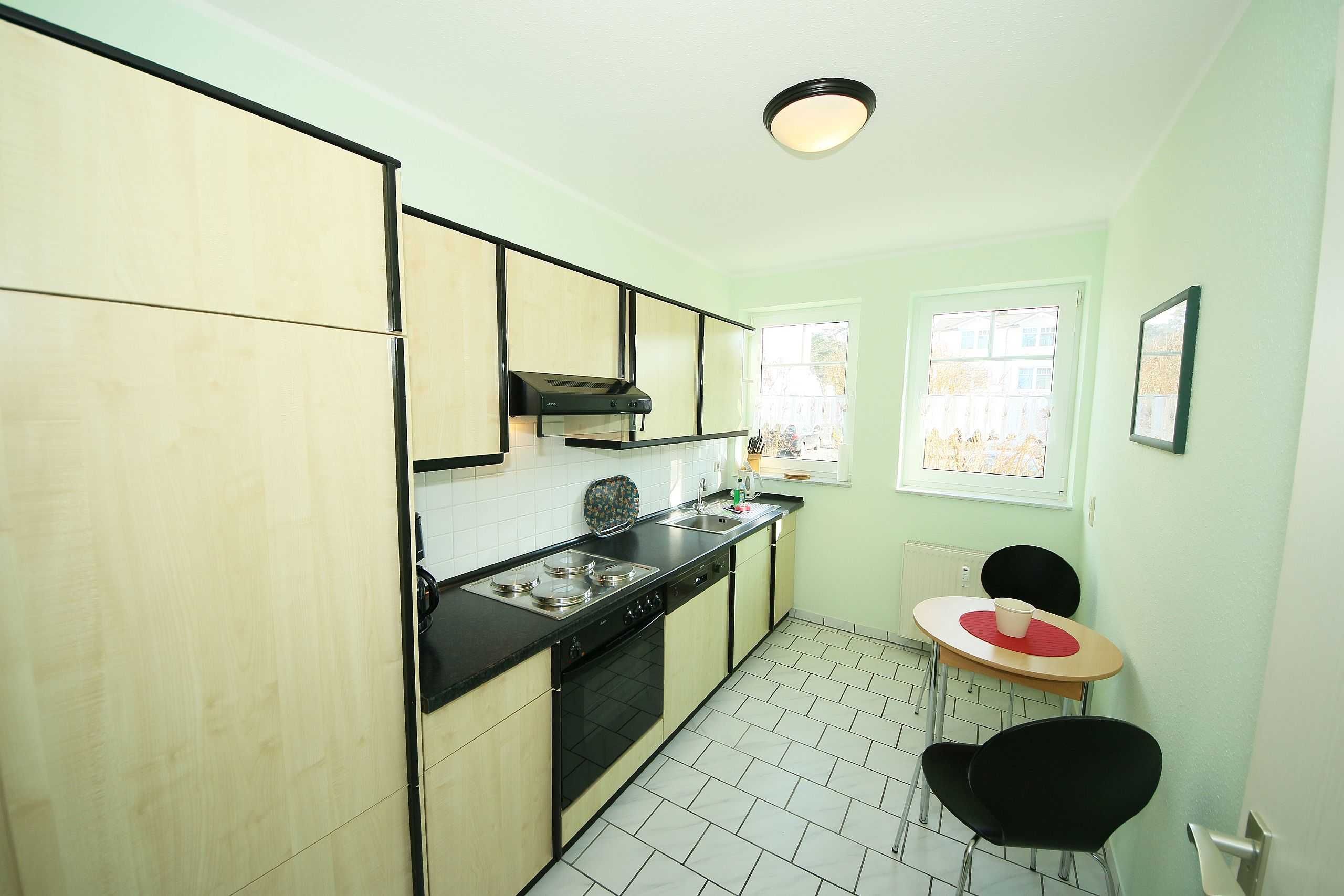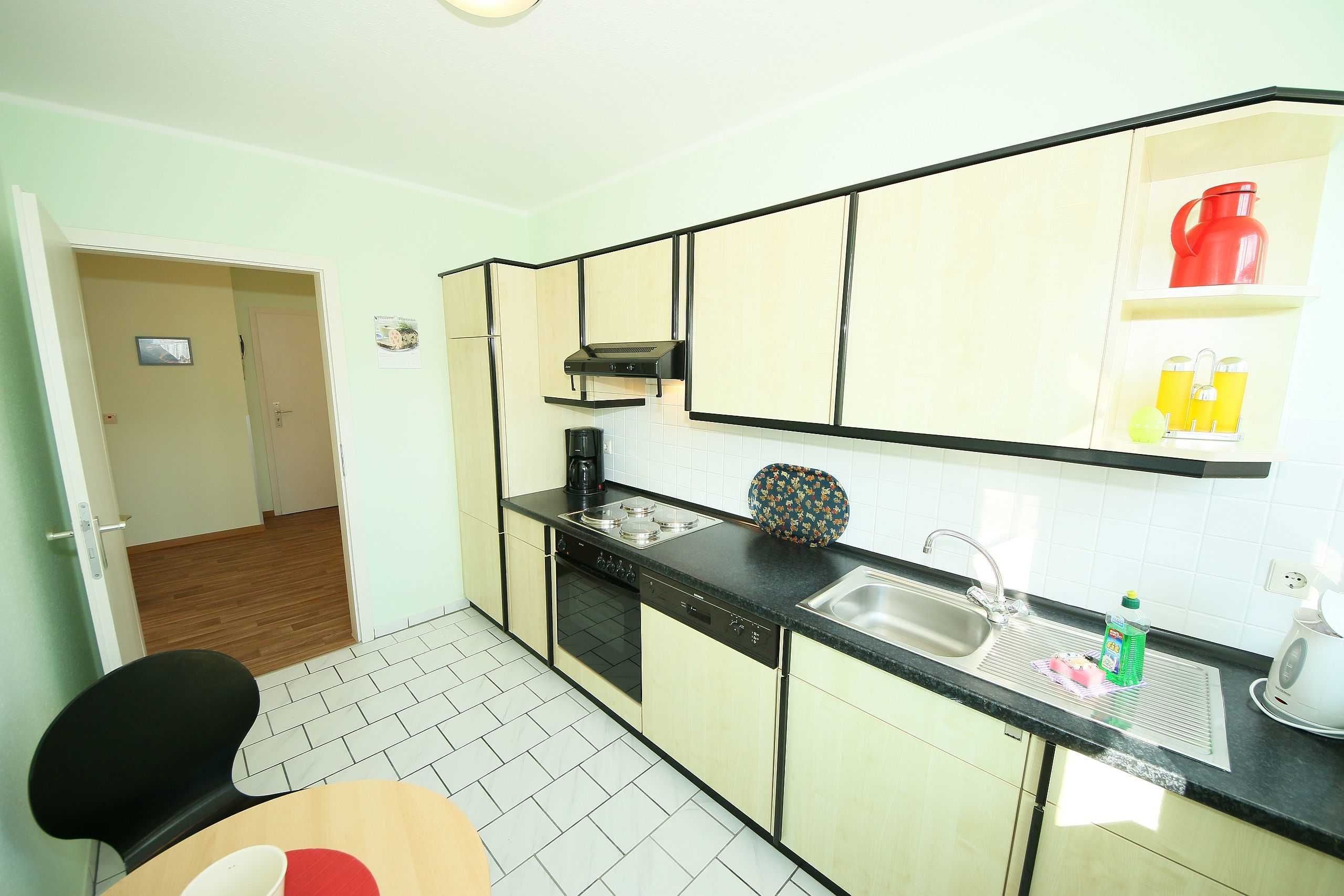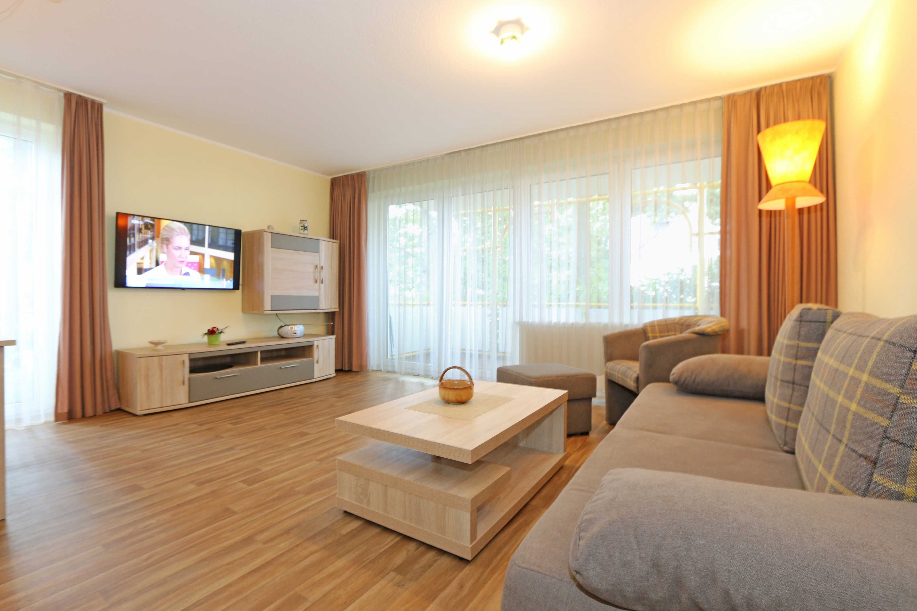 Die Ferienwohnung ist eine lichtdurchflutete und geräumige ca. 60qm große 2-Zimmer-Nichtraucherwohnung für max. 2 bis 4 Personen. Der aus dem Wohnzimmer zu erreichende überdachte Südwestbalkon lädt zu jeder Tageszeit zum Verweilen ein. Das Wohnzimmer ist ausgestattet mit einer Couch (Aufbettung für 3./4. Person/ 1,50m x 2,00m) Couchtisch sowie einen gesonderten Esstisch für 4 Personen. Ein Smart-TV und ein Radio mit CD-Player, eine Leselampe sowie ein inklusiver WLAN-Anschluss runden die gemütliche Ausstattung ab. Im Schlafzimmer befinden sich ein Doppelbett (1,80m x1,90m) mit Nachttischkonsolen, Flachbild-TV, ein geräumiger Kleiderschrank, ein großer Wandspiegel sowie ein Herrendiener mit Sitzmöglichkeit. Die separate Küche ist komplett mit Cerankochfeld, Backofen, Spülmaschine, Kühlschrank mit Eisfach, Ablufthaube, Mikrowelle, Wasserkocher, Kaffeemaschine, Toaster und einer Sitzecke für 2 Personen ausgestattet. Das geflieste Bad wird durch eine Dusche, WC, Waschtisch, Kosmetikspiegel und ein mobiler Wäschetrockner abgerundet. Insektenschutzgitter befinden sich im Küchen- und Schlafbereich. Eine Waschmaschine und ein Trockner (Münzbetrieb) sind im Keller nutzbar. Auch können Sie hier einen Fahrrad - und Kinderwagenabstellraum nutzen. Ein eigener PKW-Stellplatz (Nr.13) gehört zur Wohnung dazu. 1 Haustier ist gegen eine Gebühr ein gern gesehener Gast. Die Erstausstattung eines Wäschepaketes (komplette Bettwäsche, 1 Duschhandtuch, 1 kleines Handtuch) können Sie bis 14 Tage vor Anreise gegen einen Aufpreis dazu buchen oder durch eigene ergänzen. Ab 2 gebuchten Paketen erhalten Sie einmalig 1 Geschirrhandtuch und 1 Duschvorleger hinzu.