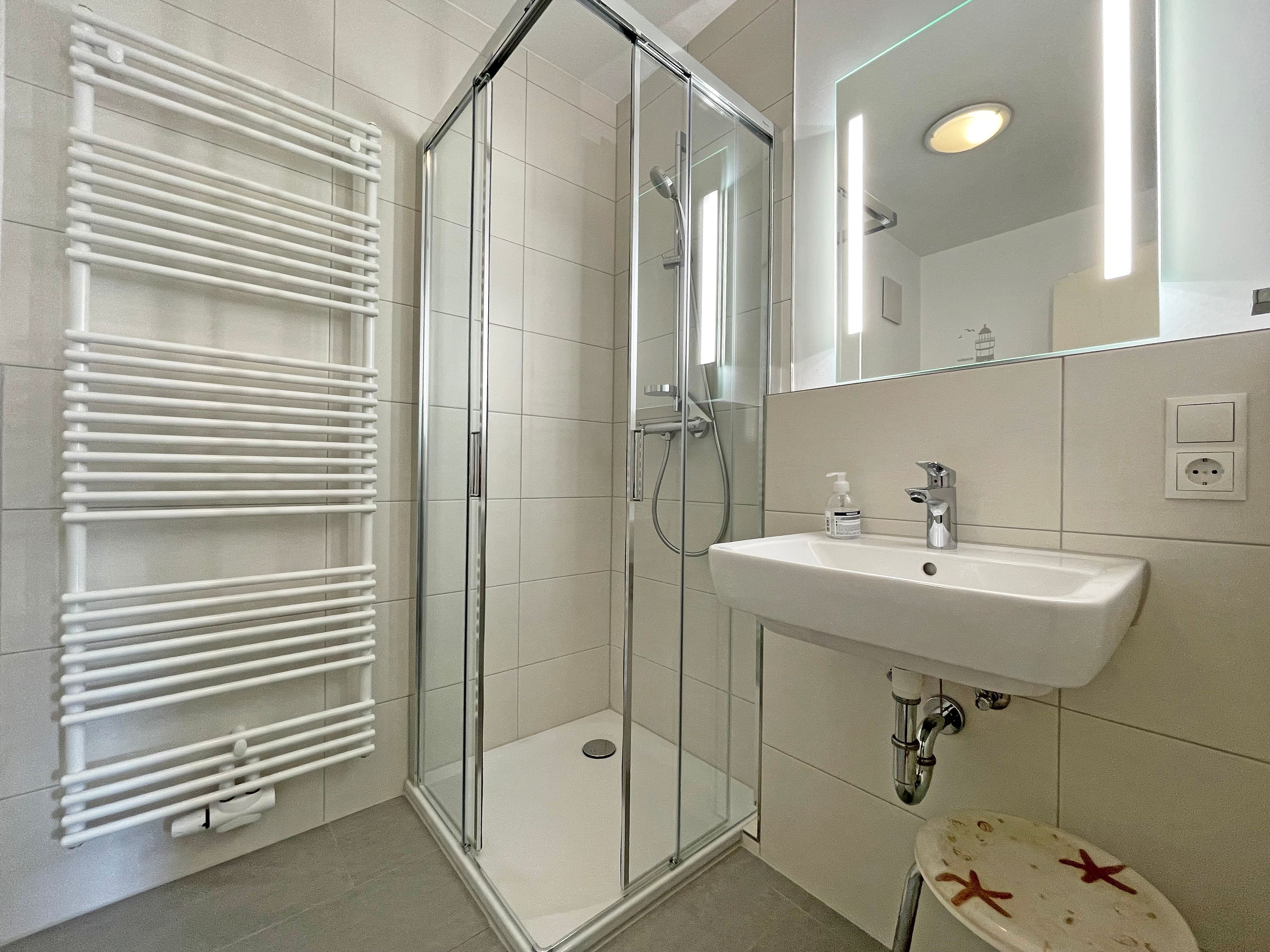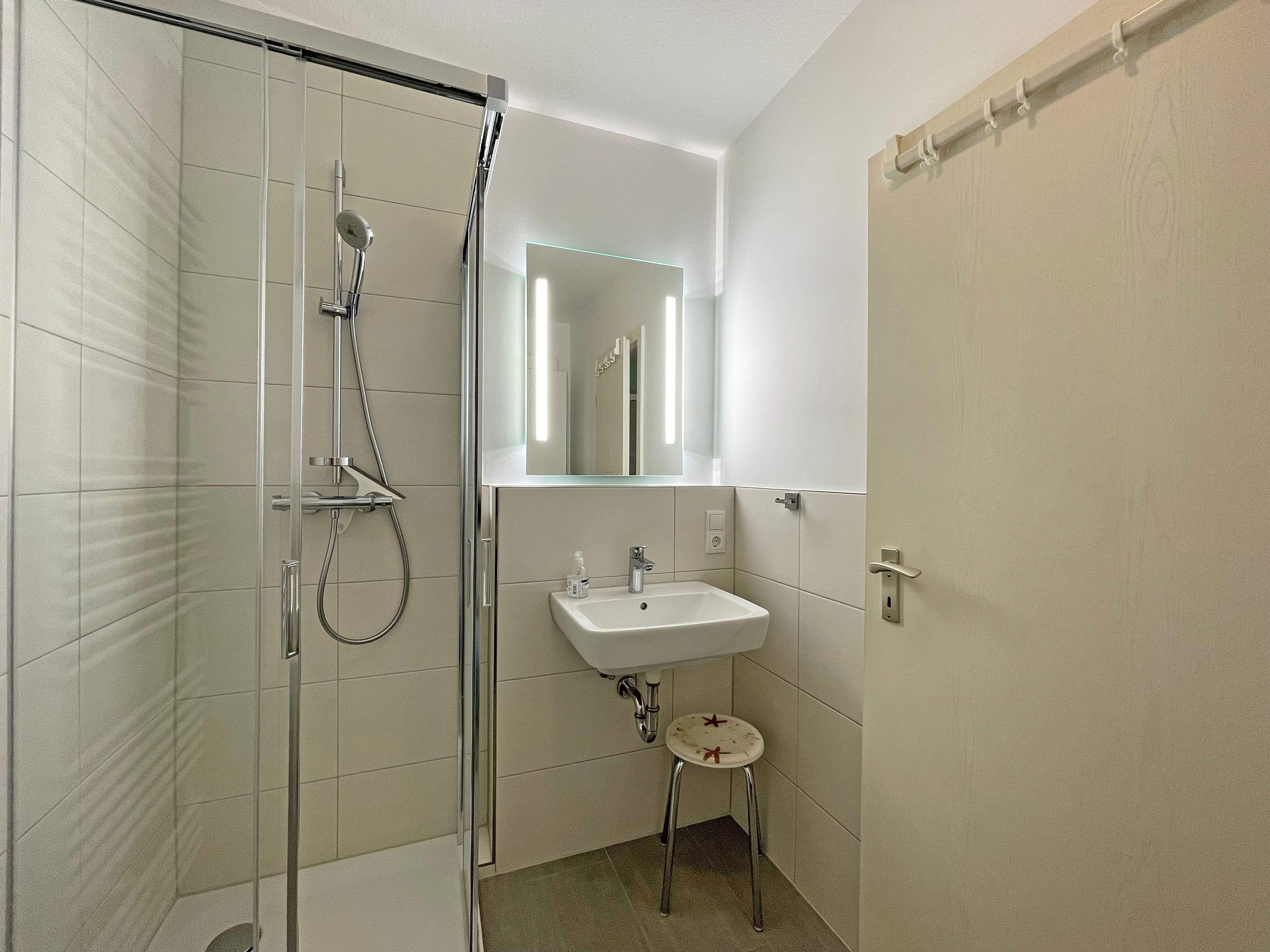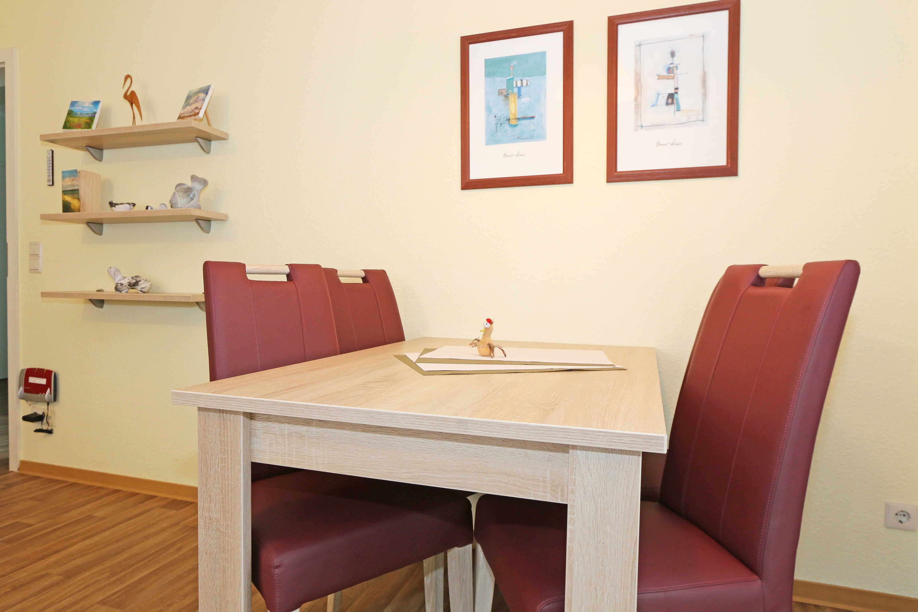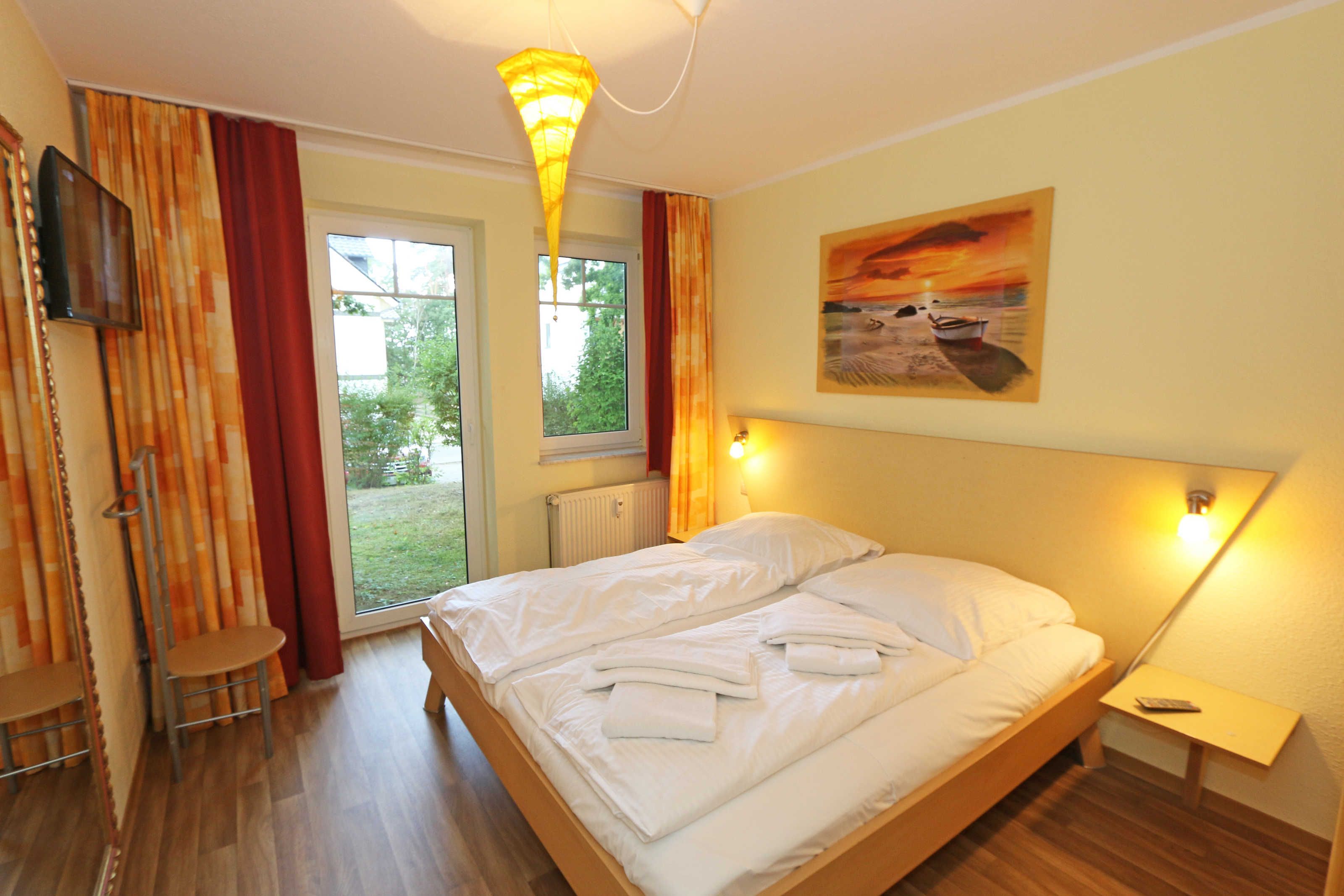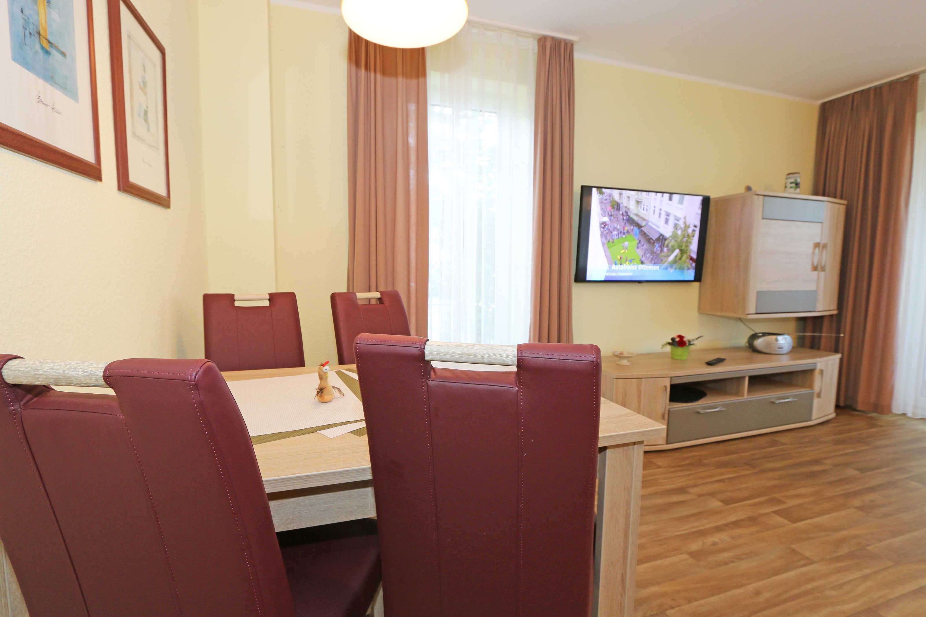 Die Ferienwohnung ist eine lichtdurchflutete und geräumige ca. 60qm große 2-Zimmer-Nichtraucherwohnung für max. 2 bis 4 Personen. Der aus dem Wohnzimmer zu erreichende überdachte Südwestbalkon lädt zu jeder Tageszeit zum Verweilen ein. Das Wohnzimmer ist ausgestattet mit einer Couch (Aufbettung für 3./4. Person/ 1,50m x 2,00m) Couchtisch sowie einen gesonderten Esstisch für 4 Personen. Ein Smart-TV und ein Radio mit CD-Player, eine Leselampe sowie ein inklusiver WLAN-Anschluss runden die gemütliche Ausstattung ab. Im Schlafzimmer befinden sich ein Doppelbett (1,80m x1,90m) mit Nachttischkonsolen, Flachbild-TV, ein geräumiger Kleiderschrank, ein großer Wandspiegel sowie ein Herrendiener mit Sitzmöglichkeit. Die separate Küche ist komplett mit Cerankochfeld, Backofen, Spülmaschine, Kühlschrank mit Eisfach, Ablufthaube, Mikrowelle, Wasserkocher, Kaffeemaschine, Toaster und einer Sitzecke für 2 Personen ausgestattet. Das geflieste Bad wird durch eine Dusche, WC, Waschtisch, Kosmetikspiegel und ein mobiler Wäschetrockner abgerundet. Insektenschutzgitter befinden sich im Küchen- und Schlafbereich. Eine Waschmaschine und ein Trockner (Münzbetrieb) sind im Keller nutzbar. Auch können Sie hier einen Fahrrad - und Kinderwagenabstellraum nutzen. Ein eigener PKW-Stellplatz (Nr.13) gehört zur Wohnung dazu. 1 Haustier ist gegen eine Gebühr ein gern gesehener Gast. Die Erstausstattung eines Wäschepaketes (komplette Bettwäsche, 1 Duschhandtuch, 1 kleines Handtuch) können Sie bis 14 Tage vor Anreise gegen einen Aufpreis dazu buchen oder durch eigene ergänzen. Ab 2 gebuchten Paketen erhalten Sie einmalig 1 Geschirrhandtuch und 1 Duschvorleger hinzu.