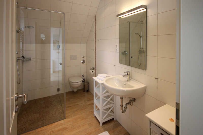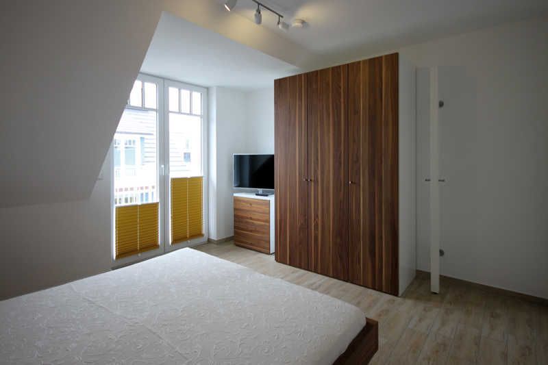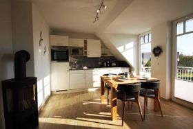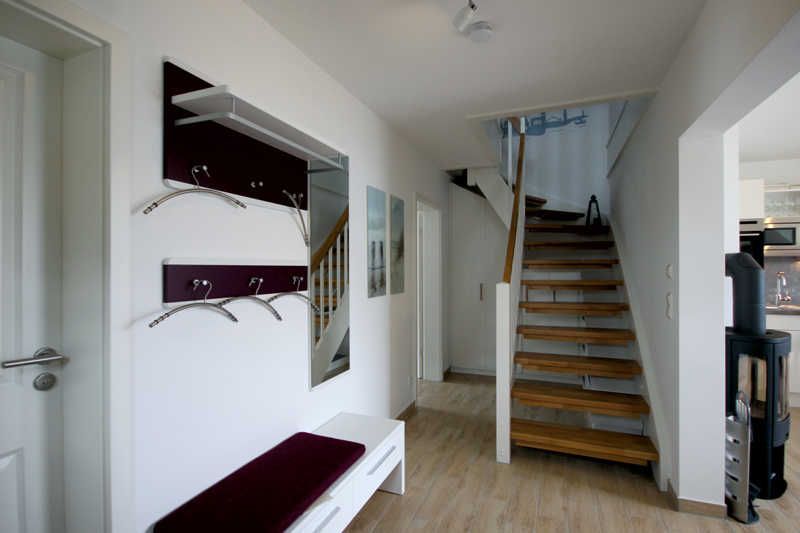 Im gemütlich eingerichteten Wohnbereich empfängt Sie eine Eckcouch mit Flatscreen-TV und BluRay-Player. An kalten Tagen schafft der ästhetische Kaminofen wohlige Wärme (Kaminholz muss selbst organisiert werden). Im offenen Koch- und Essbereich befinden sich eine offene Einbauküche sowie ein großzügiger Holztisch mit vier Stühlen. Die voll ausgestattete Küchenzeile mit Mikrowelle, Backofen, Cerankochfeld, Geschirrspüler und Kühl-/Gefrierkombi lässt keine Wünsche offen. Beide Schlafzimmer bieten reichlich Platz zum Träumen in je einem Doppelbett. Das erste Schlafzimmer, welches sich im ersten Obergeschoss befindet, ist zusätzlich mit einen Flatscreen-TV und einem großen dreitürigen Kleiderschrank ausgestattet. Das zweite Schlafzimmer liegt im zweiten Obergeschoss. Sie haben von hier einen weiten Blick in Richtung Meer. Das großzügige, elegante Bad ist mit einer bodengleichen Dusche, einem Handtuchwärmer und einem Fön ausgestattet. Vom Wohn- sowie vom Schlafbereich gelangen Sie auf die Balkone. Dort lassen sich die Sonnenstunden wunderbar genießen.
