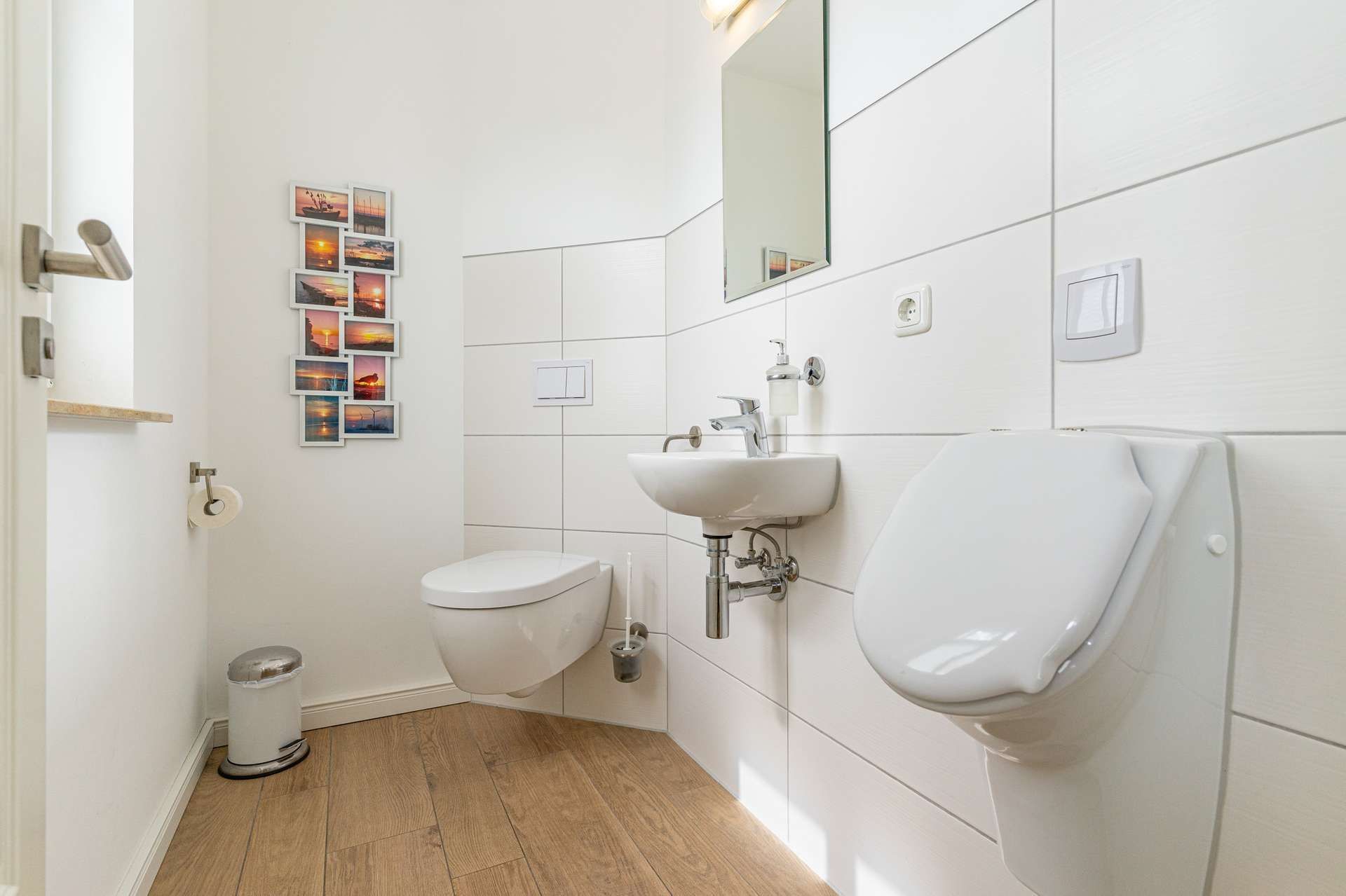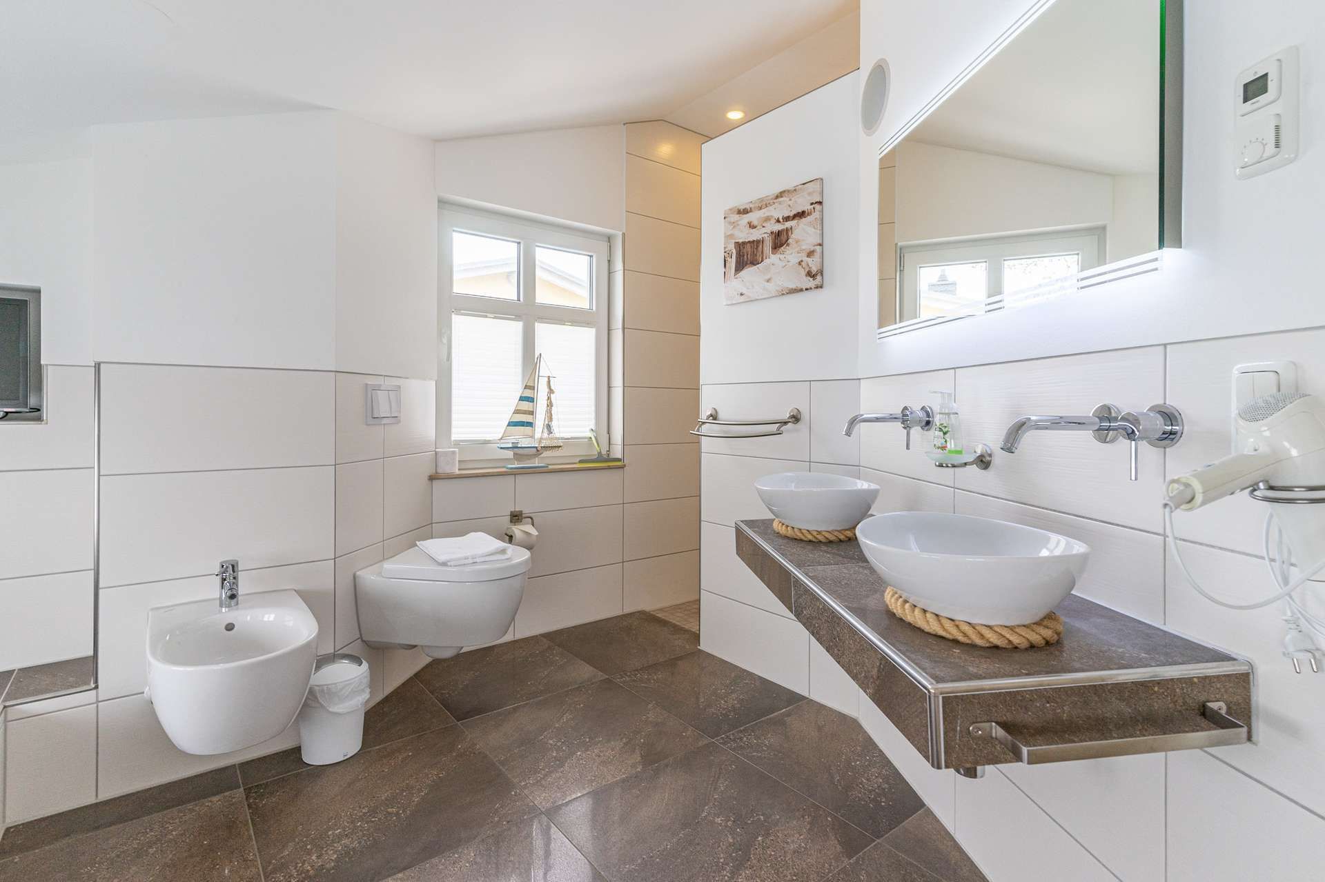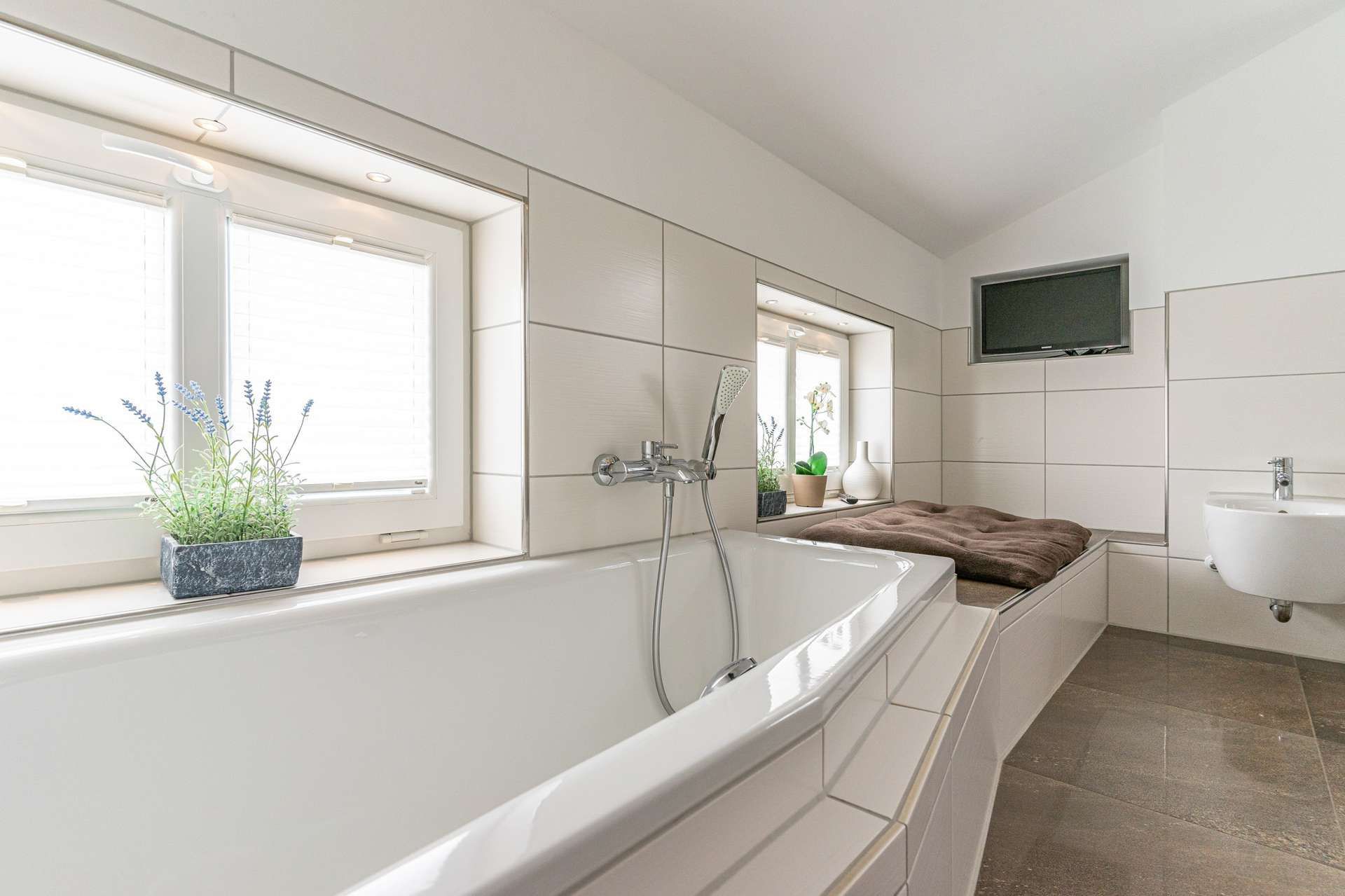 Das Badezimmer im Obergeschoss, mit bodengleicher Dusche, Badewanne, Bidet und Doppelwaschplatz garantieren höchsten Badespaß – noch dazu bei leiser Musik oder den aktuellen Nachrichten. Selbst aus der Badewanne können Sie Ihre Lieblingssendung im TV schauen. Im Erdgeschoss befindet sich noch ein Gäste-WC.