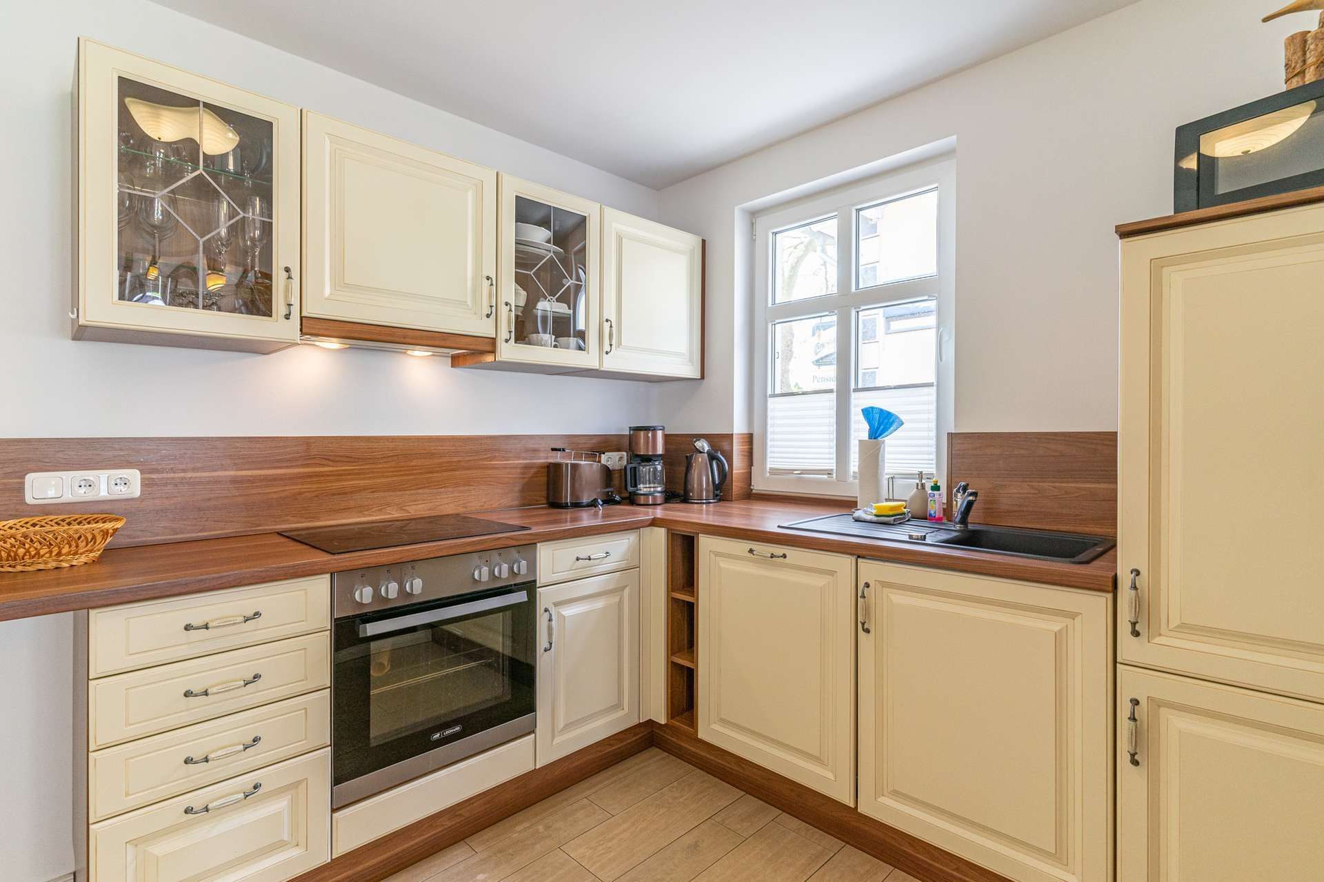 Die offene Küche die unter anderem mit einem Geschirrspüler, Kühlschrank, Cerankochfeld, Mikrowelle, Backofen, Kaffeemaschine, Wasserkocher und Toaster erstklassig ausgestattet ist, vollendet das Wohlbefinden in unseren Appartements.