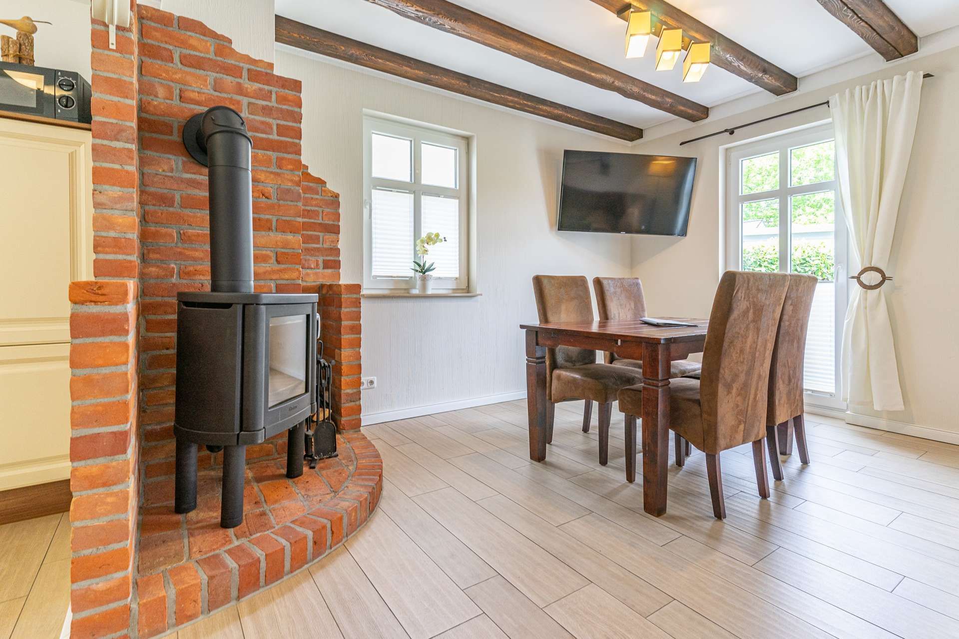 Der großzügige Essplatz befindet sich gleich nebenan im Wohnraum. Hier können Sie auch von einer bequemen Sitzgruppe dem Knistern des Kamins lauschen oder einen gemütlichen Fernsehabend verbringen. Der Full-HD Fernseher sowie ein Blue-Ray Player, ist mit nur einer Fernbedienung sehr einfach zu handhaben. So wird Ihr neues Zuhause zu einem wahren Ferien-Erlebnis.