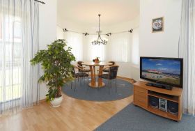 Die hochwertig eingerichtete 2-Zimmer-Ferienwohnung verfügt über ein komfortabel eingerichtetes Wohnzimmer (Flachbildfernseher, DVD-Player, etc.) mit einer komplett ausgestatteten Küchenzeile (Geschirrspüler, Mikrowelle, etc.). Im Erkerbereich des Wohnzimmers befindet sich der Esstisch. Das Schlafzimmer ist mit einem Doppelbett (neues Doppelbett 2025) sowie einem Einzelbett ausgestattet. Für Raucher gibt es eine Miniterrasse vor dem Wohnzimmer.