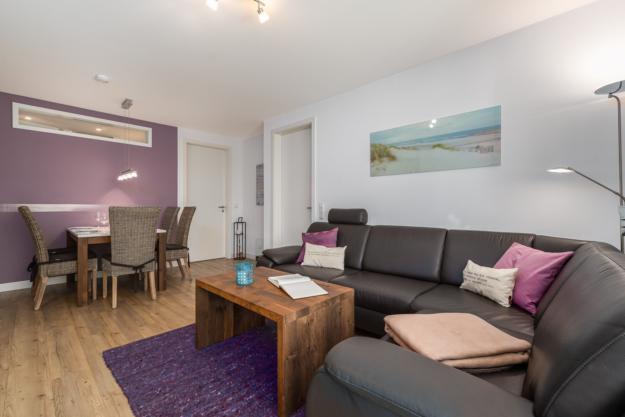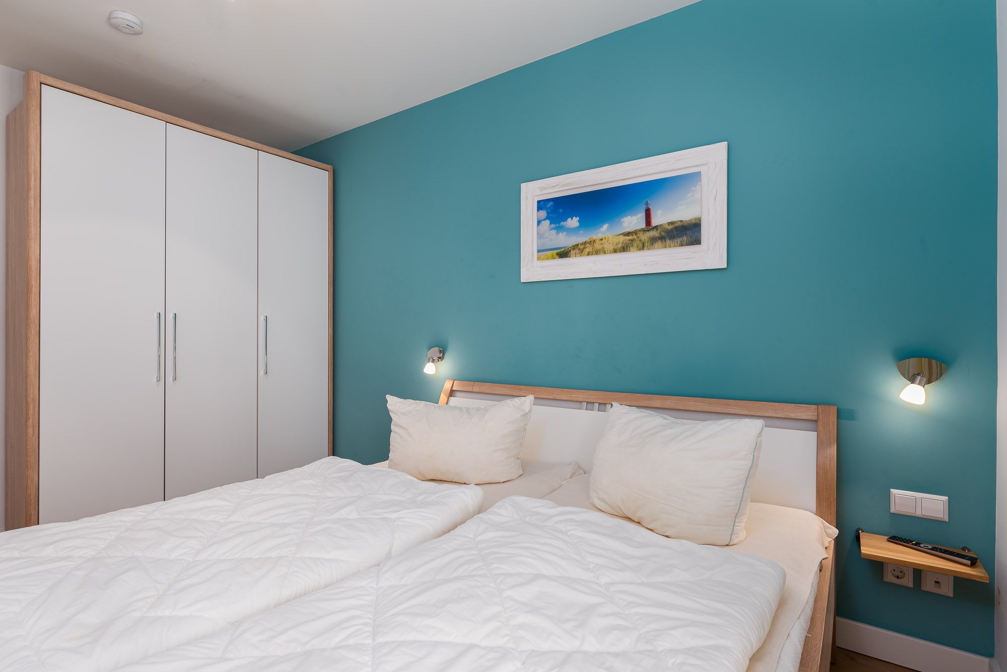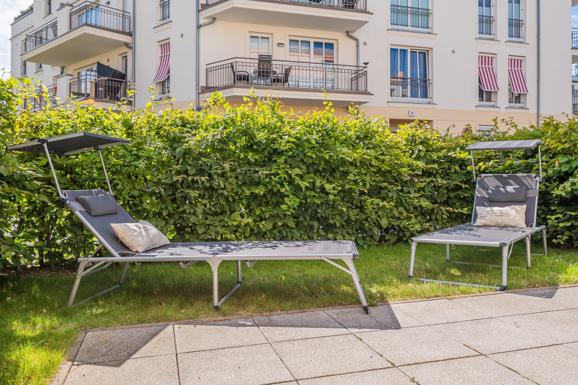 Diese moderne Ferienwohnung ist für max. fünf Erwachsene (ab dritter Person Aufpreis) und ein Kind (bis 14 Jahre) eingerichtet. Es stehen Ihnen zwei Schlafzimmer mit großen, bequemen Doppelbetten zur Verfügung. Beide Boxspringbetten sind mit angenehm weichen Matratzen belegt worden. In beiden Schlafräumen haben Sie jeweils einen Flatscreen-TV, ein CD-Radio und einen geräumigen Kleiderschrank. Auch ein tragbares Ausziehbett (Liege) ist bei Bedarf vorhanden. Im Wohnraum können Sie zusätzlich noch eine L-förmige Schlafcouch nutzen. Zur Unterhaltung gibt es dort einen großen Flatscreen-TV inklusive Blu-ray-Player sowie eine separate Stereoanlage. Die Terrasse können Sie direkt von beiden Schlafzimmern und dem Wohnbereich aus betreten. Sie liegt in Süd-West- Richtung. Natürlich inklusive moderner Gartenmöbel. Im offenen Küchen -und Wohnbereich finden Sie einen ausziehbaren Esstisch mit sechs Rattanstühlen. Die Küche ist, neben der Standardausstattung, mit Mikrowelle, Backofen, Cerankochfeld, Geschirrspüler und Kühlschrank mit eingebautem Gefrierfach ausgestattet. Der Sanitärbereich verfügt über zwei Bäder. Beide ausgestattet mit bodengleichen Duschen, Waschtischen und Spiegel. In einem der Bäder finden Sie eine Sauna. Diese wird über einen Münzautomaten betrieben. An der Wohnung befindet sich ein kostenfreier Pkw-Stellplatz, direkt neben der Terrasse. Für geliehene oder mitgebrachte Fahrräder wurde ein abschließbarer Fahrradraum in der Tiefgarage eingerichtet. Und noch einige Hinweise: Es steht ein Kinderhochstuhl kostenlos bereit. Wäschesets und ein Kinderreisebett können kostenpflichtig dazugebucht werden. Waschmaschine und Trockner sind im Erdgeschoss, Waschraum, des Objekts vorhanden. (Münzautomaten mit 50 Cent Münzen Einwurf). Die Wohnung ist eine Nichtraucherwohnung. Und es sind hier keine Haustiere gestattet. Die kostenfreie WLAN-Verbindung in dieser Unterkunft ist ausschließlich für die Verwendung von Social- Mediakanälen sowie den Austausch von Bildern mit Familie und Freunden gedacht. Eine Nutzung zum Streamen, z.B. von Filmen, ist nicht vorgesehen. Ab der dritten Person und drittem Lebensjahr, wird ein Aufpreis in Höhe von 10,00 €/ ÜN pro Person berechnet. Sichern Sie sich den Anspruch auf einen der begehrten Strandkörbe (Anfang Mai - Ende August) und buchen Sie jetzt zu besonderen Konditionen (12,00 € pro Tag oder 75,00 € pro Woche.)