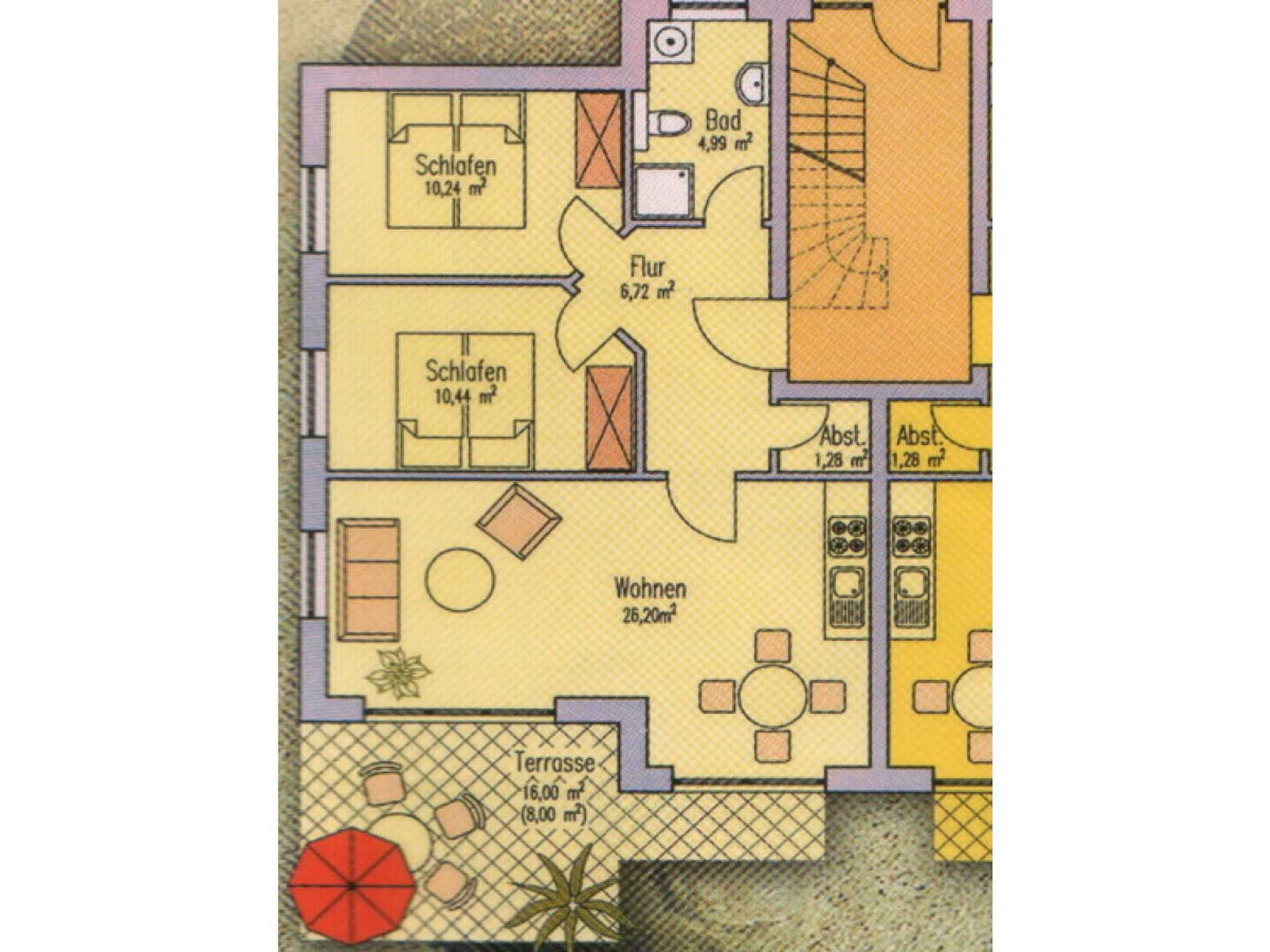 Unsere exquisite Ferienwohnung ist für 4 Personen + Kleinkind exklusiv und liebevoll eingerichtet. (Wohnungsgröße: 68qm) Sie befindet sich im Erdgeschoss mit großer Südterrasse und eigenem Garten mit unverbautem Blick. Es stehen Ihnen 2 Schlafzimmer, ein Bad mit Dusche sowie ein Wohnraum mit Küchenzeile zur Verfügung. Die Küche ist mit Herd und Backofen, Kühlschrank und Geschirrspüler ausgestattet. Fernseher und Stereoanlage sind ebenfalls vorhanden.