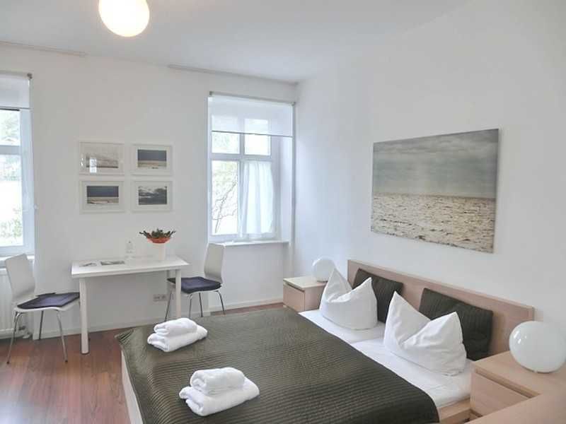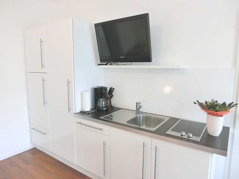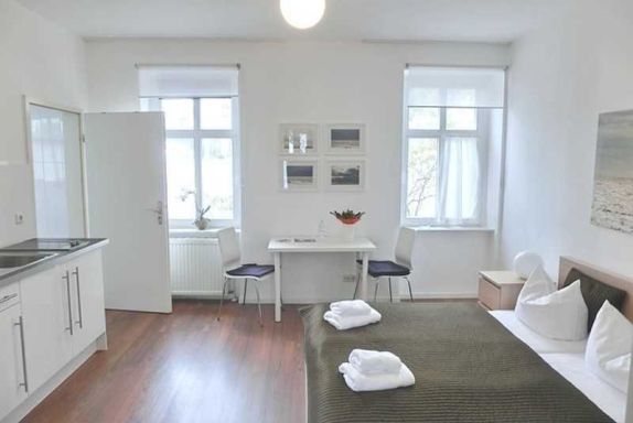 Es besteht aus einem Wohn-Schlafraum (Straßenseite) mit Sitzecke und Flat-TV, einer komplett ausgestatteten Küchenzeile und einem Bad mit Dusche und WC.