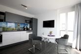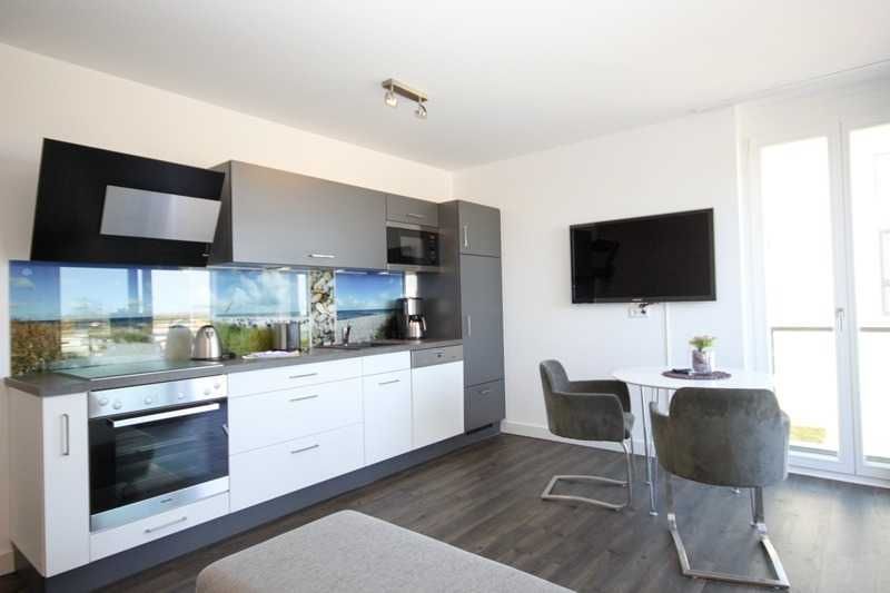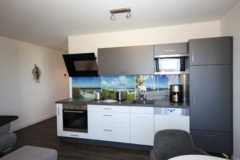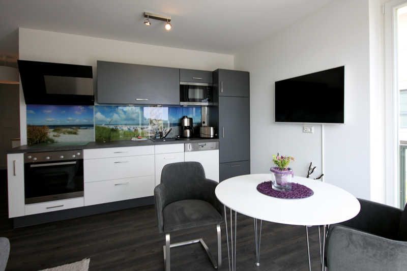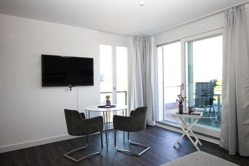 Diese hochwertige Ferienwohnung besteht aus einem Wohn- und Essbereich, einem Schlafraum sowie Balkon. Im Wohnbereich finden Sie eine bequeme Zweisitzer-Couch und einen Flatscreen-TV. Das Schlafzimmer bietet Ihnen ein großes Boxspringbett mit einer durchgehenden und angenehm weichen Matratze. Für weitere Bequemlichkeit sorgt hier ein begehbarer Kleiderschrank. Die offene Küche- mit rundem Esstisch und zwei bequemen Stühlen, lädt natürlich zum Essen oder zu einem Spieleabend ein. Die Küchenzeile überzeugt mit Geschirrspüler, Mikrowelle, Backofen, Cerankochfeld und Kühlschrank, inklusive Gefrierfach. Das großzügige Duschbad verfügt über eine bodengleiche Dusche, einen Handtuchwärmer, einen kompakten Waschtisch und einen Fön. Im Strandkorb auf dem eigenen Balkon in Nordausrichtung können Sie wunderbar relaxen. Für Ihr Fahrzeug steht ein kostenfreier Tiefgaragenplatz mit Aufzug bis zur Wohnungsetage bereit. Bitte beachten Sie die Durchfahrtshöhe von max. 1,90 m. Bei Überschreitung der maximalen Durchfahrtshöhe, besteht die Möglichkeit auf einen kostenpflichtigen Parkplatz in unmittelbarer Nähe auszuweichen. Ihre Fahrräder können im abschließbarer Fahrradraum der Tiefgarage im Gebäude sicher aufbewahrt werden. Noch einige Hinweise: Die Wohnung selbst ist eine Nichtraucherwohnung. Haustiere sind hier generell nicht erlaubt. Das kostenfreie WLAN in der Unterkunft ist ausschließlich für die Verwendung von Social Media und den Austausch von Bildern mit Familie und Freunden gedacht. Die Nutzung zum Streamen von Filmen ist nicht vorgesehen. Wäscheset, Kinderreisebett und Kinderhochstuhl können kostenpflichtig zugebucht werden. Eine Waschmaschine und ein Trockner stehen im Waschraum im Erdgeschoss des Objekts gegen Gebühr zur Verfügung (50 Cent- Münzen). Sichern Sie sich zusätzlich den Anspruch auf einen der begehrten Strandkörbe nur ein paar Meter entfernt von den rauschenden Wellen der Ostsee (Anfang Mai - Ende August) und buchen Sie jetzt zu besonderen Konditionen (12,00 € pro Tag oder 75,00 € pro Woche.)