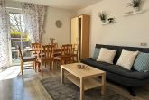 * Wohnzimmer mit offener Küche, gemütliche Couch, Eßecke, SAT-TV