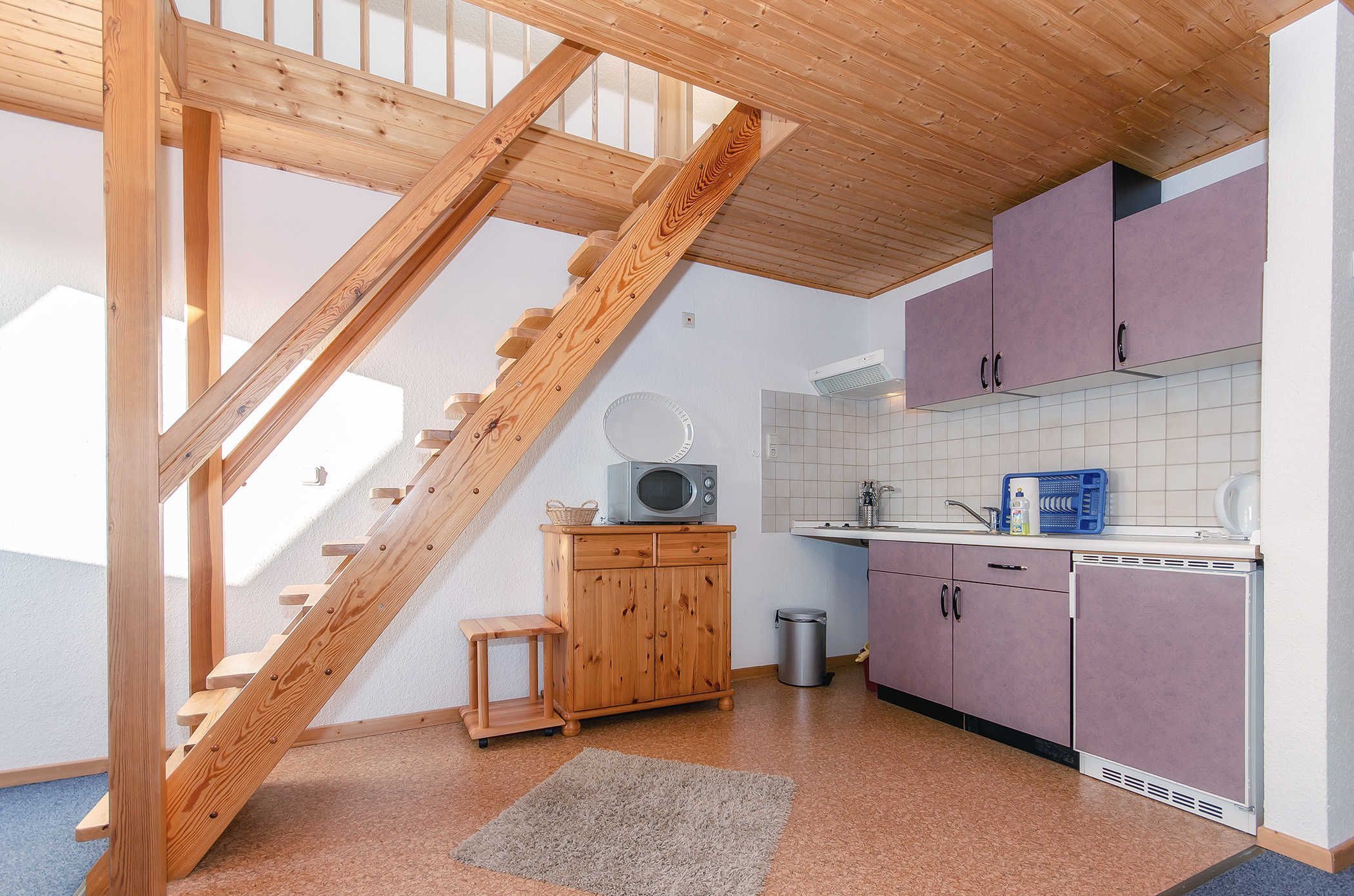 * Über eine steile Treppe im Wohnzimmer erreicht man den