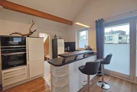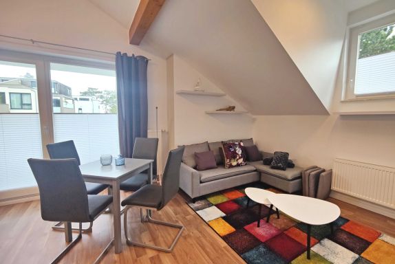 Die im Jahr 2022 frisch renovierte und eingerichtete Zweizimmerwohnung ist 55 m² groß und verfügt über einen Balkon. Das Wohnzimmer ist modern und komfortabel eingerichtet. Die offene Küche lässt keine Wünsche offen. Das Schlafzimmer ist mit einem Doppelbett und einem Doppelstockbett als Aufbettungsmöglichkeit ausgestattet. Besonders für die kalte Jahreszeit glänzt diese Wohnung mit einer eigenen kleinen Sauna im Münzbetrieb. Somit ist die Wohnung der ideale Ausgangspunkt für einen entspannten Urlaub an der Ostsee.