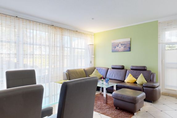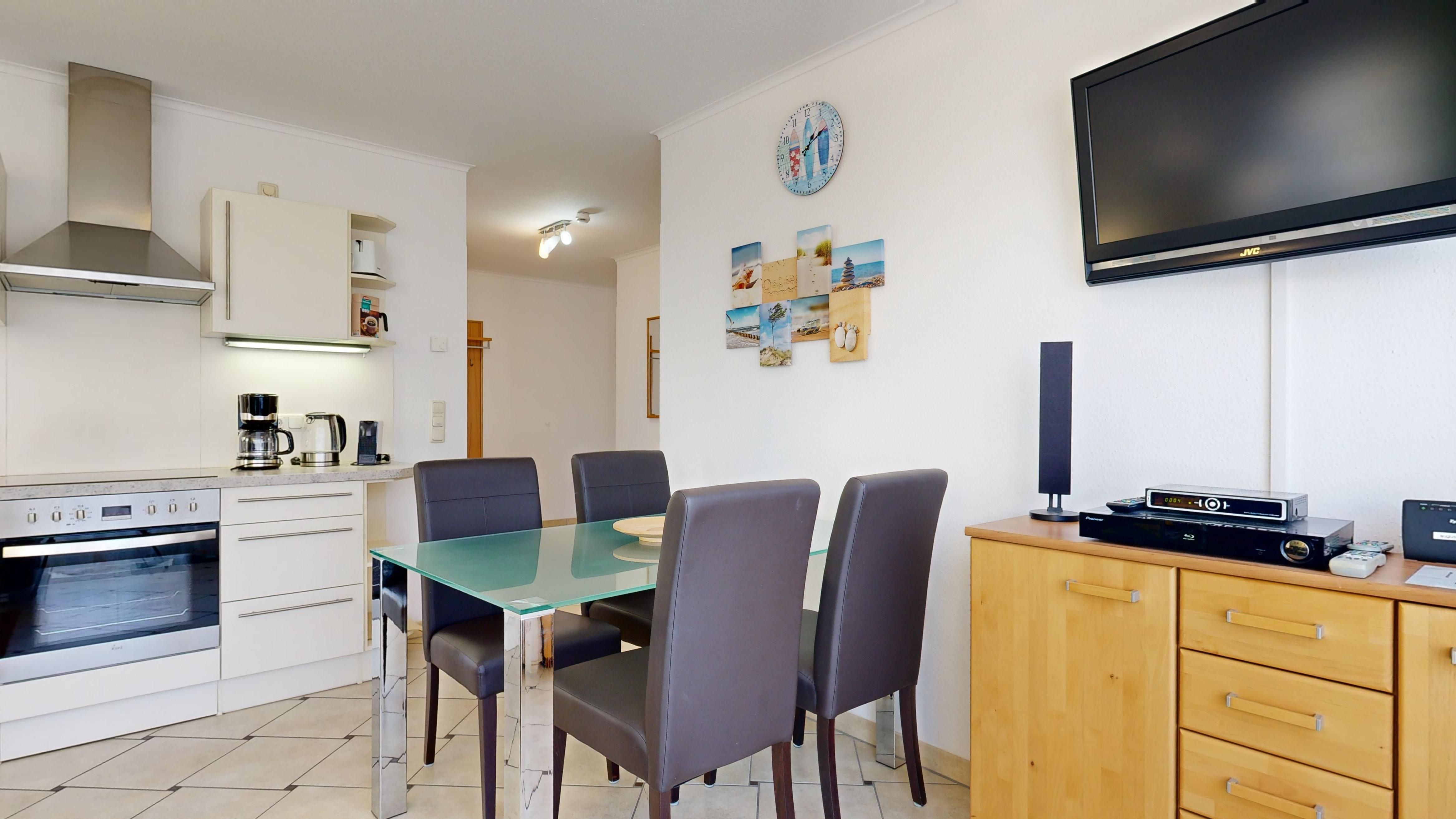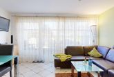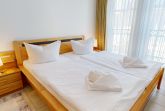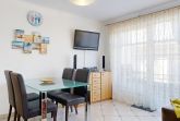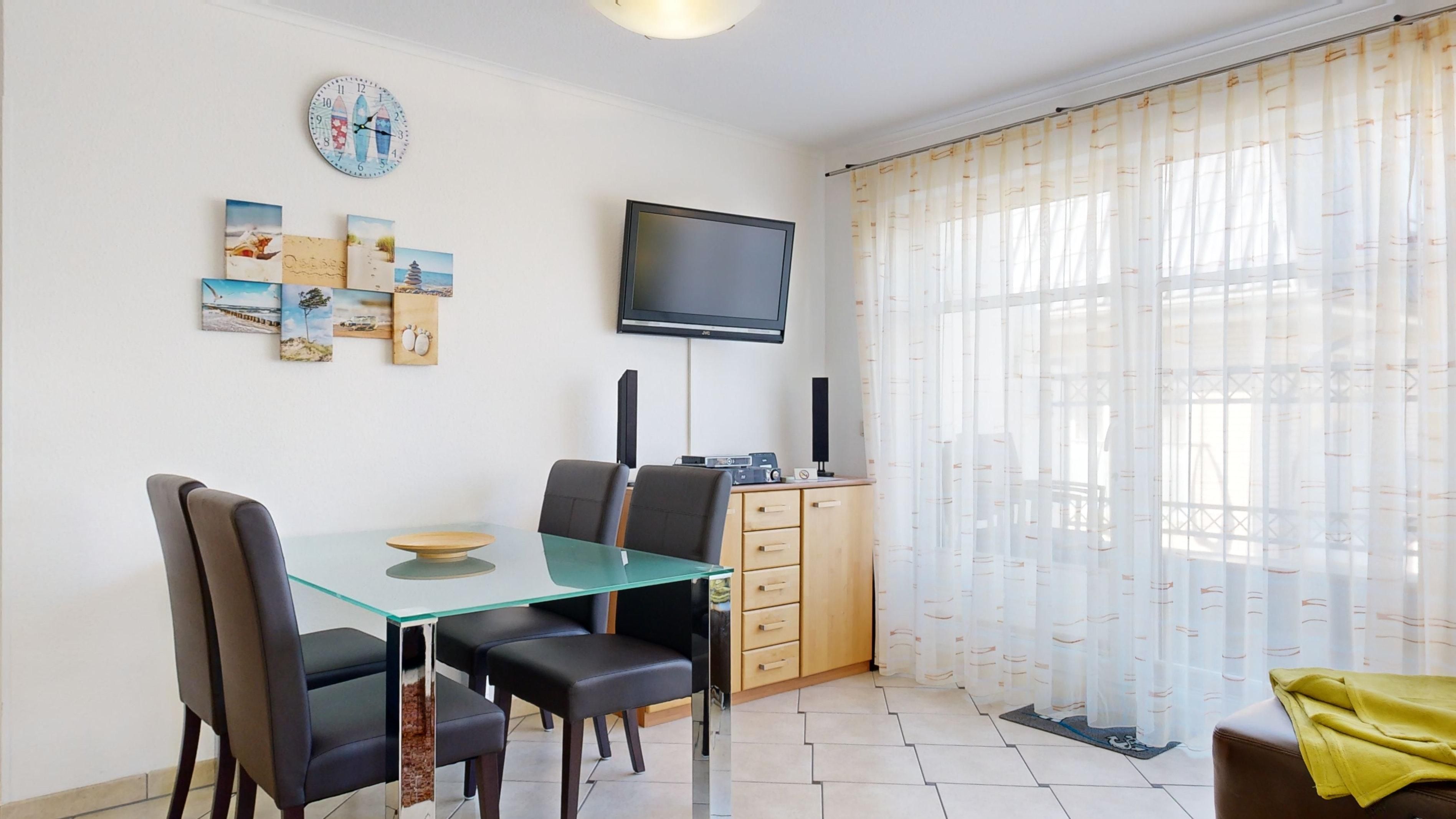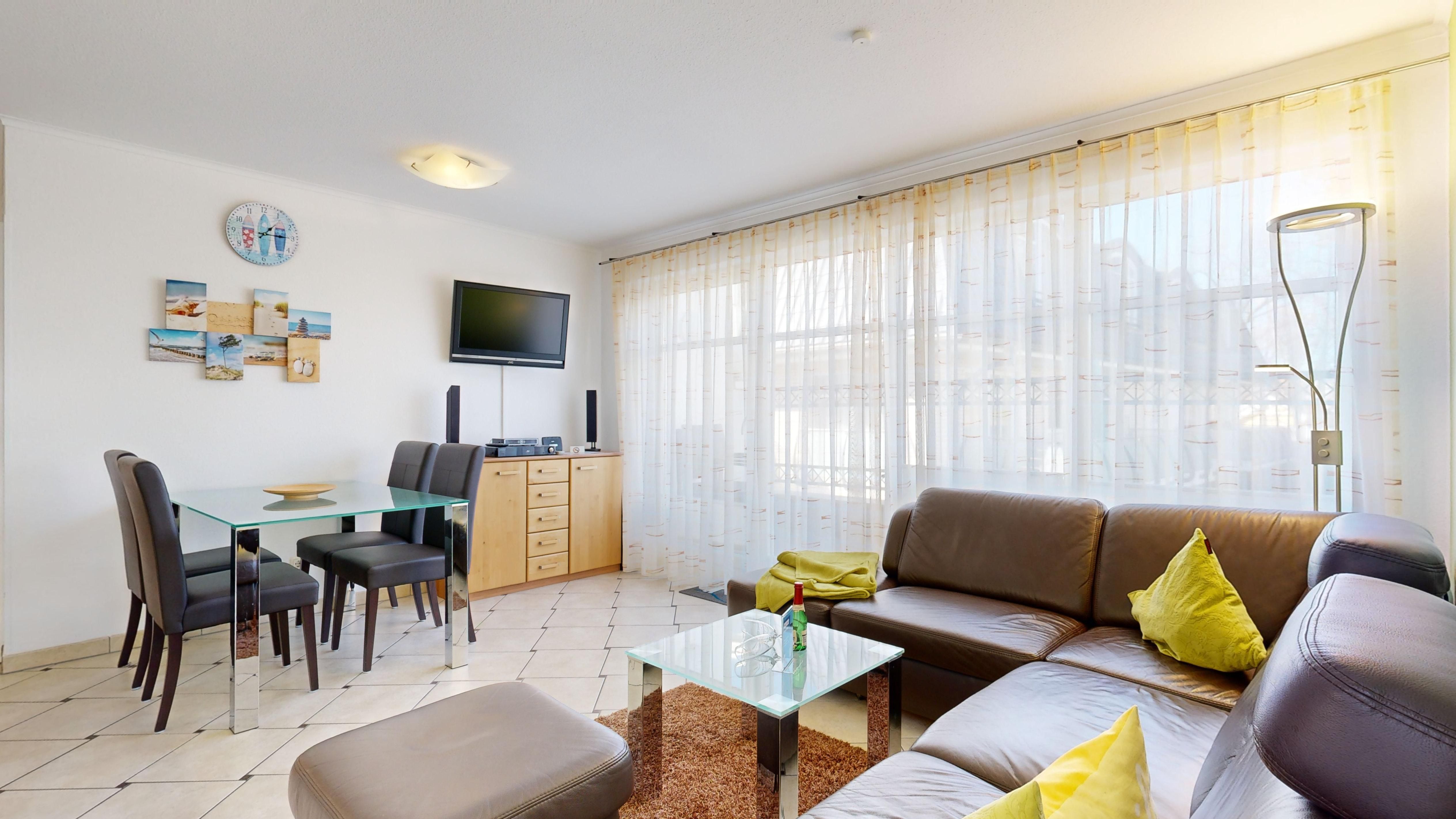 Die Ferienwohnung befindet sich in der 1. Etage (3 Zimmer / 58 m²) und hat 2 Schlafzimmer. Eine Sauna, Tiefgarage und Fahrstuhl befinden sich im Haus.