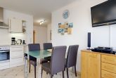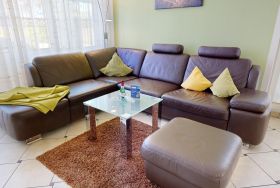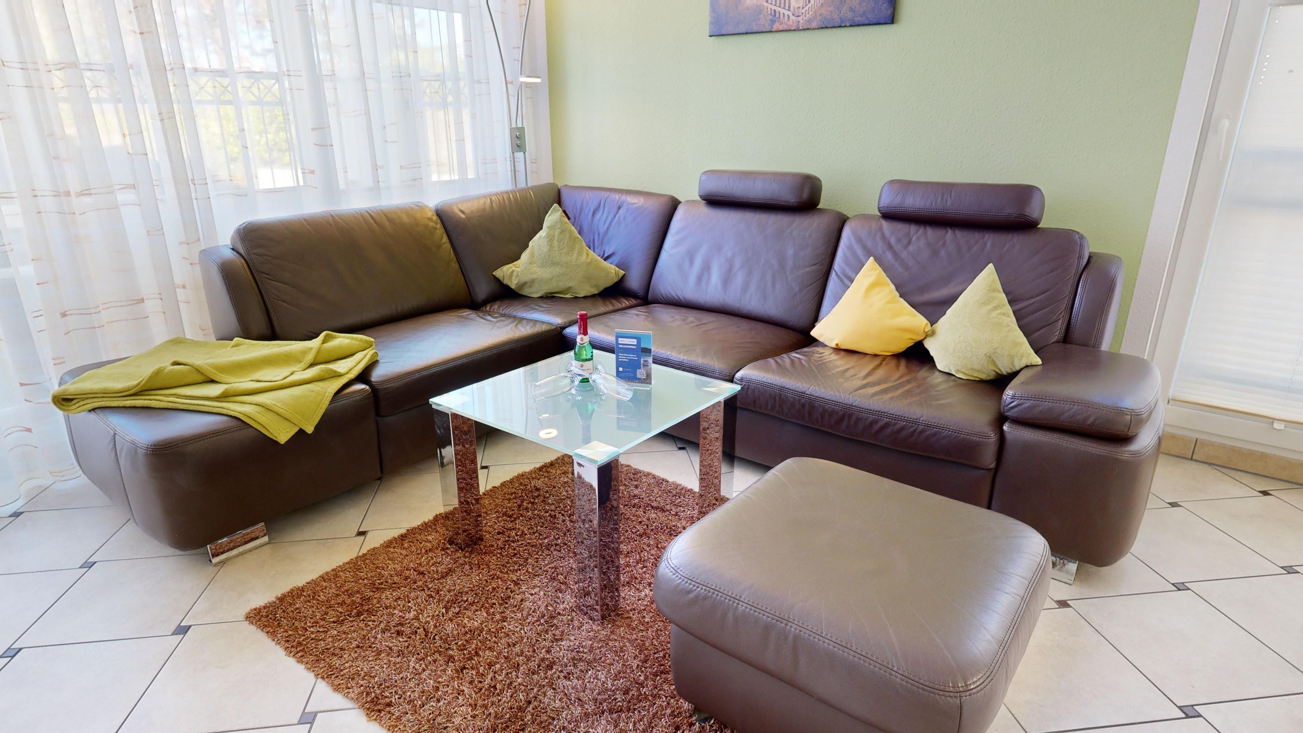 Wohnzimmer: Ledereckcouch, SAT-TV, Radio mit CD, Internet per USB-Stick und Esstisch