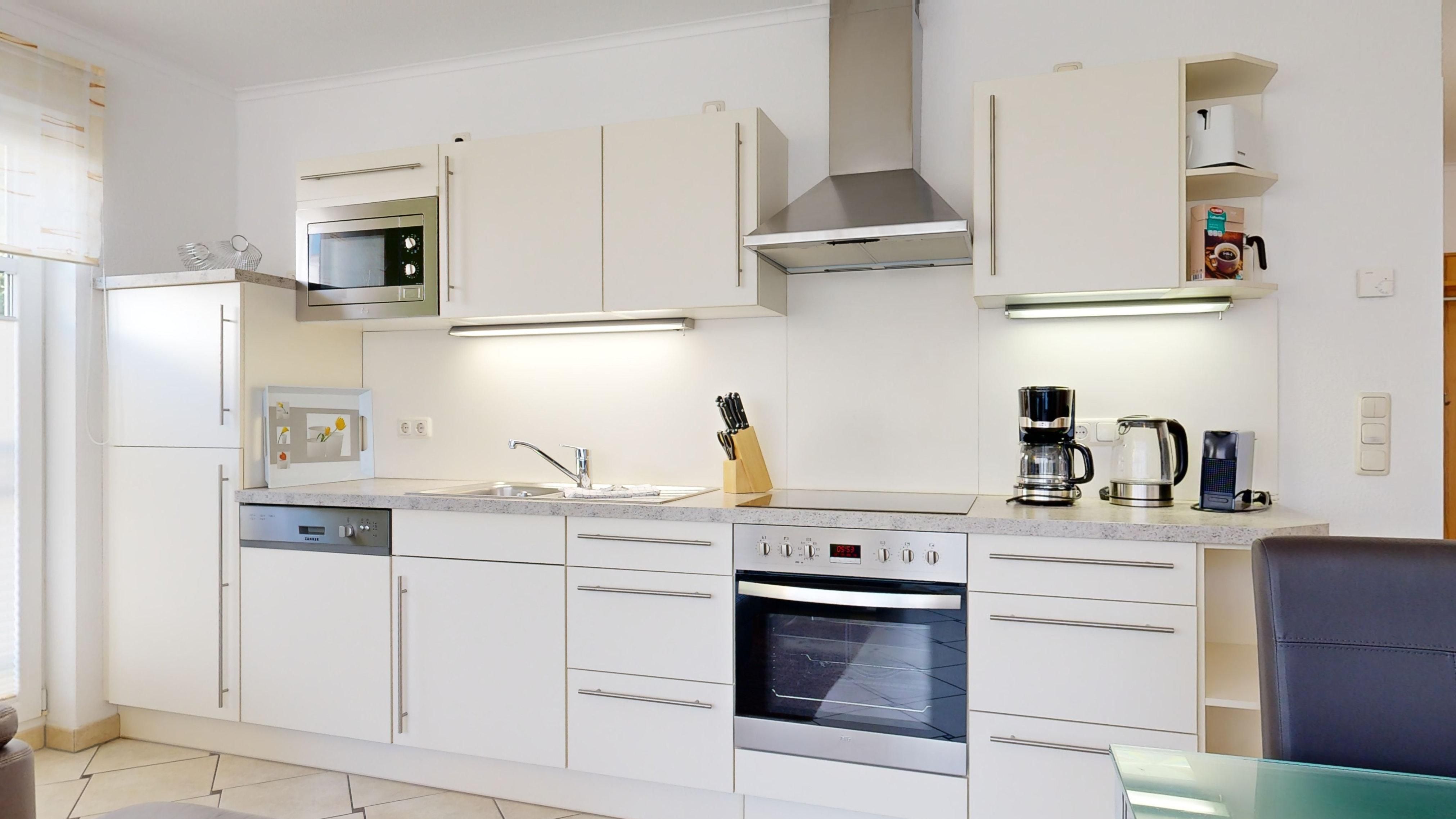 Küche: Ceranherd, Backofen, Spülmaschine, Mikrowelle, Dunstabzug, Kaffeemaschine, Toaster, Wasserkocher