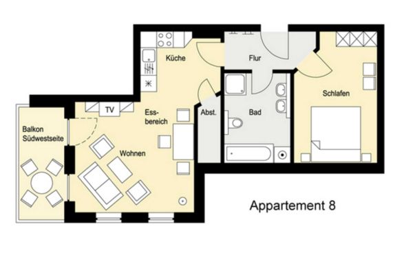 Appartement 8, 2.OG, (ca. 54 qm, max. 4 Personen) 1 separates Schlafzimmer, 1 Wohn- Schlafzimmer mit Wohnküche und Essbereich, Bad (Dusche + Badewanne), Abstellraum, Balkon Südwestseite, Telefon, Flat-TV, Waschmaschine, Fön, W-LAN