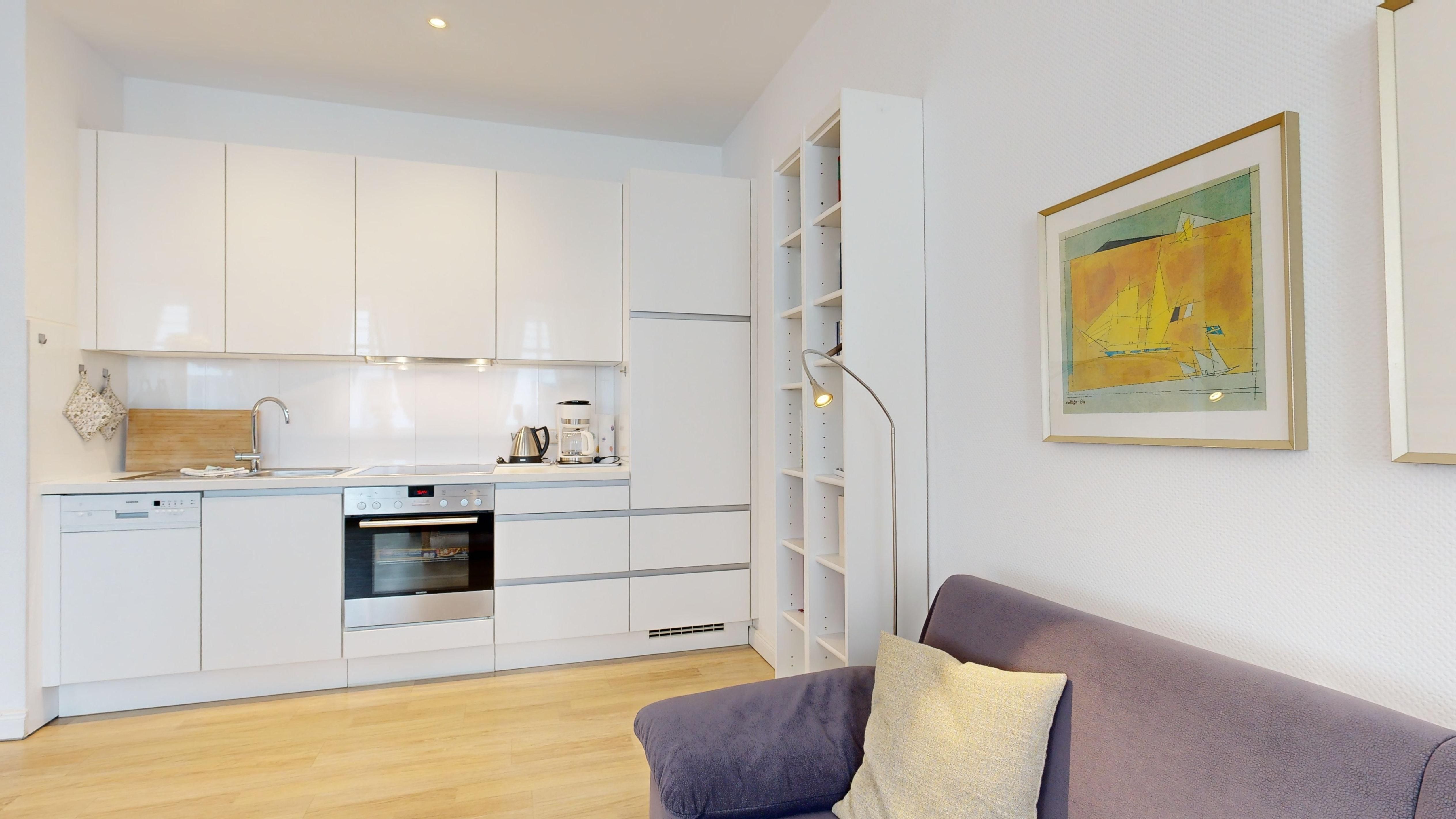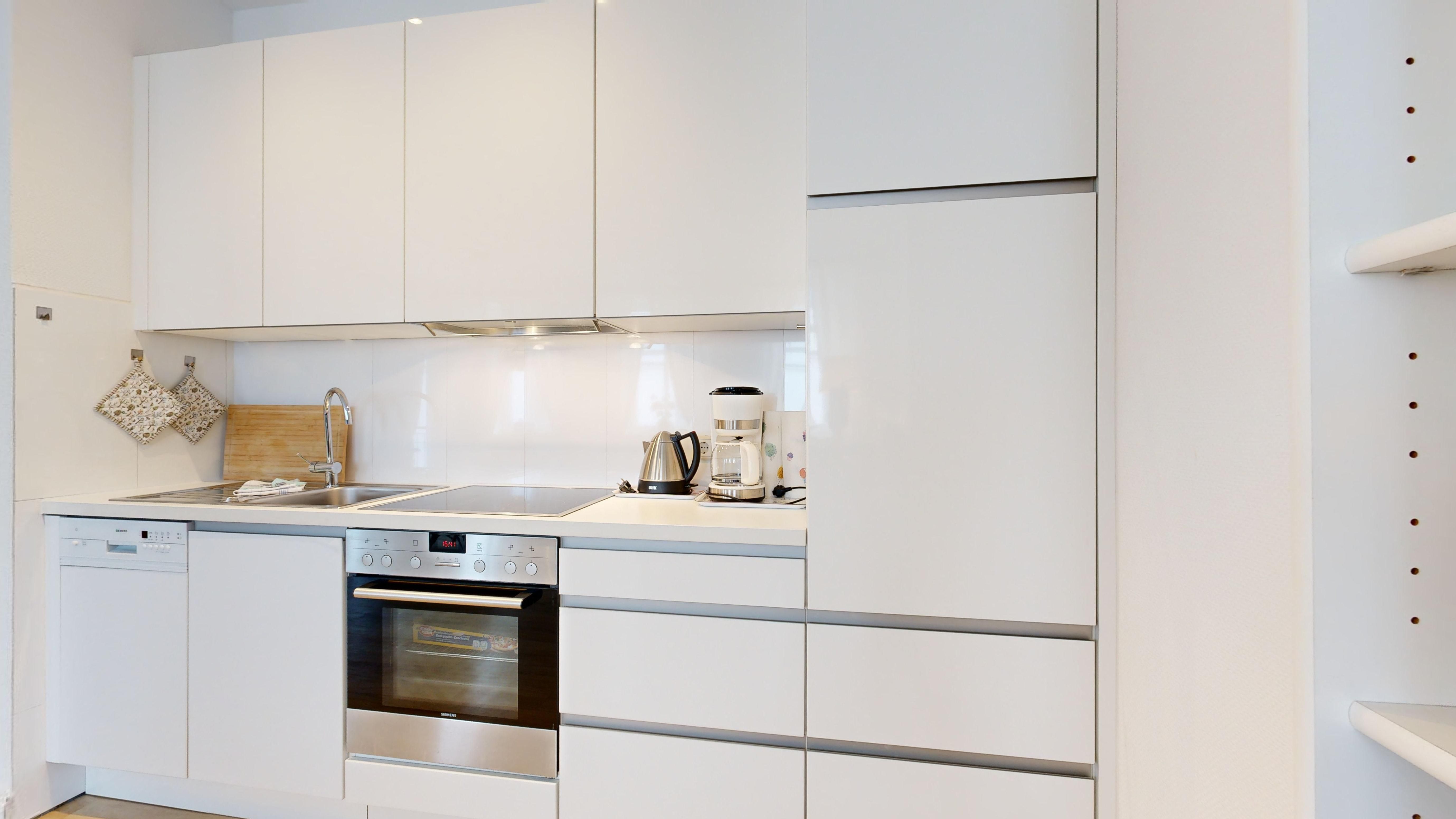 * Küche: Moderne Küchenzeile, E-Herd mit Backofen, Spülmaschine und Nespresso-Maschine, Wasserkocher, Toaster