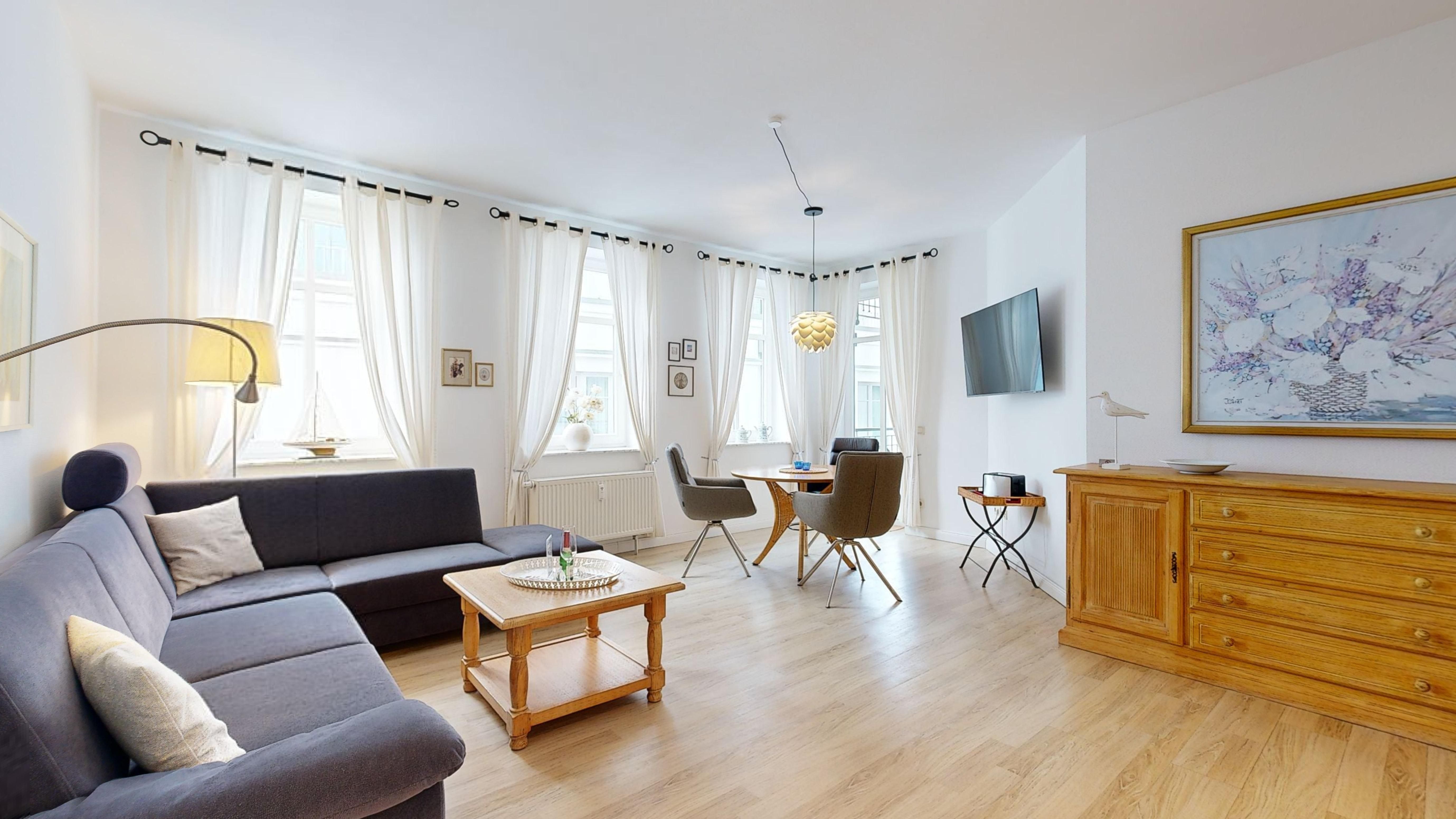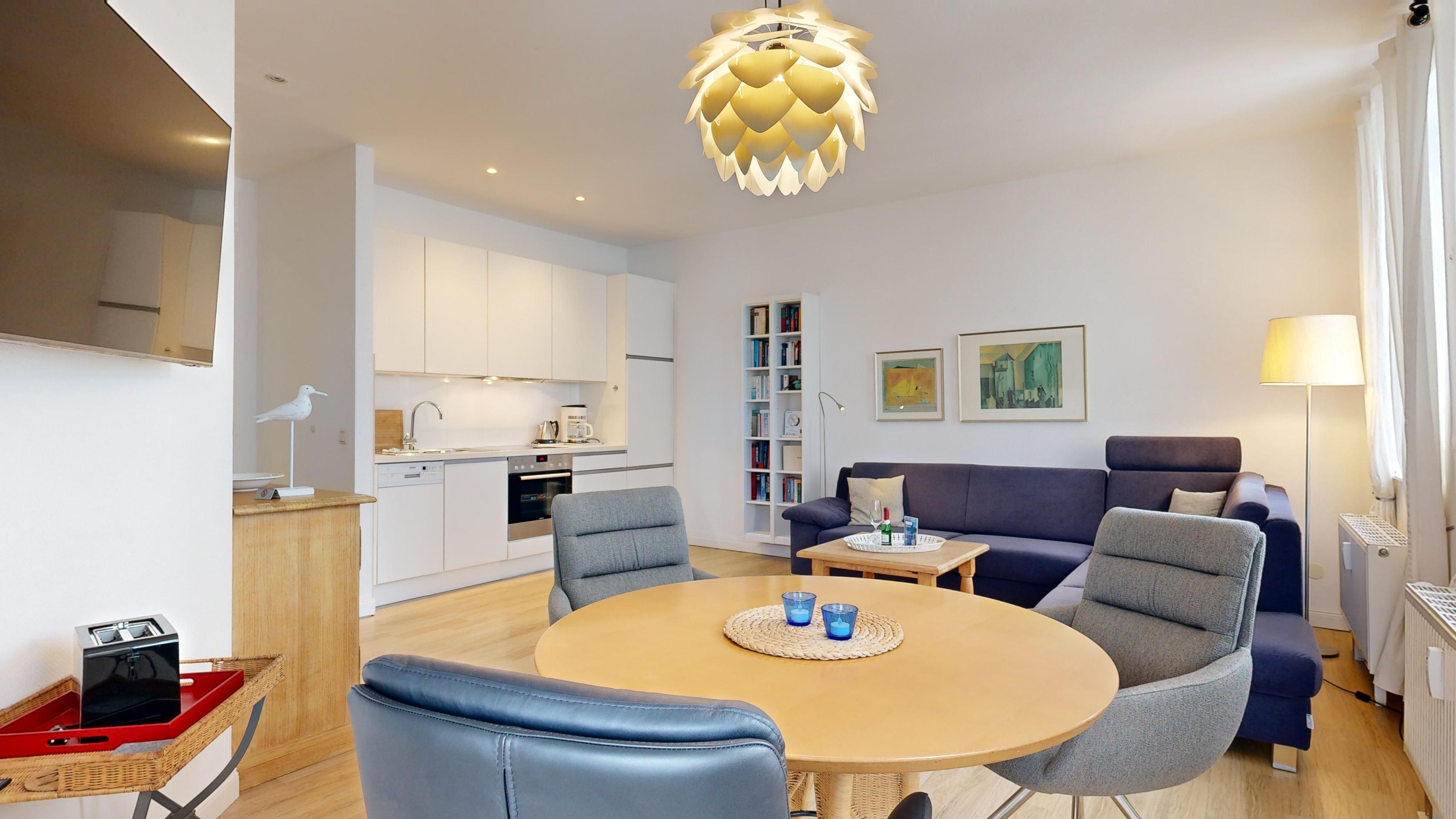 * Wohnzimmer: Couchgarnitur (Schlafgelegenheit für eine Person), Kabel-TV, Radio mit CD, Essplatz, W-LAN-Internetanschluss