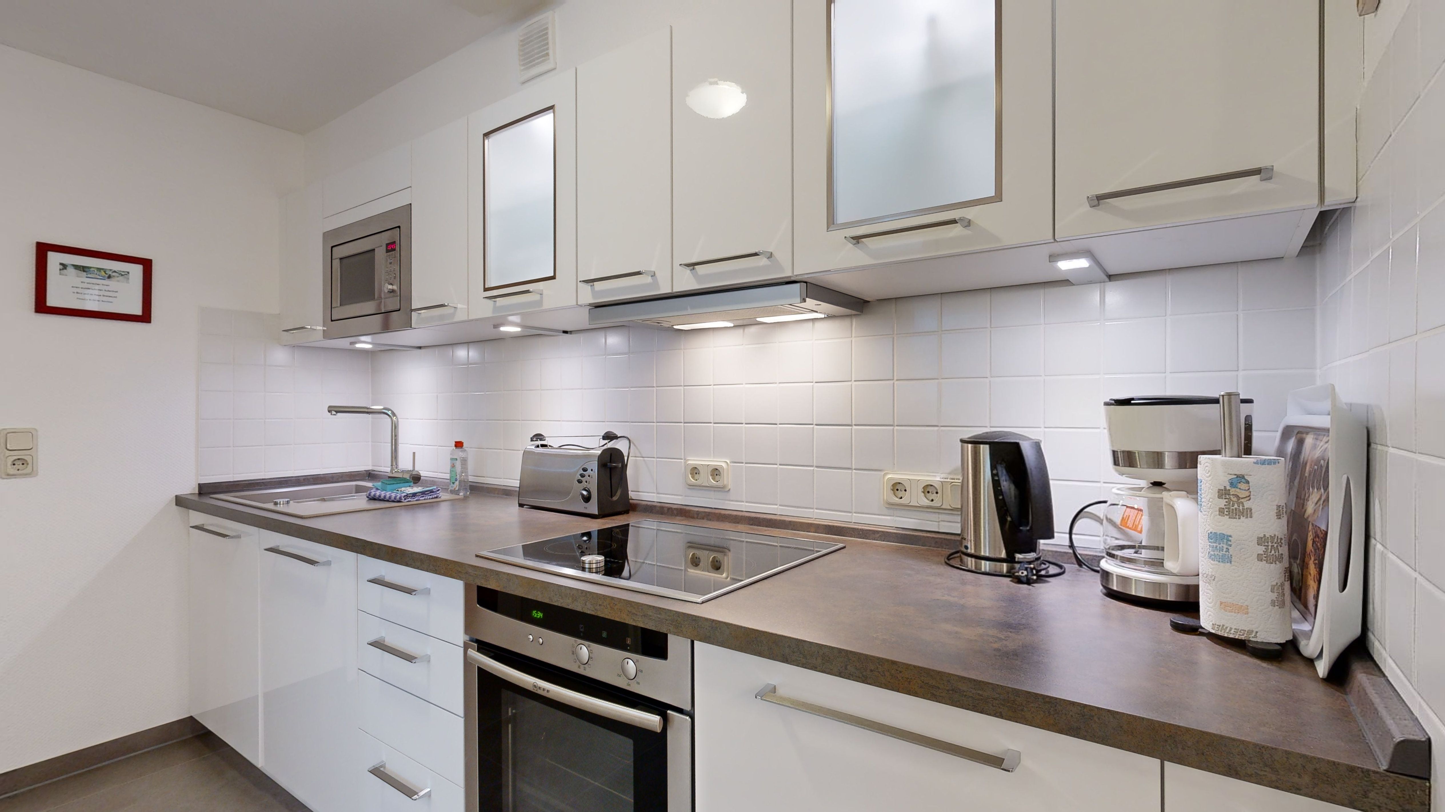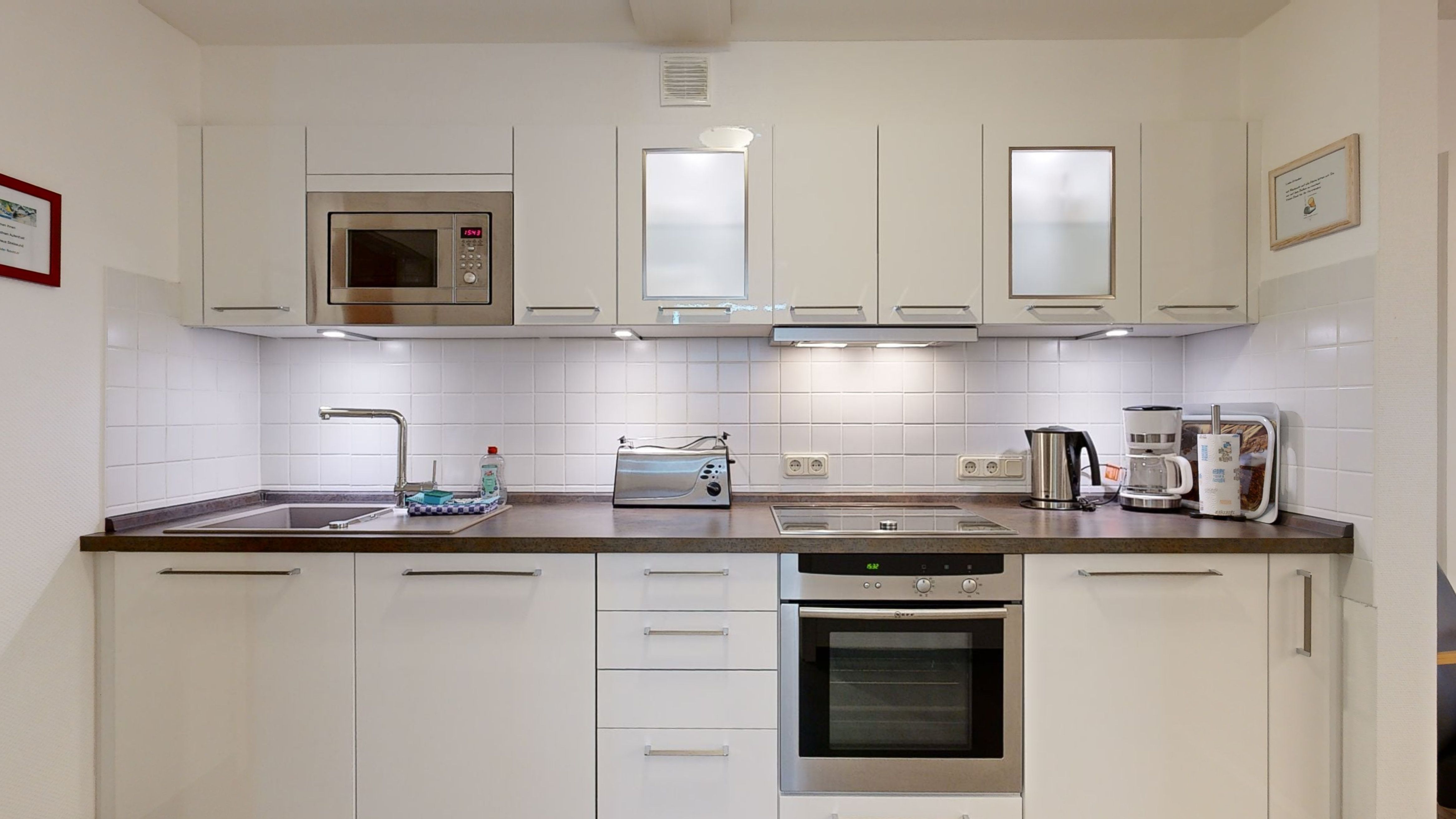 * Küche: Moderne Küchenzeile, Induktionsherd mit Backofen, Spülmaschine, Mikrowelle, Backofen, Wasserkocher, Kaffeemaschine, Toaster