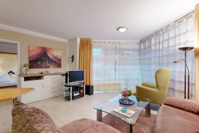 Komfort-Ferienwohnung im Haus Strelasund in der 1. Etage (3 Zimmer / 62 m²) mit zwei Schlafzimmern und einem seitlichen Balkon mit Meerblick. Das Haus liegt direkt an der Strandpromenade