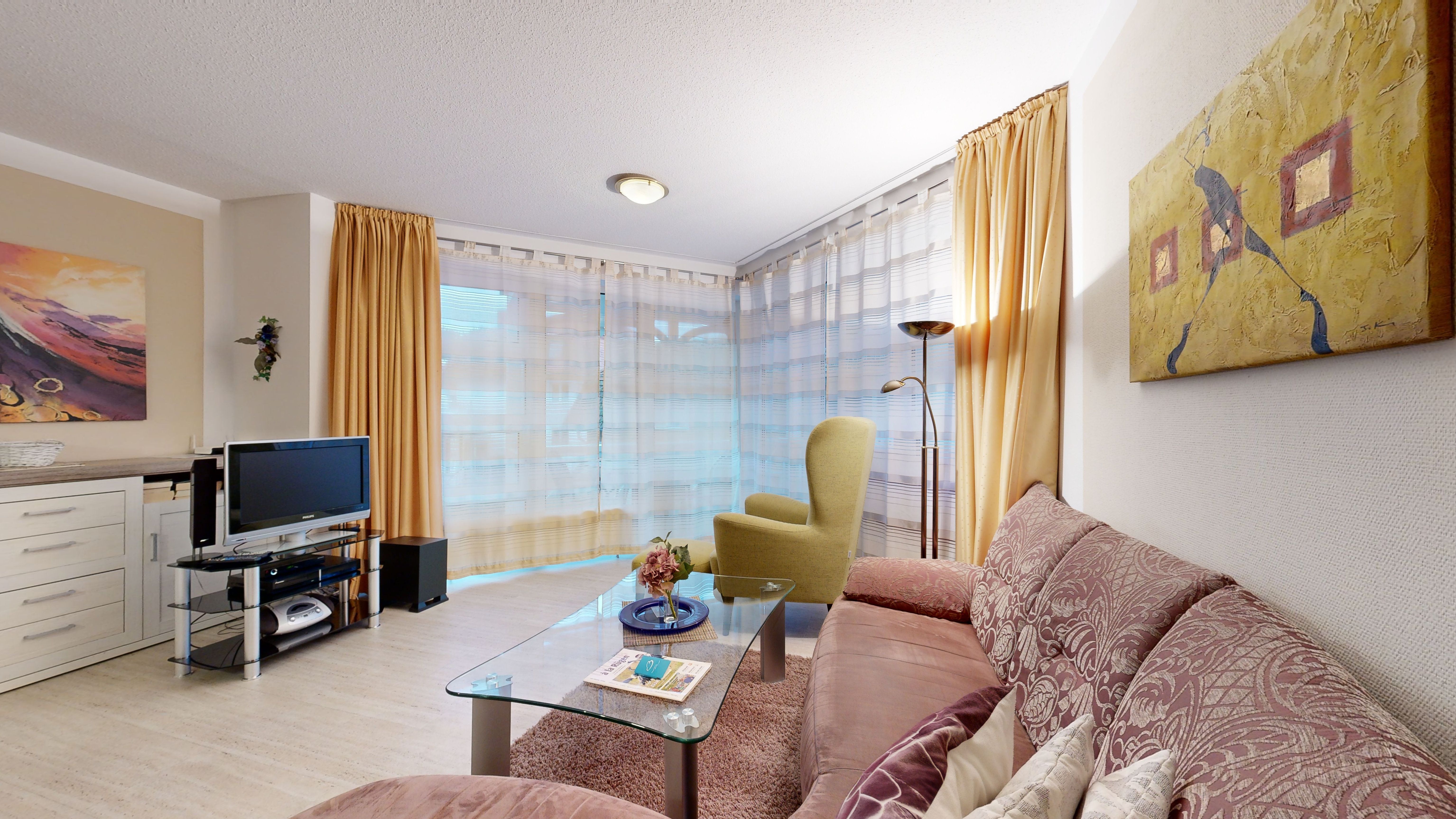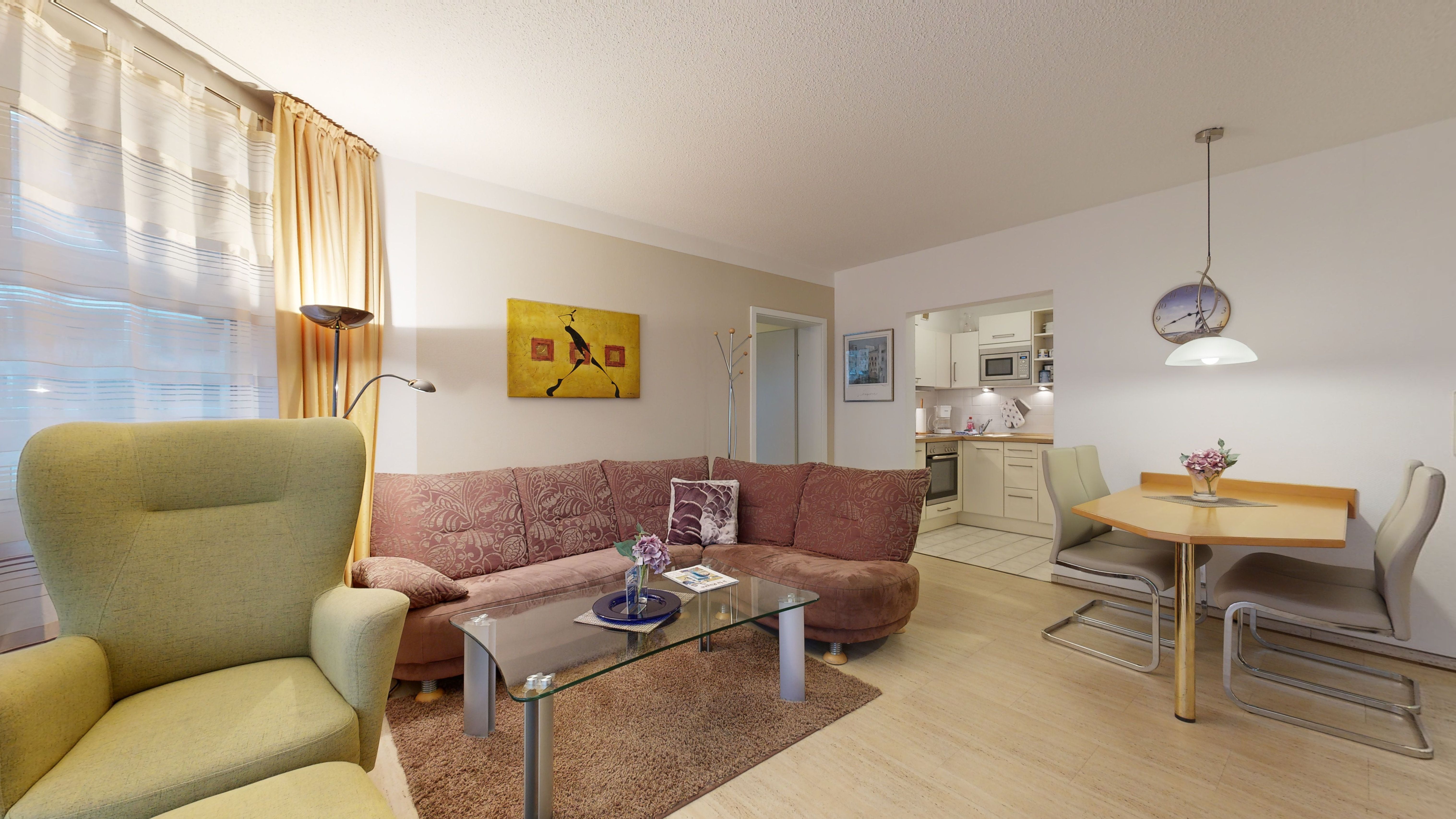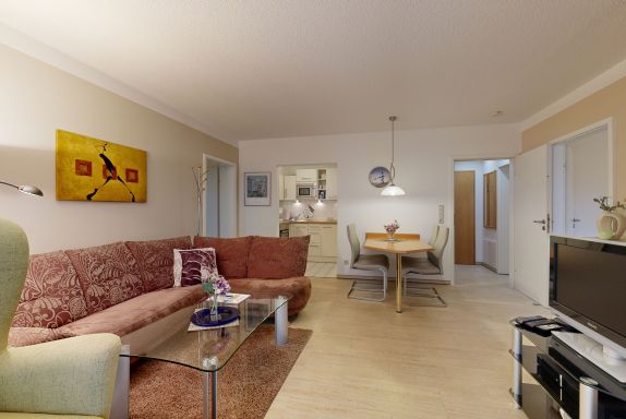 * Wohnzimmer: Couchgarnitur, Kabel-TV, Radio, DVD-Player und Internetzugang (WLAN oder Kabel möglich) und Essplatz