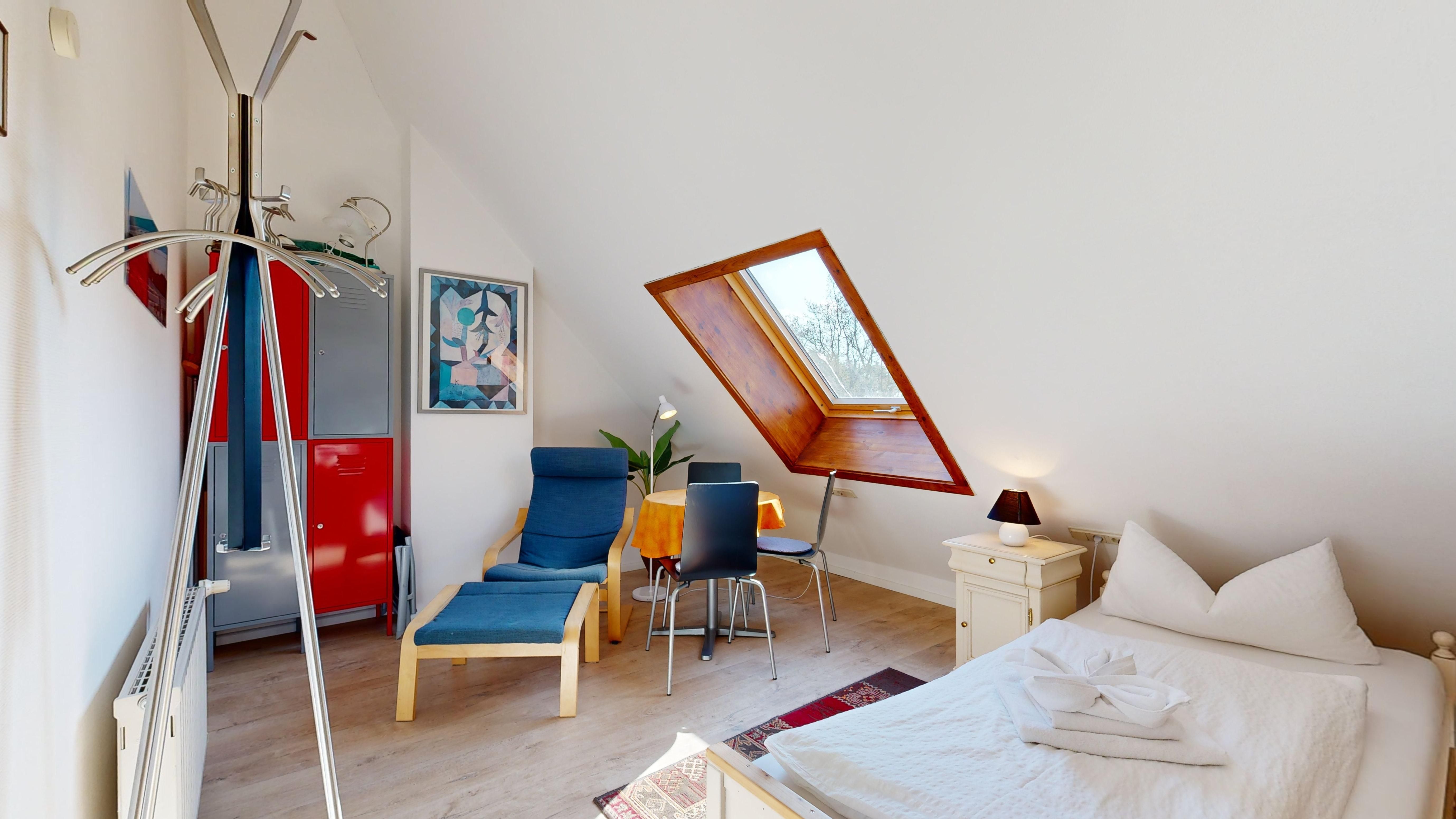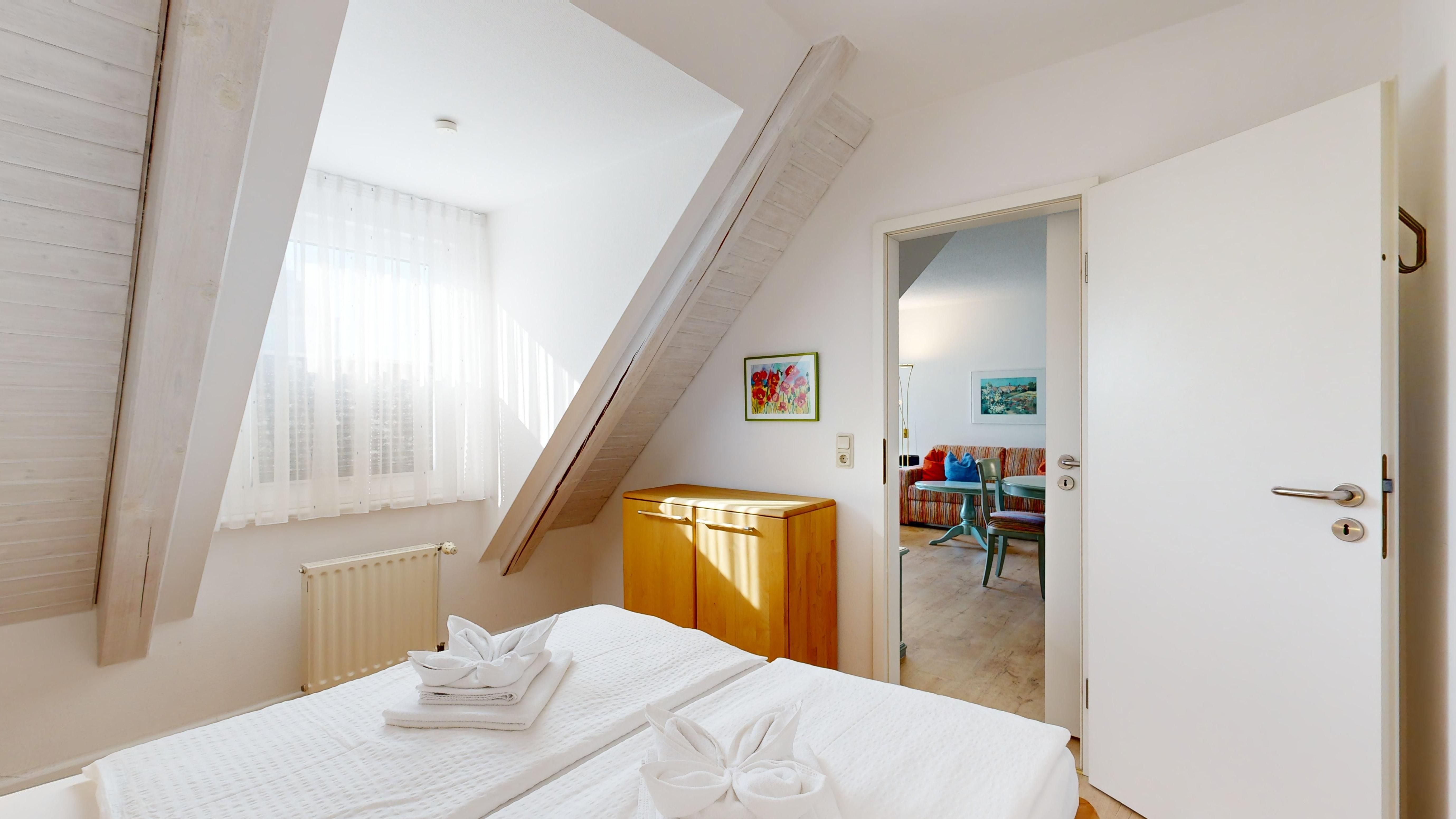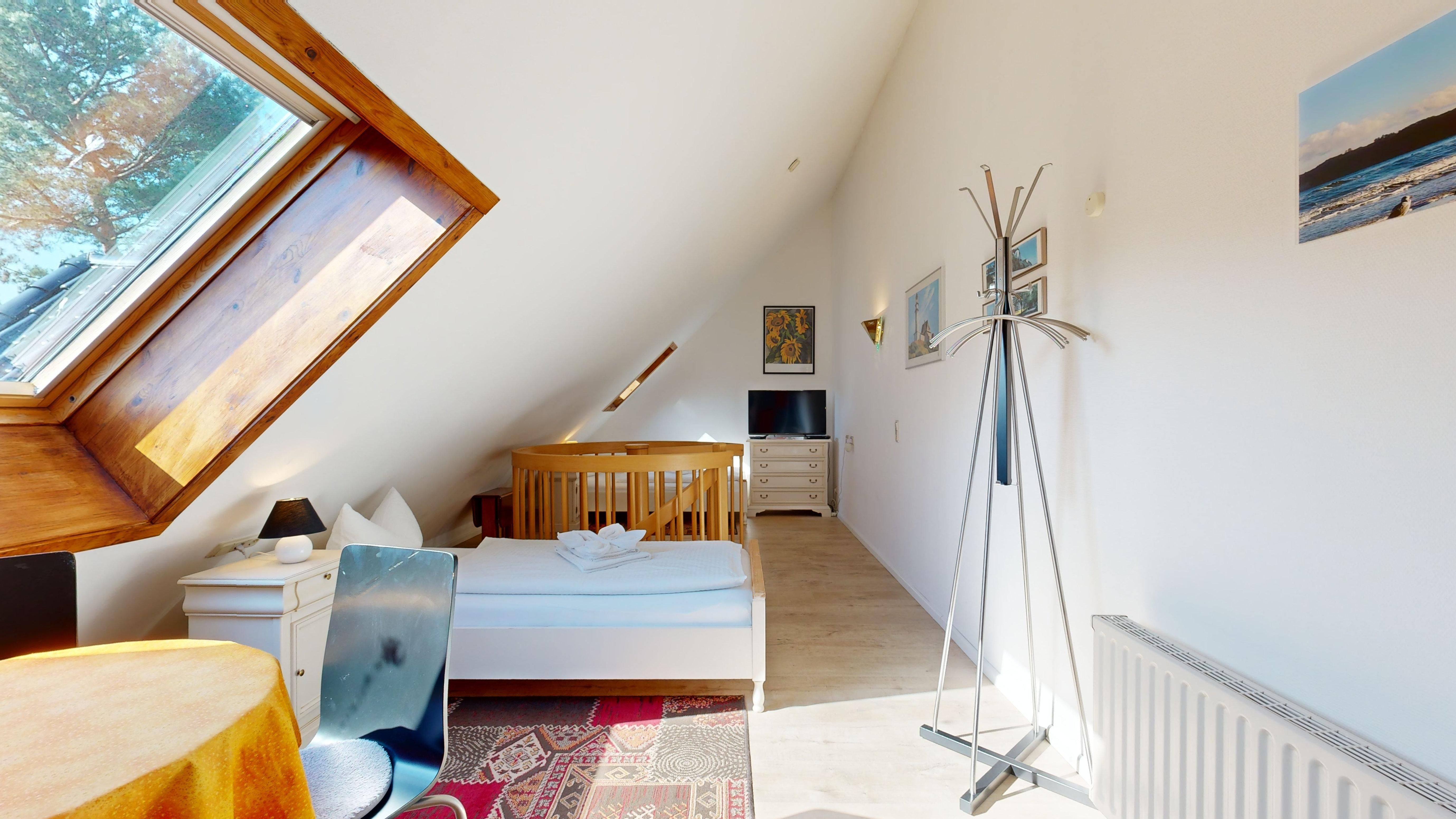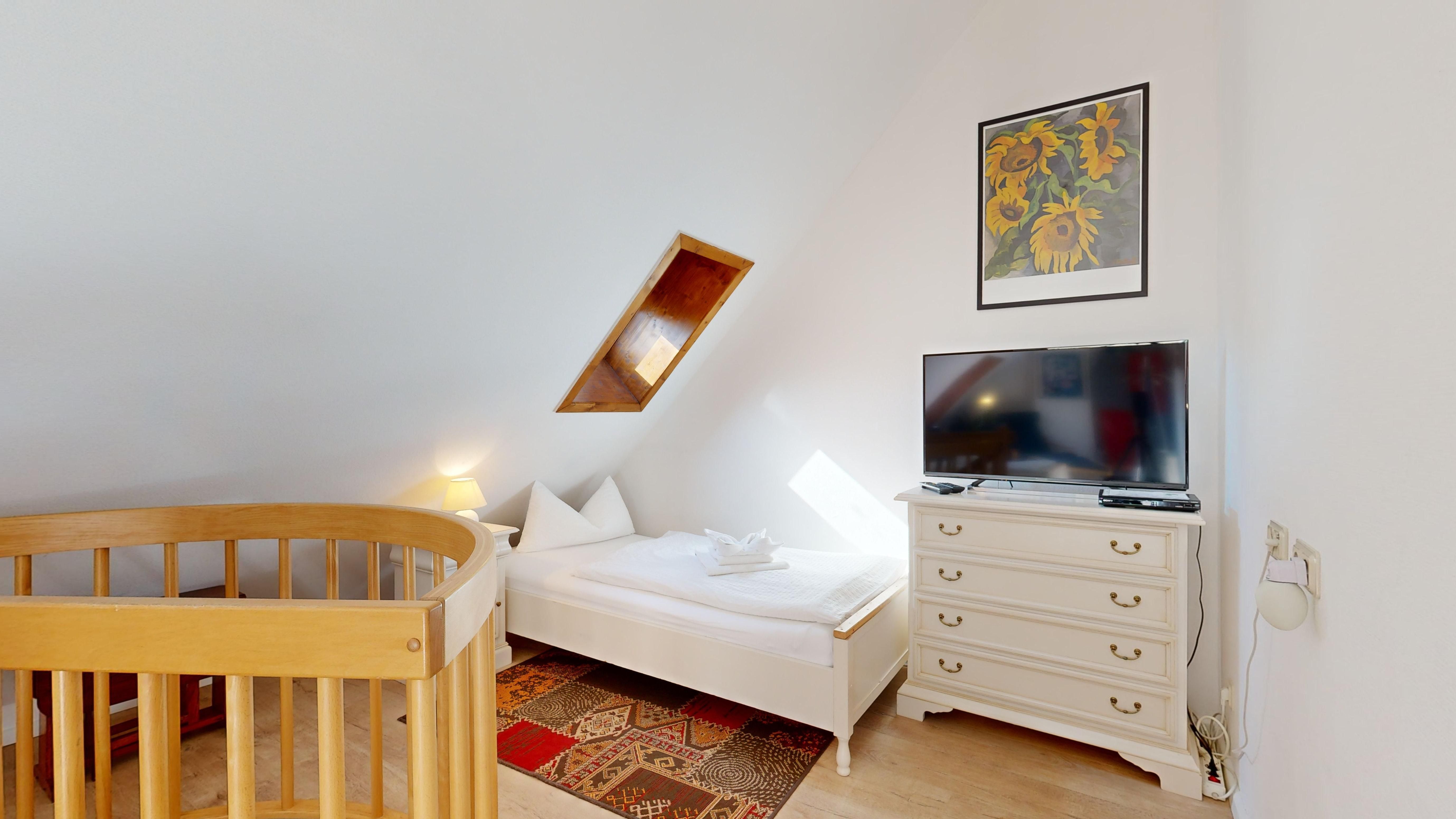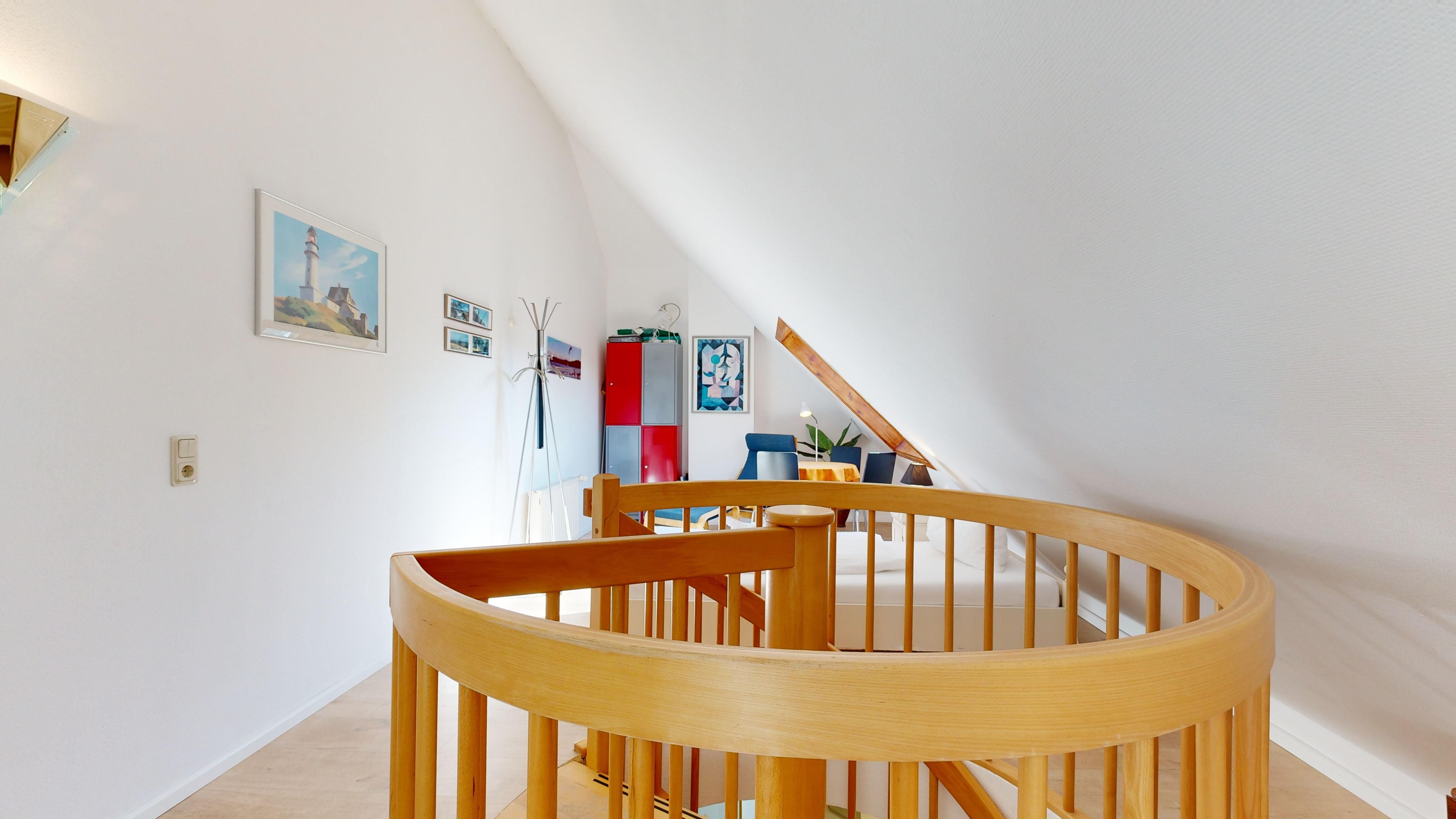 über eine Wendeltreppe mit offenen Zugang gelangen Sie ins Dachgeschoss, wo sich das Schlafzimmer mit den zwei Einzelbetten und dem zusätzlichen TV befindet
