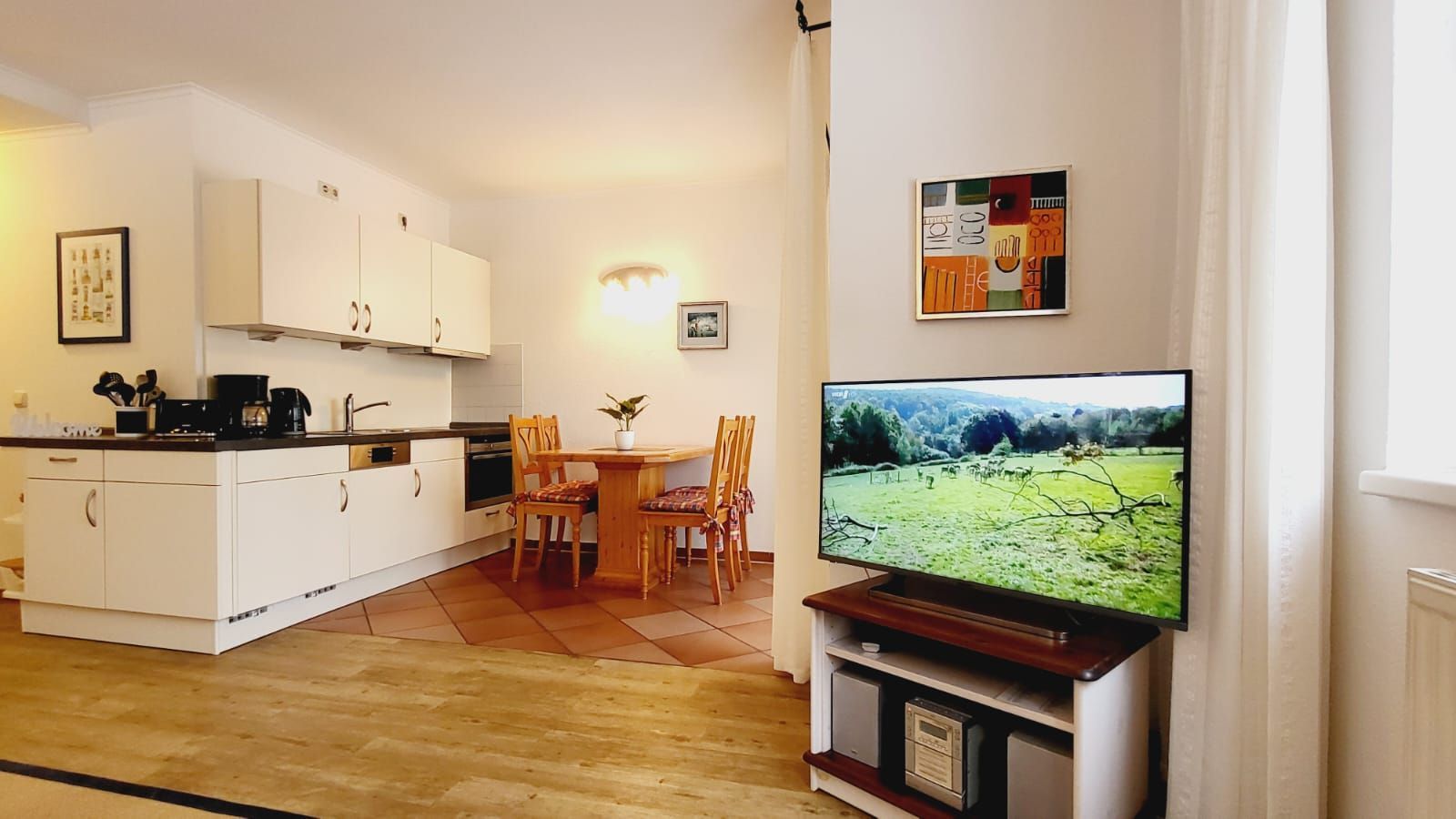 - Wohn/Schlafbereich mit Schlafcouch, integrierter Küche und Essplatz