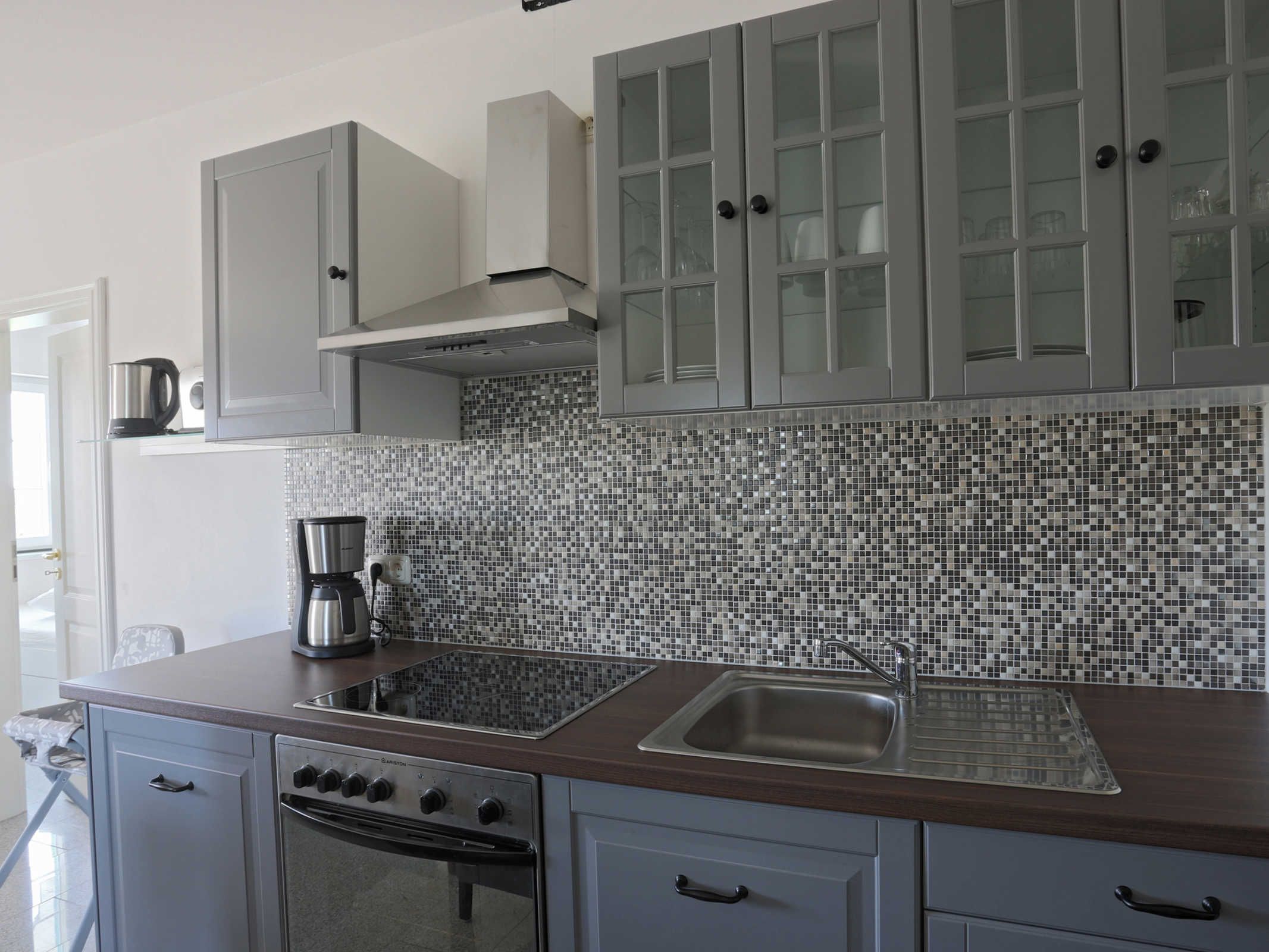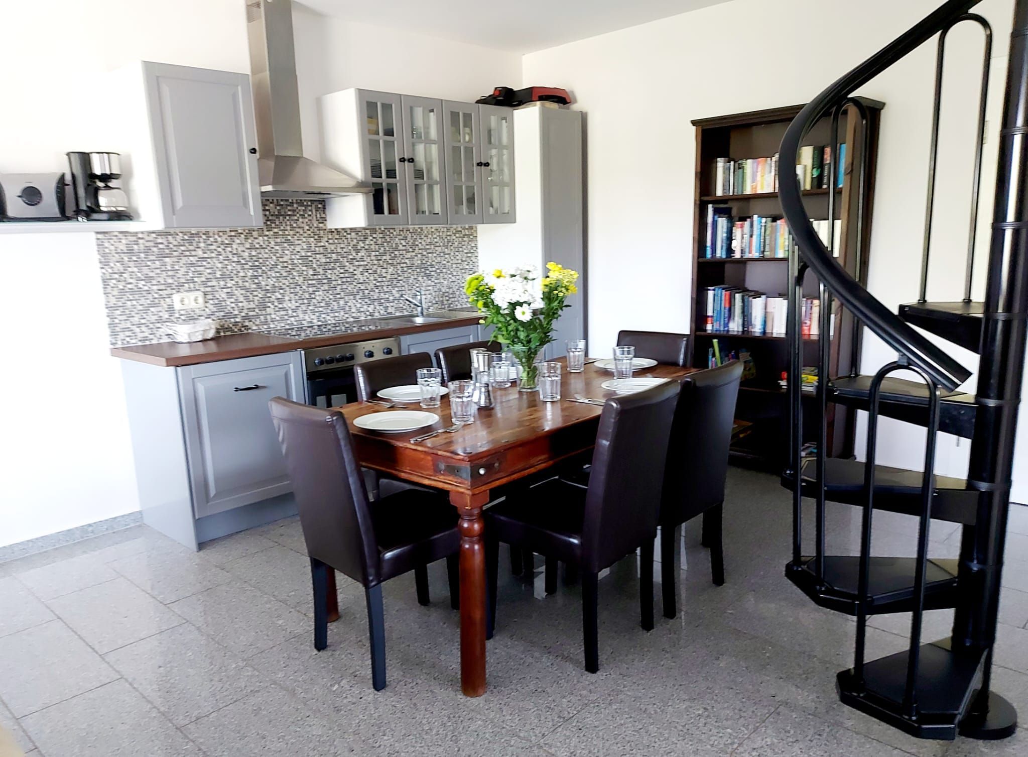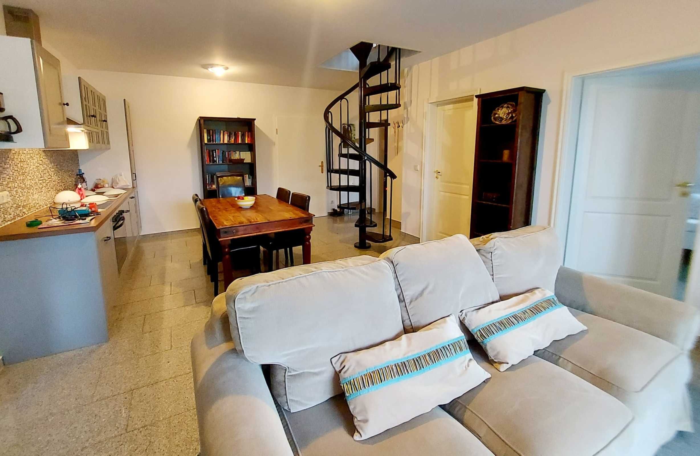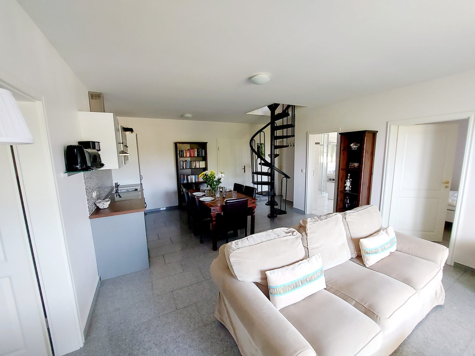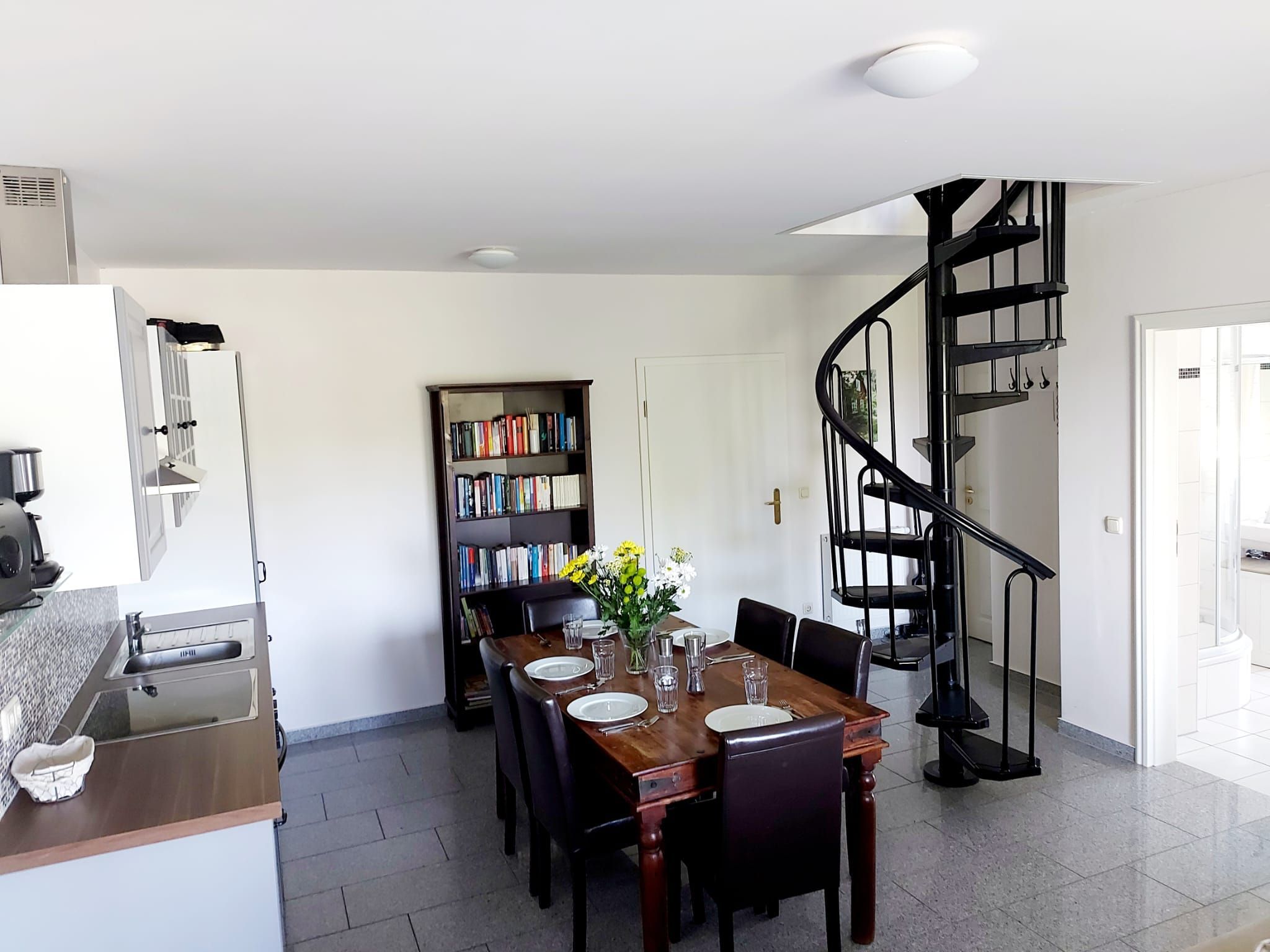 Die Maisonettewohnung verfügt über einen Balkon mit Panoramablick, einen offenen Wohn- und Küchenbereich mit großem Esstisch und einer gut ausgestatteten Küche mit Geschirrspüler, Ceranfeld, Backofen, Kühlschrank, Kaffeemaschine, Mikrowelle, Wasserkocher, Saftpresse und Toaster.