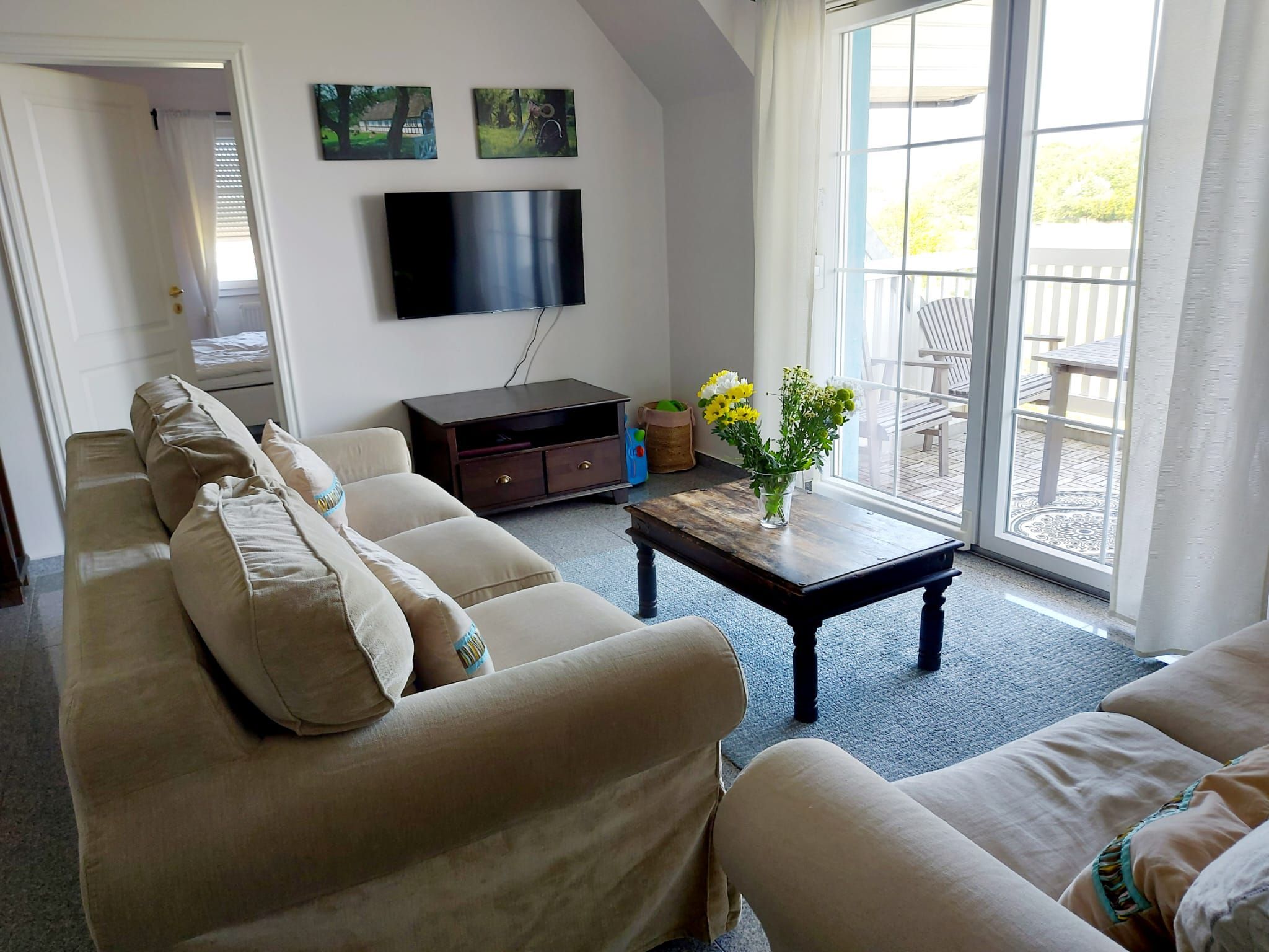Es stehen drei Schlafzimmer mit Doppelbetten zur Verfügung, wovon ein Schlafzimmer mit einem zusätzlichen Flachbild TV und ein weiteres Schlafzimmer mit einer ruhigen Leseecke ausgestattet ist.