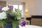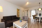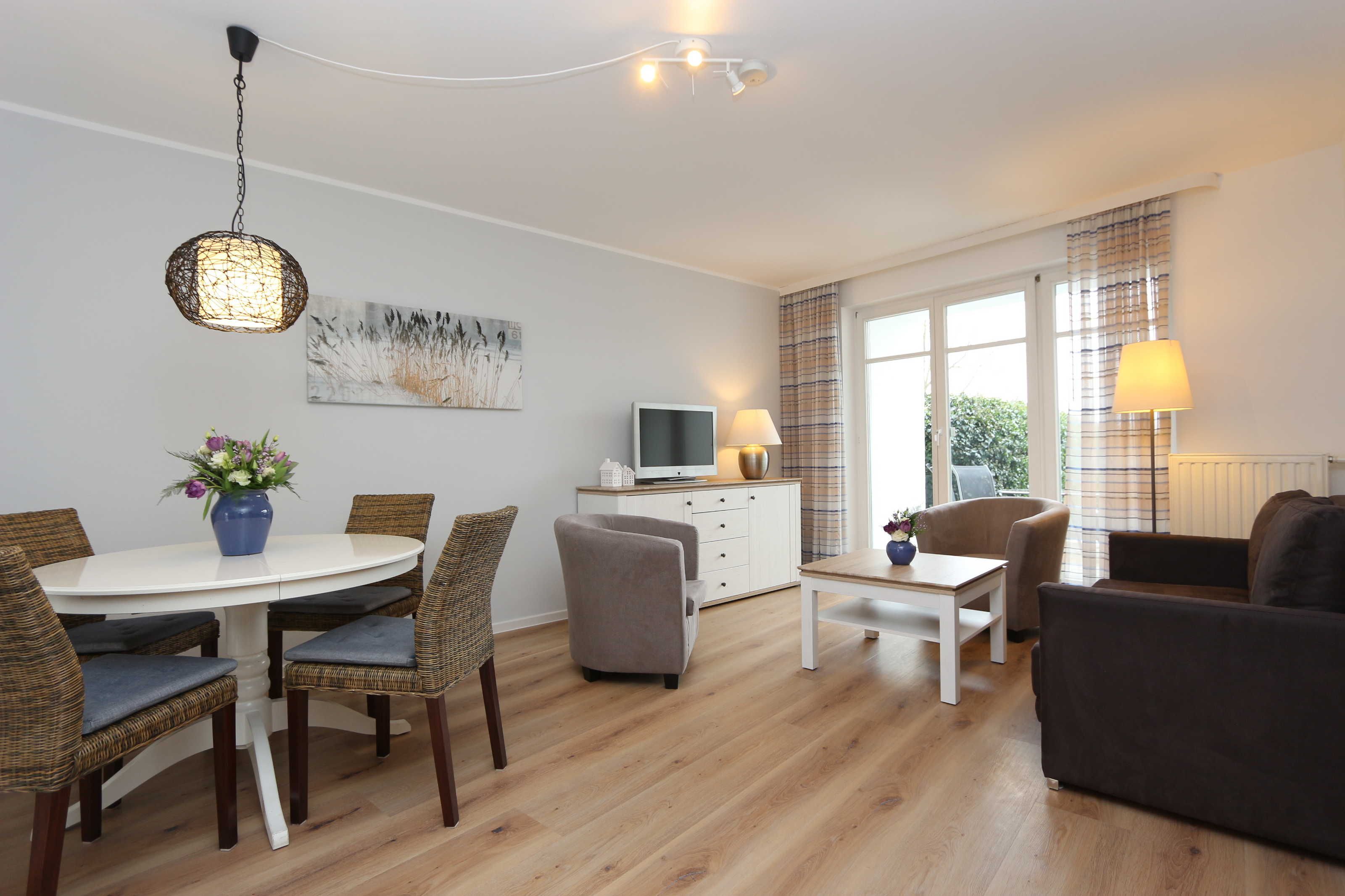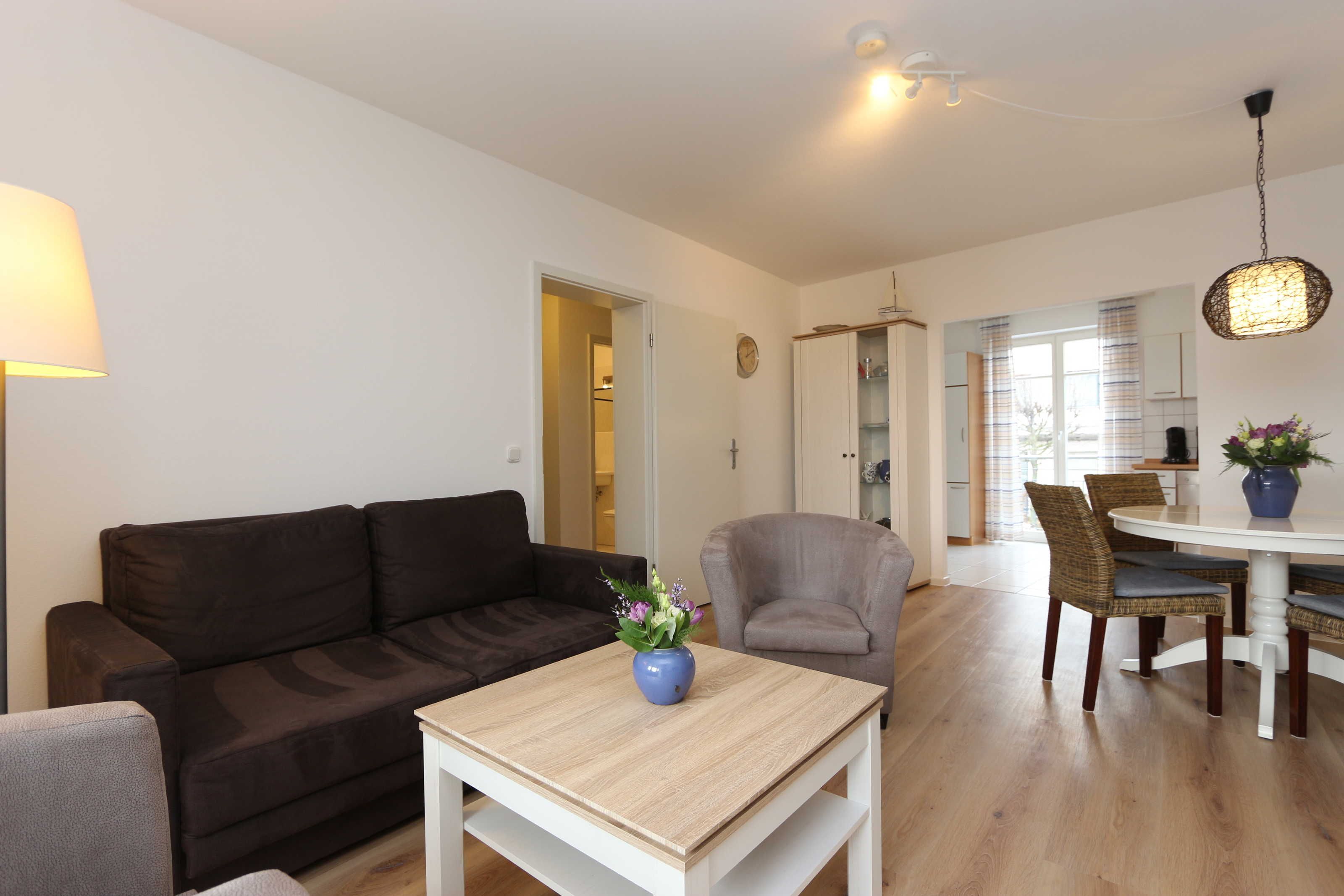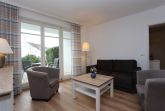 • Wohn- und Esszimmer eingerichtet mit Schlafsofa (ca. 140 x 195 cm) und Sessel, Essecke im Wohnzimmer, Zugang zur Terrasse;